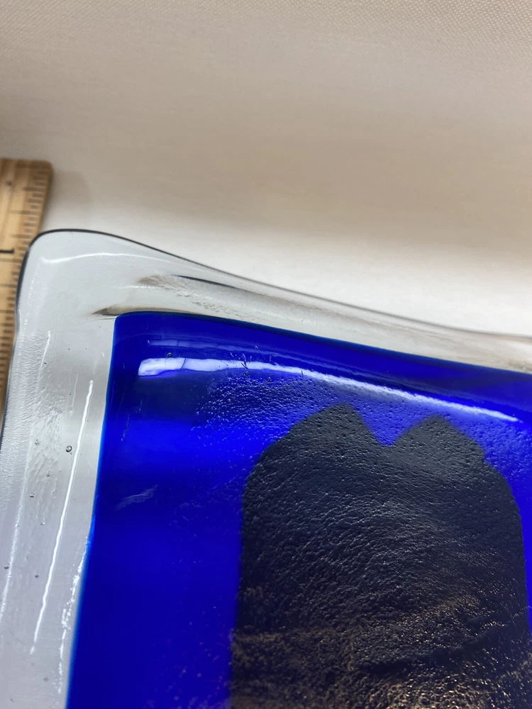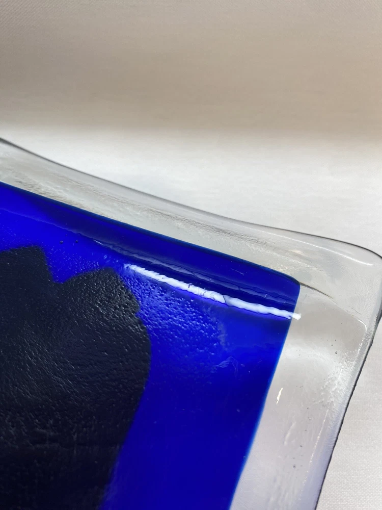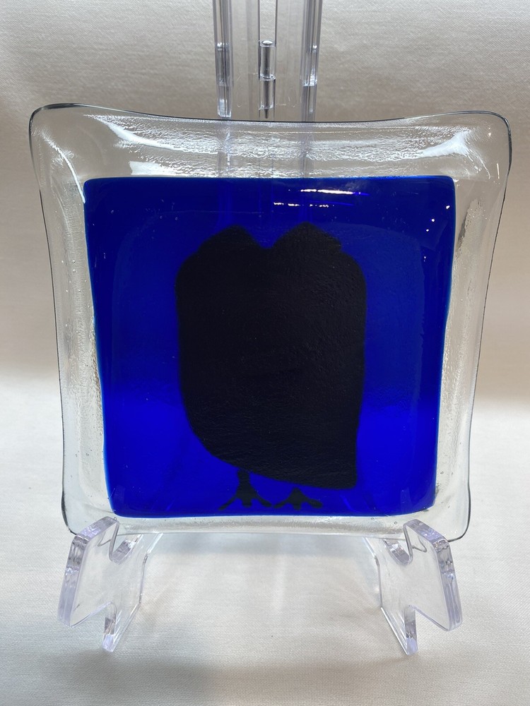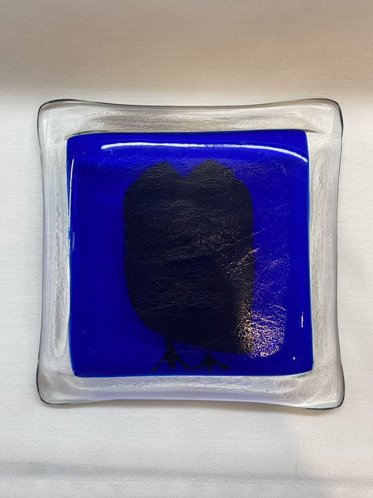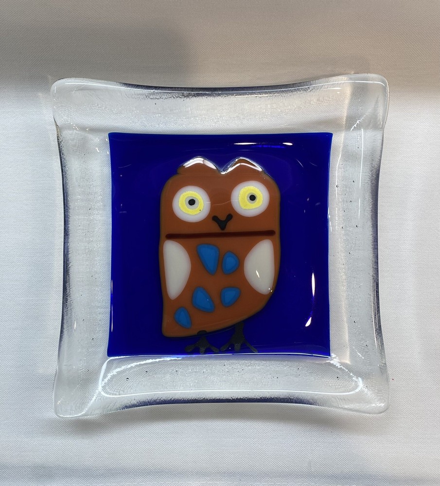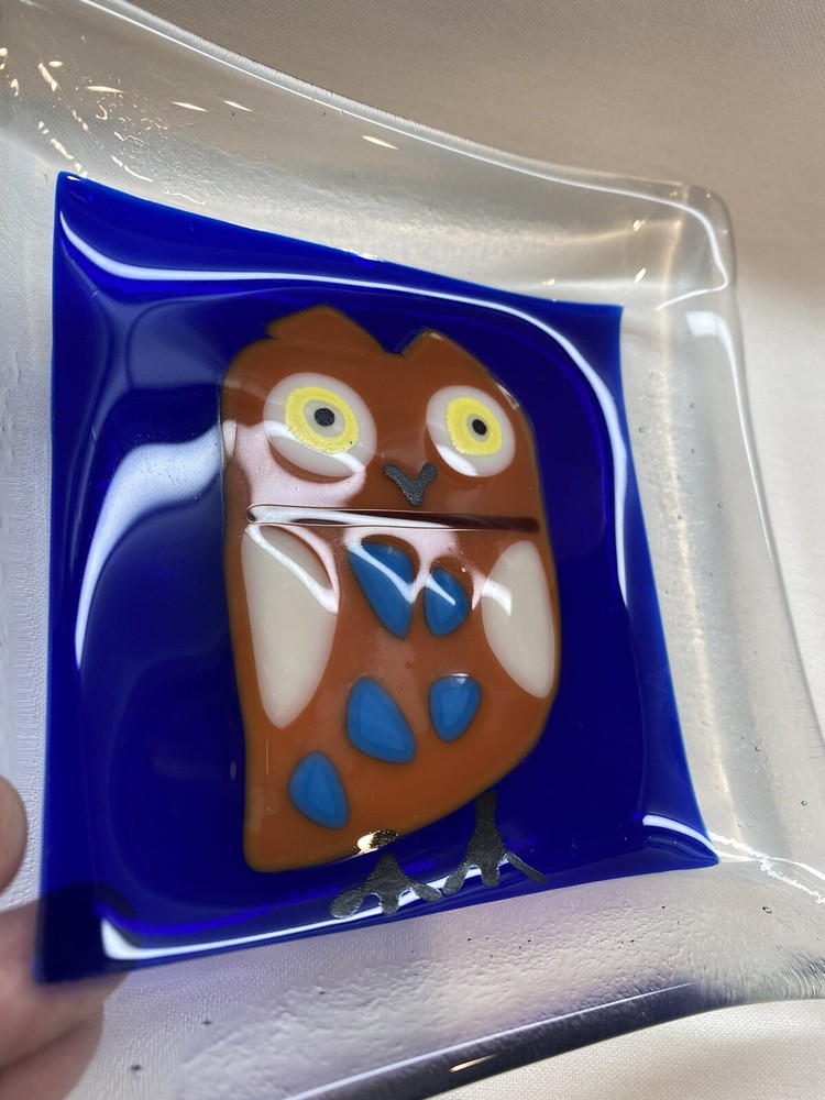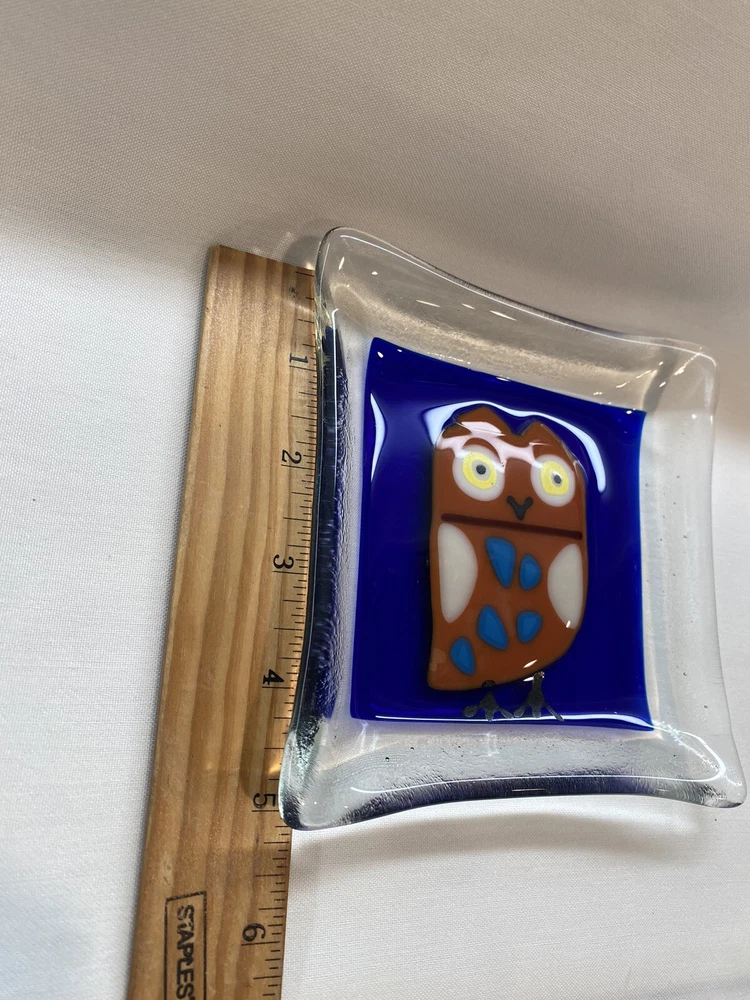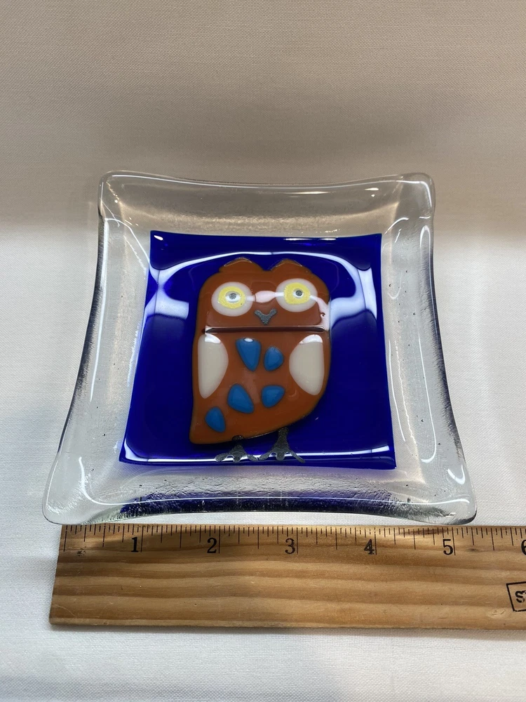 This fused art glass trinket dish is very well made and has some very nice colors and details. Appears to have some glazed-on accents to the eyes, beak and legs. The rich cobalt blue background brings out the colors of this cute owl. I do not see a signature. However the quality and thickness is substantial. It is studio art glass and handmade. Truly a one-of-a-kind piece. Approximate measurements 5 1/8” X 5 1/8“. Also has an approximate 1” raised lip. Condition: No chips, cracks, or scratches on front surface. There are a few very tiny scratches on the bottom from where it sat and made contact. Nothing that affects the beauty of this piece. Ask me any questions:) Please review all pictures provided.