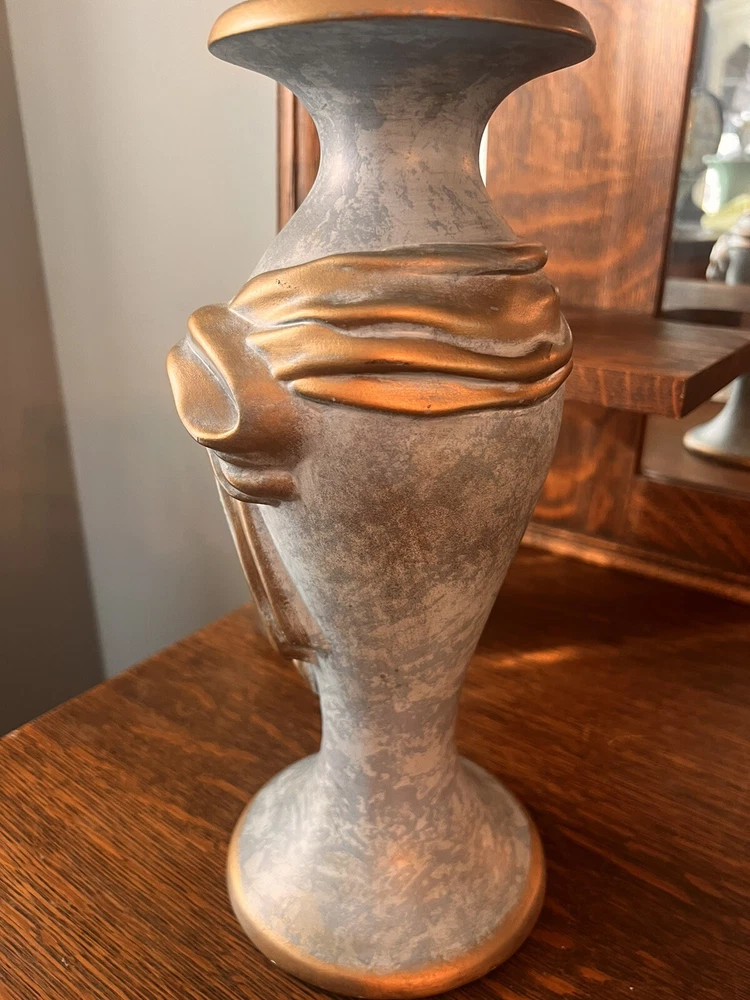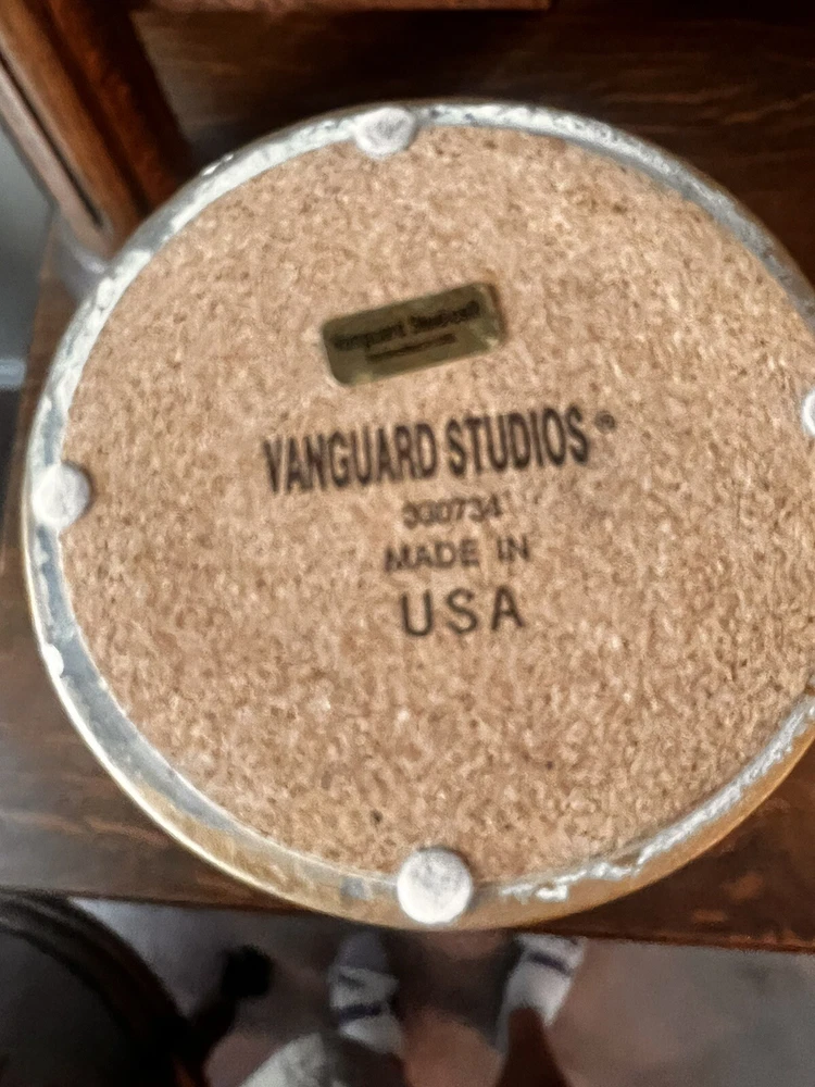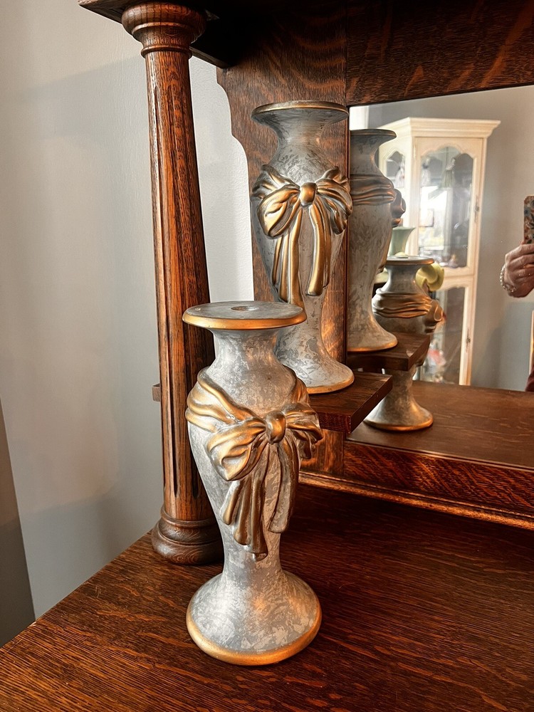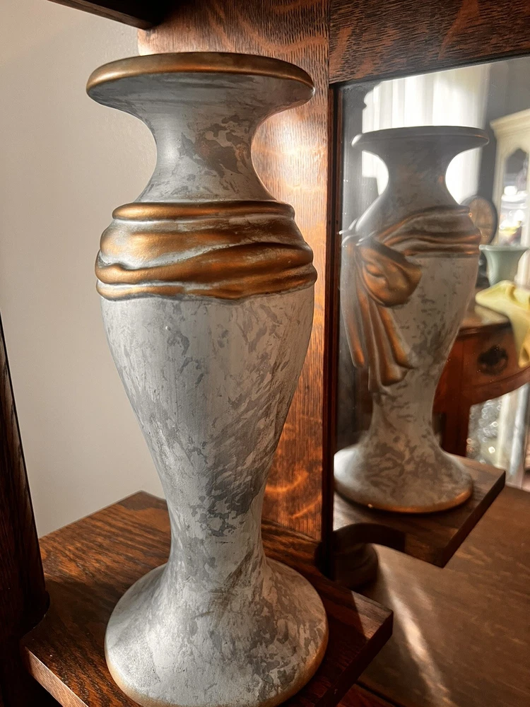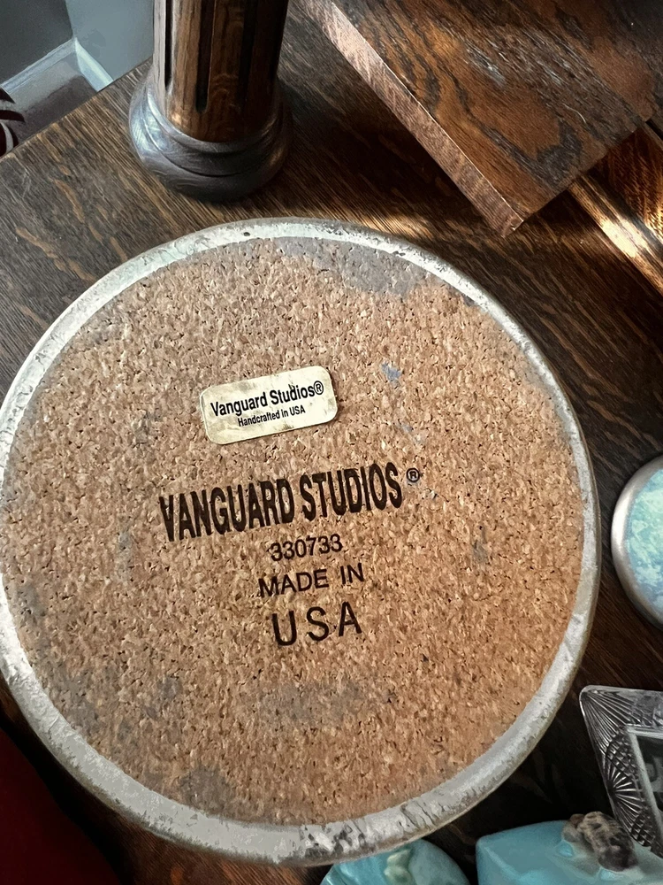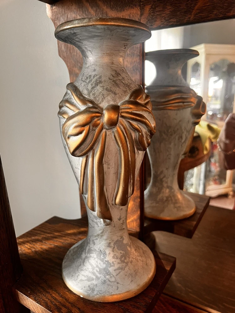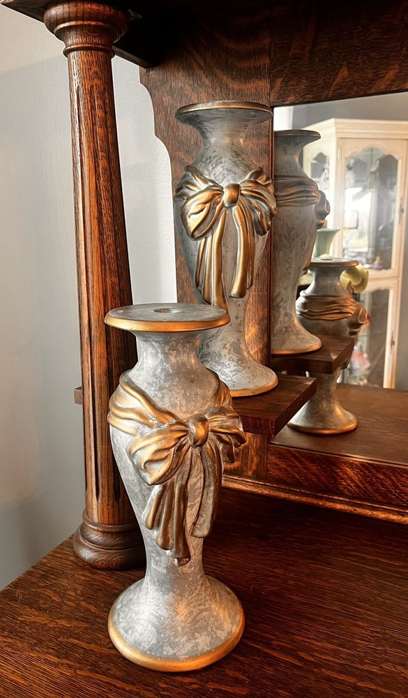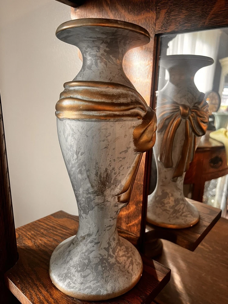 These absolutely stunning RARE elegant set of candlesticks from Vanguard Studios are made in an intricate design that features a smooth pear shape that’s draped and then ribbon tied in gold accents that gives it a luxurious feel that are made of high-quality ceramic. They look and feel like high quality pieces. These candlestick holders are gorgeous and add a sense of elegance to any room. The pictures do not do the candlesticks justice. You are not able to truly see the bluish, turquoise, and highlights of gray come through the pictures. On one of candlesticks there is a very minor loss of black paint at the bottom. The other has manufacture mold issue but, is not seen when candlesticks are placed. Both candlesticks bear the Vanguard Studio cork bottom which is stamped with the Vanguard Studios made in the USA. There is also a paper label that states Vanguard Studios Manufactured USA. Please re to all my pictures as they are part of the description.