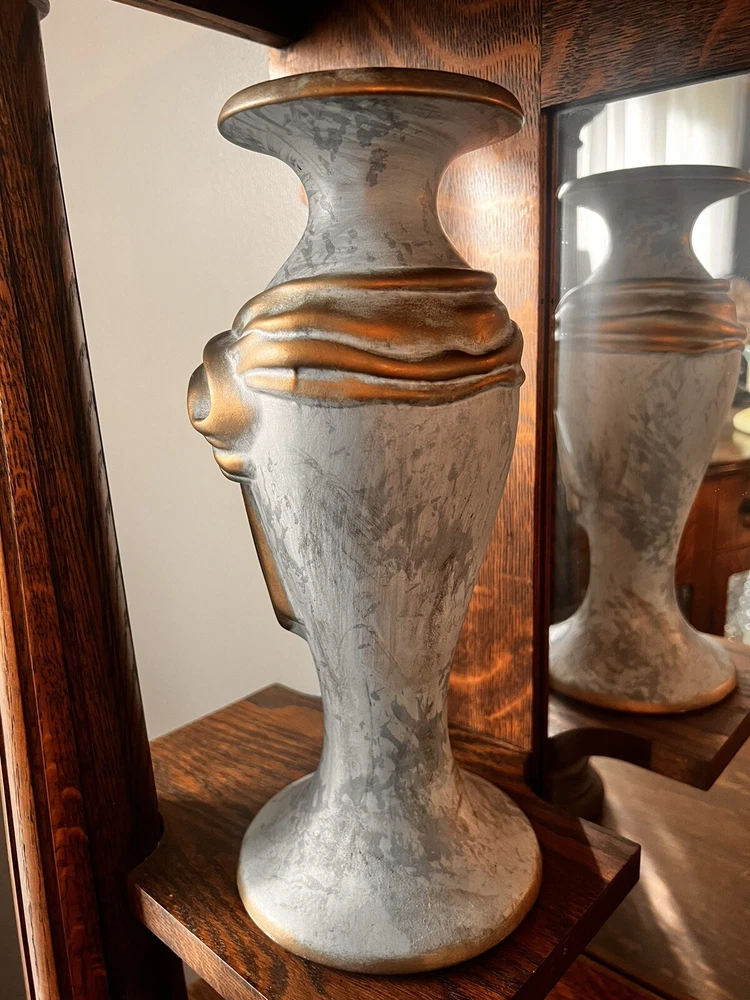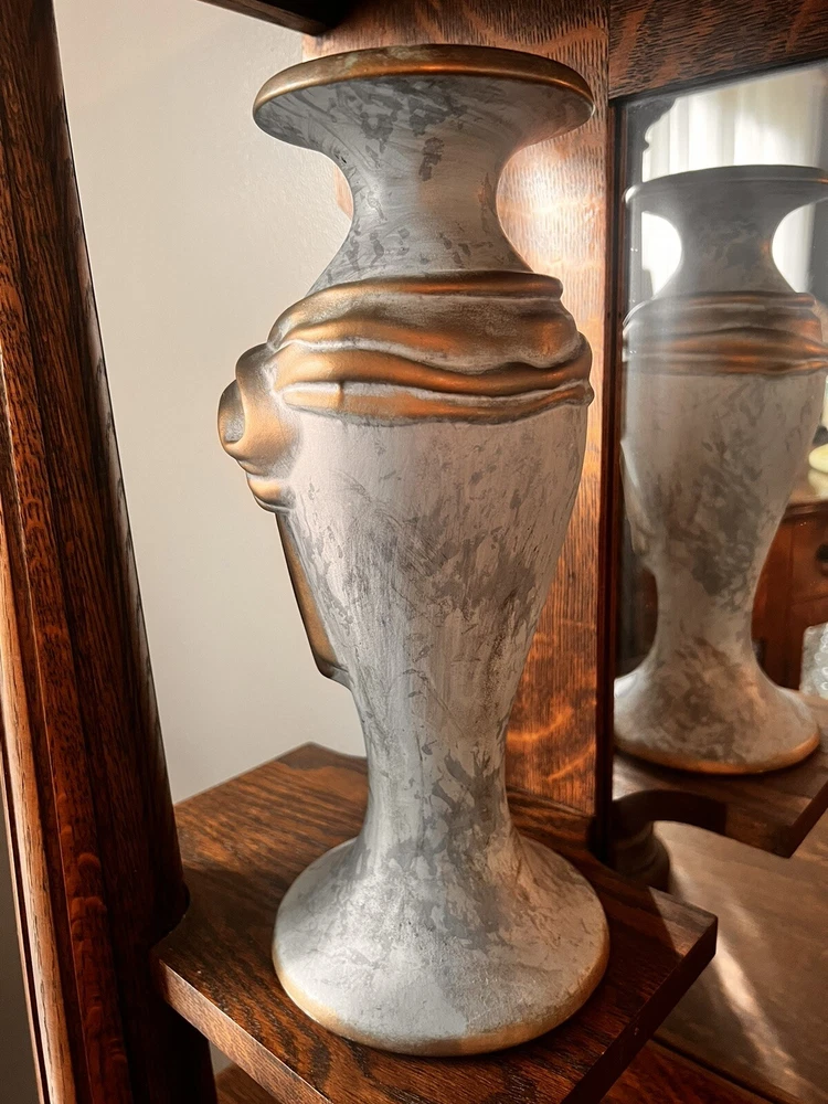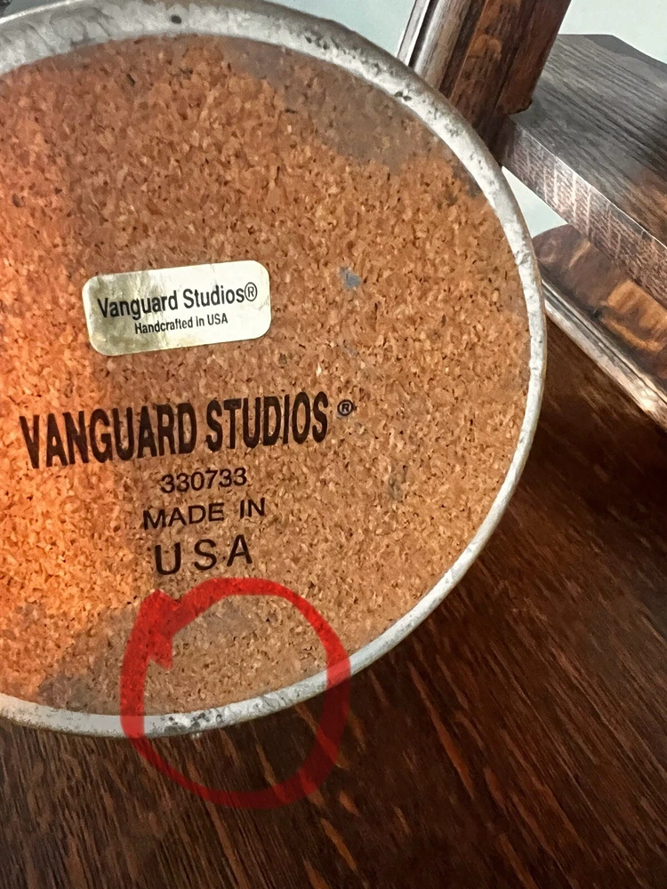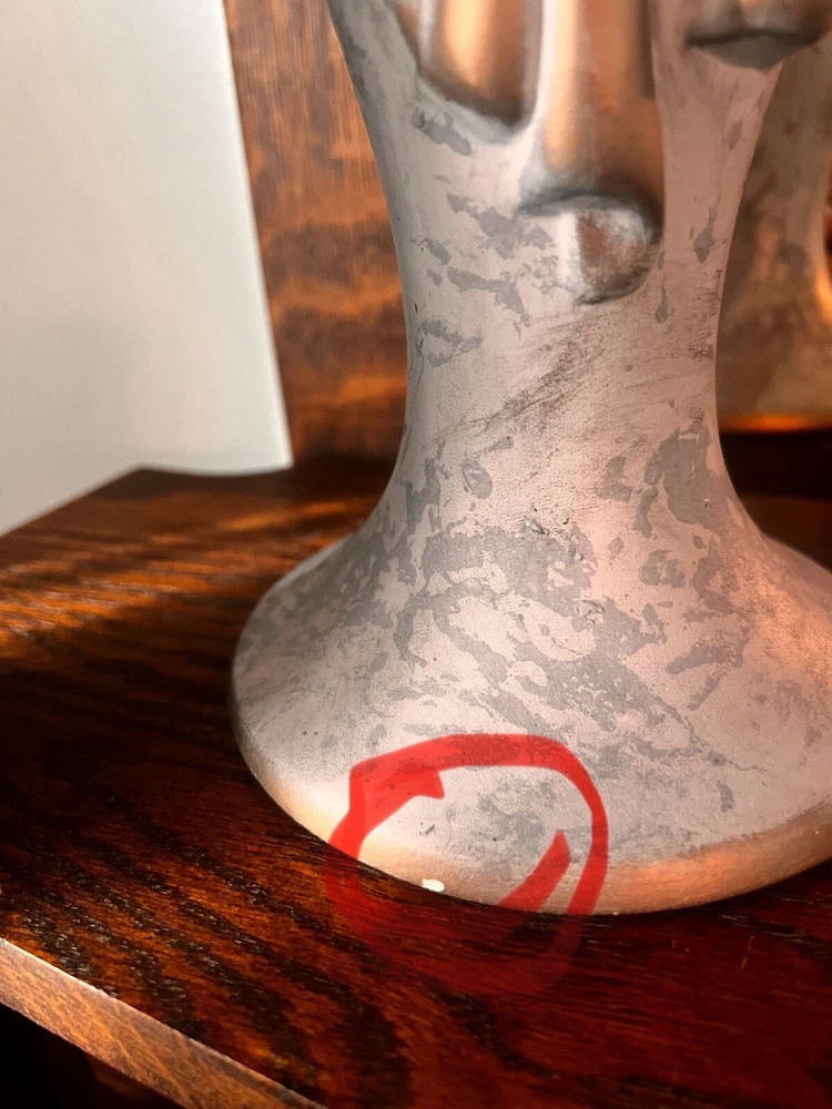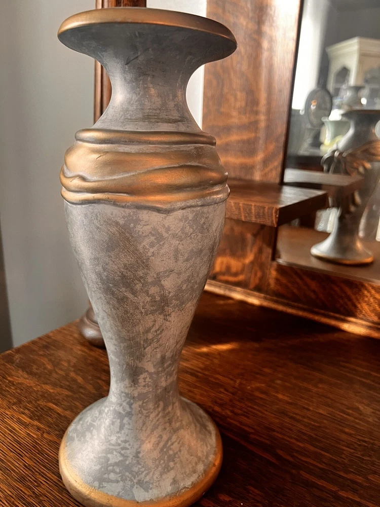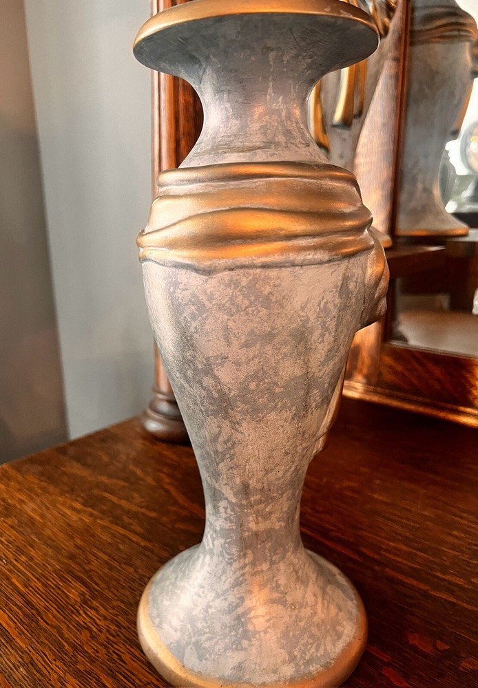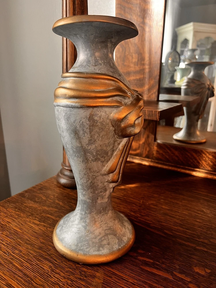 These absolutely stunning RARE elegant set of candlesticks from Vanguard Studios are made in an intricate design that features a smooth pear shape that’s draped and then ribbon tied in gold accents that gives it a luxurious feel that are made of high-quality ceramic. They look and feel like high quality pieces. These candlestick holders are gorgeous and add a sense of elegance to any room. The pictures do not do the candlesticks justice. You are not able to truly see the bluish, turquoise, and highlights of gray come through the pictures. On one of candlesticks there is a very minor loss of black paint at the bottom. The other has manufacture mold issue but, is not seen when candlesticks are placed. Both candlesticks bear the Vanguard Studio cork bottom which is stamped with the Vanguard Studios made in the USA. There is also a paper label that states Vanguard Studios Manufactured USA. Please re to all my pictures as they are part of the description.