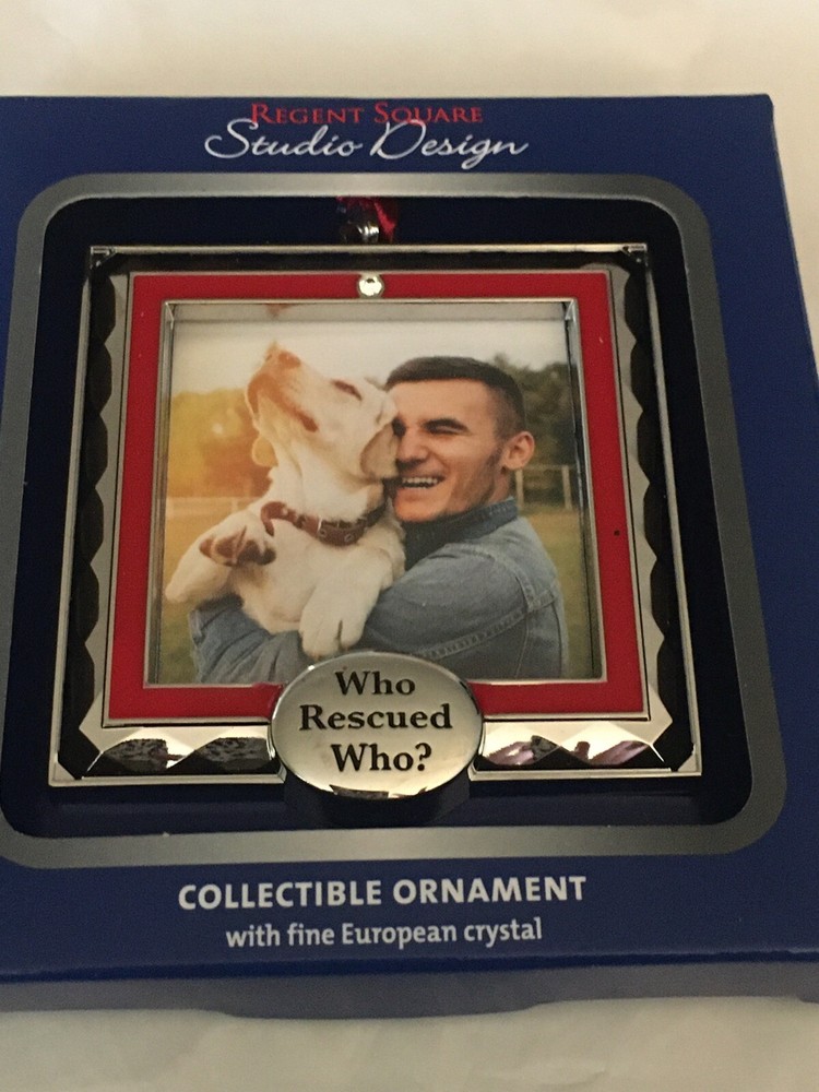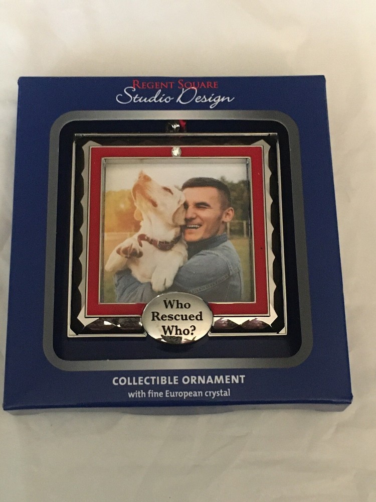 You are looking at a very unique ornament. It Is a square frame, it has the words “ WHO RESCUED WHO? ” in a circle at the bottom. The ornament is also adorned with a crystal at the top . Too cute! Please note: This ornament is BRAND NEW and has never been used. However, the box has some bending from storage. **Shipping & handling: US standard shipping is FREE! There is a 1 business day handling time on all items after payment is received. Shipping will be via USPS economy mail, which usually arrives in 1-7 business days. Item will also be shipped with delivery confirmation. If you need this item sooner- feel free to message us to make arrangements for faster shipping at an additional charge. Box X43B<