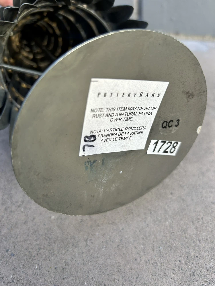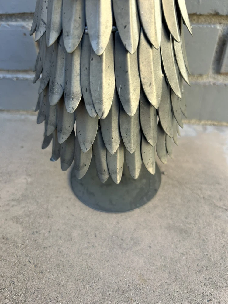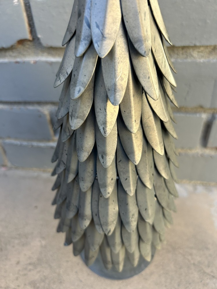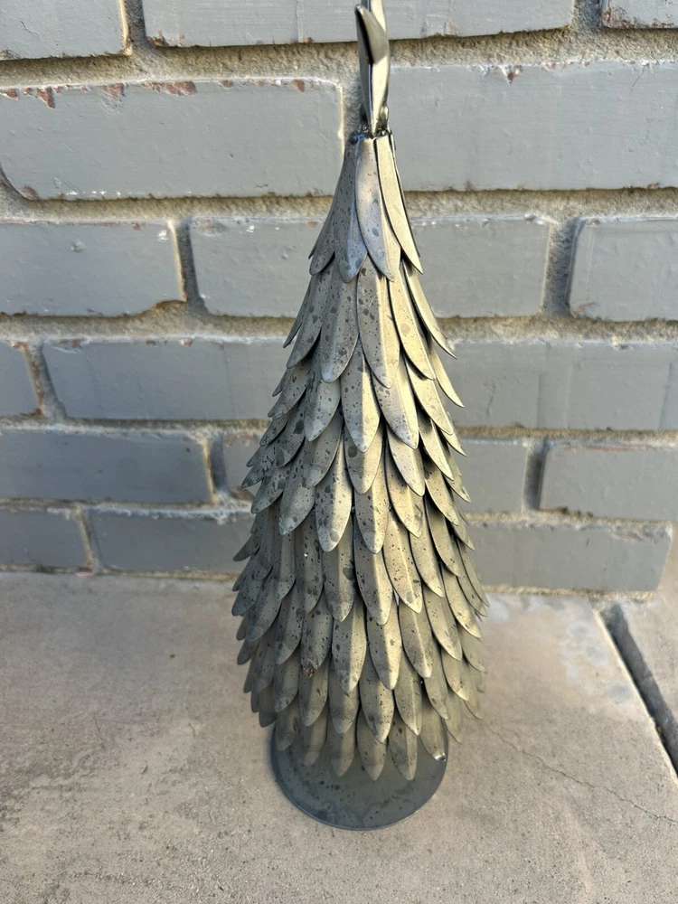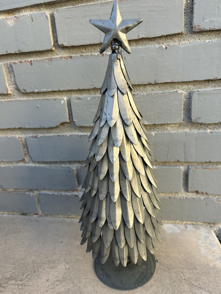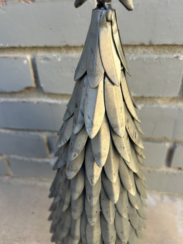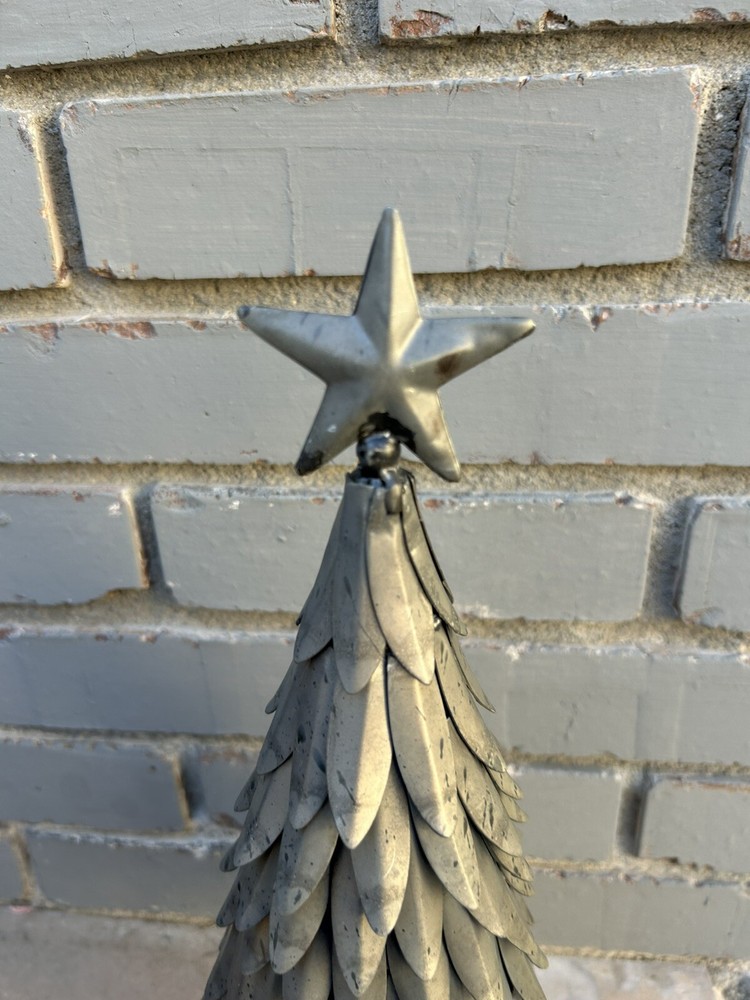 This is a retired Pottery Barn Silver Metal Galvanized Christmas Holiday Tree with a star topper, measuring 15 inches in height and 5 inches in width. The tabletop decor features a winter theme with stars and is made of metal. Ideal for adding a festive touch to your Christmas decorations.