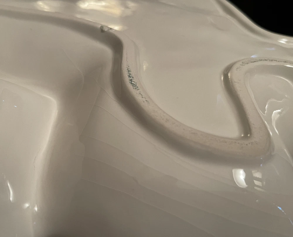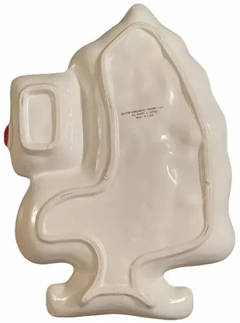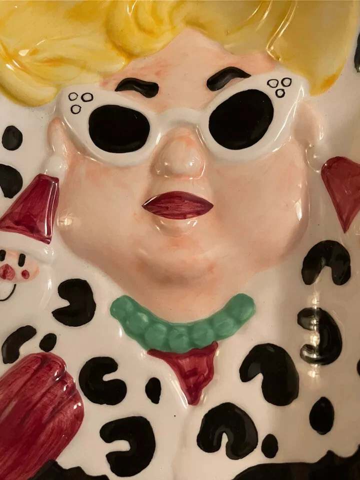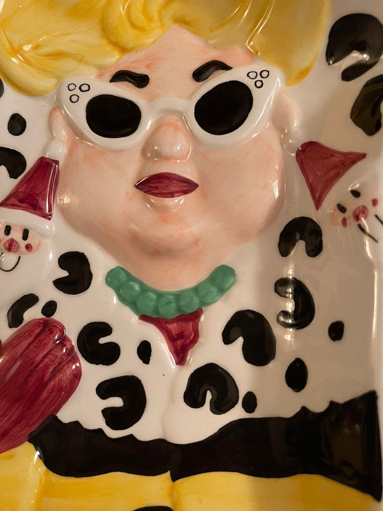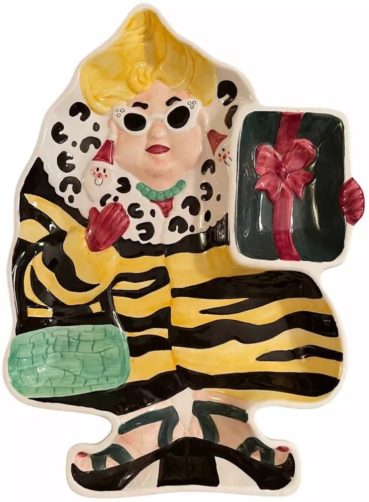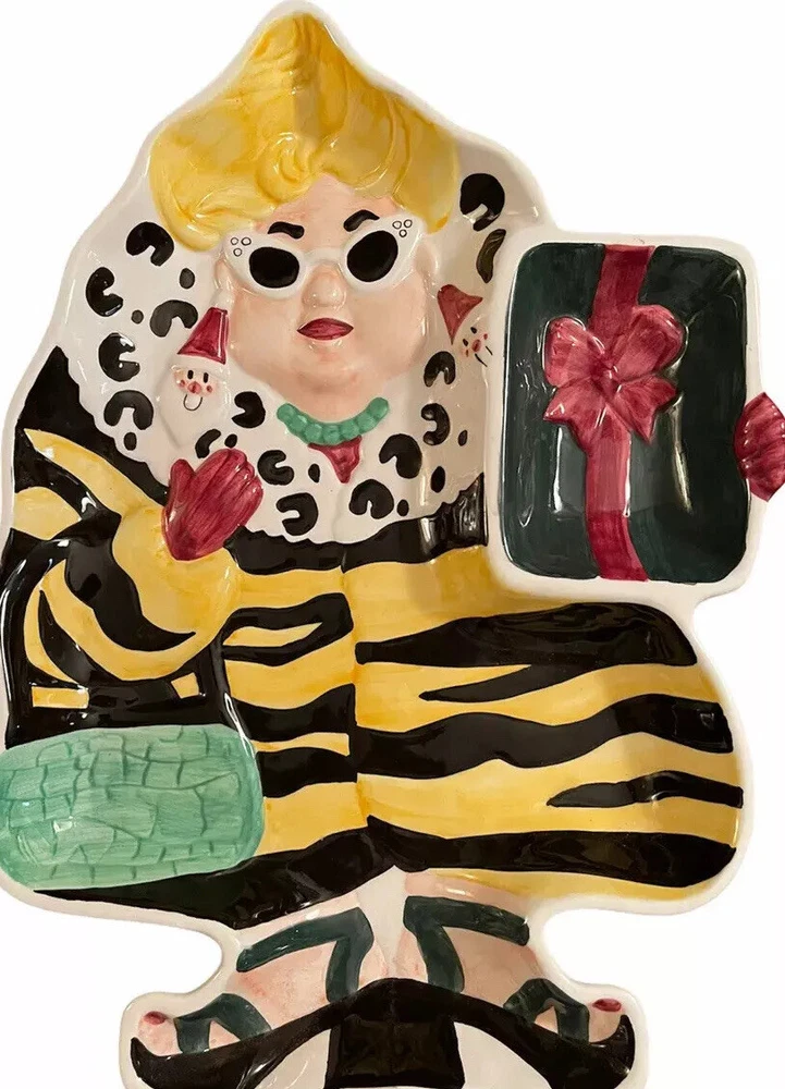 UNIQUE APPETIZER OR GOODIES TRAY ZANY BLONDE WOMAN CHRISTMAS SHOPPER ANIMAL PRINT COAT HEAVY CERAMIC VEGGIES, SNACKS & DIP, GOODIES This vintage Christmas tray has to be seen to be believed! She’s so fun! Blonde woman shopper with white cat-eye sunglasses, a gift on one arm, purse on the other, wearing outrageously large Santa earrings, a unique animal print yellow and black coat, and black sandals with her toes painted red. 16.5 x 12 inches and an inch to 1.5 inches deep on sloping sides. She’s heavy, about 4 pounds. The dish has a separated dip holder. The woman’s features are 3D and embossed. This estate sale find is quite unique, rare and hard to find. What a conversation starter sure to bring a smile to your guests! No chips, cracks or repairs. Some crazing on back. Three small spots that look and feel to be divots where ceramic tray was originally fired in kiln. Shipped, double boxed, via UPS Ground Advantage LR shelf