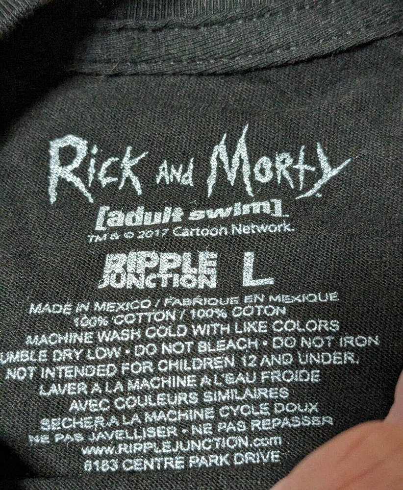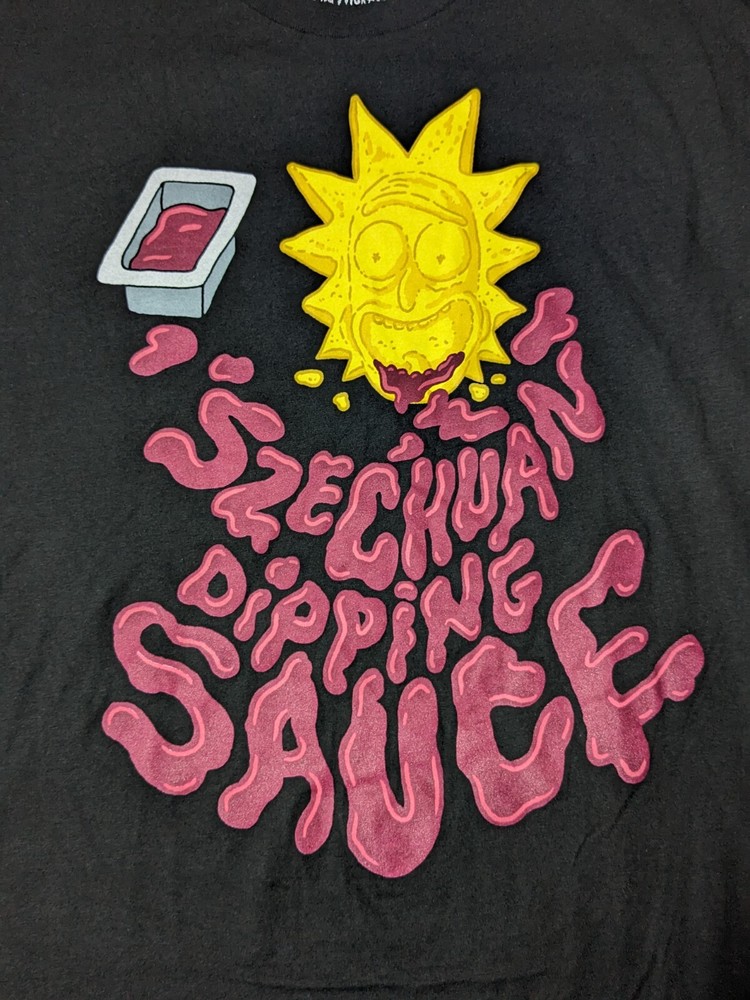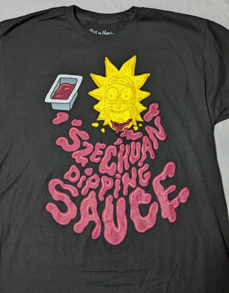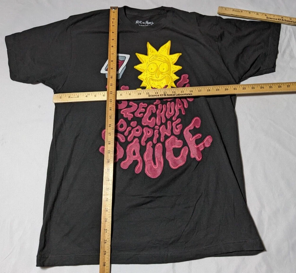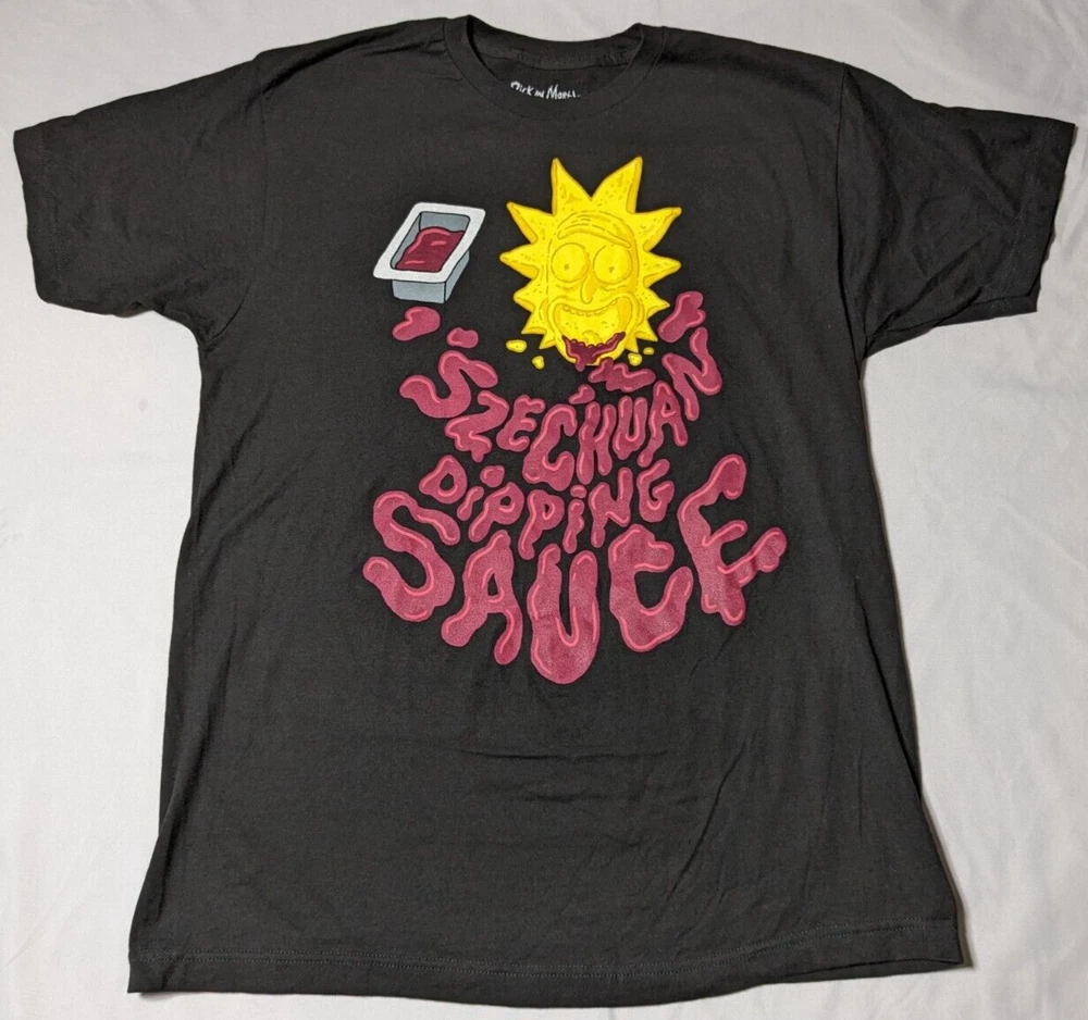 RICK AND MORTY Men Large Black Cotton Szechuan Dipping Sauce Graphic T-Shirt In Great Pre-owned Condition with no major flaws, as pictured. Please see image of material tag for fabric makeup. Please see photos, read description for item condition, and check measurements for size. Please note that manufacturers may have different measurements for their sizes, so please check my measurements to ensure item will fit. 17803