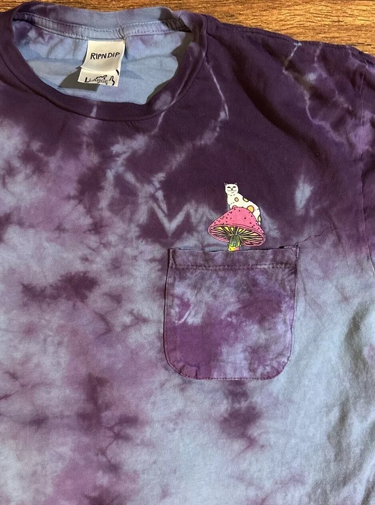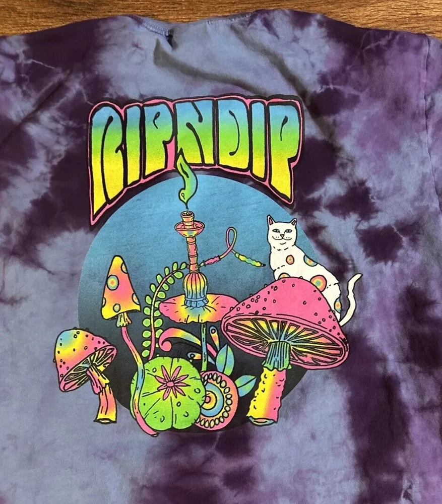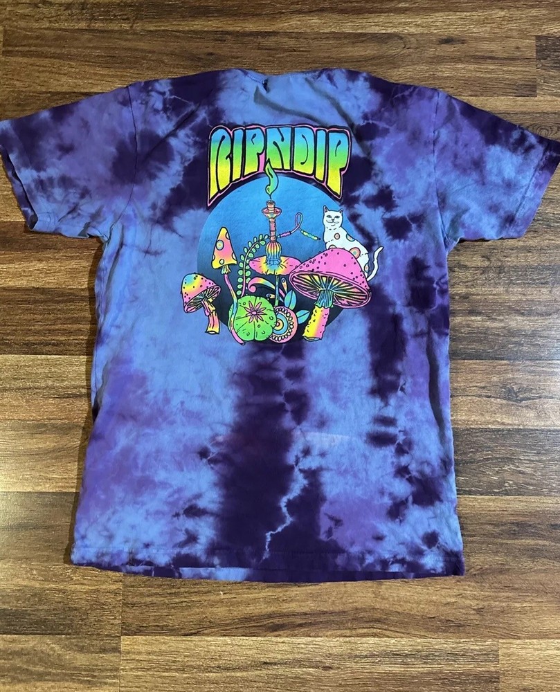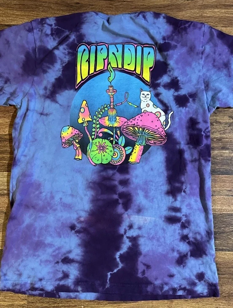 Elevate your wardrobe with the stylish RIP N DIP COSMIC MUSHROOM GRAPHIC TIE DYE POCKET TSHIRT. Made from high-quality cotton material, this short-sleeved crew neck t-shirt is perfect for any casual occasion. The unique multicolor tie-dye design and eye-catching graphic of a cosmic mushroom make this shirt a must-have for any skater or fashion-forward individual. This regular fit t-shirt is available in size men's large and features convenient pockets for added functionality. Whether you're running errands or hitting the skate park, this RIPNDIP branded t-shirt is sure to turn heads. Don't miss out on the opportunity to add this awesome shirt to your collection.