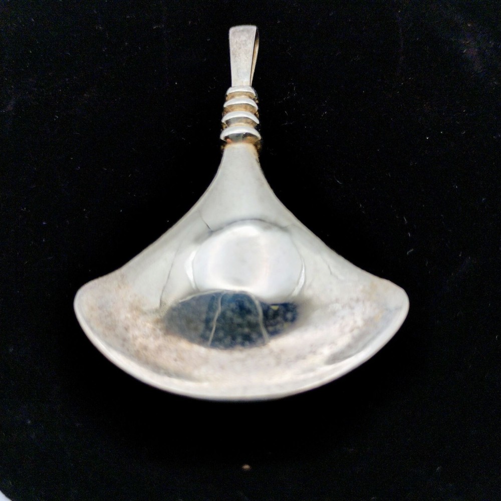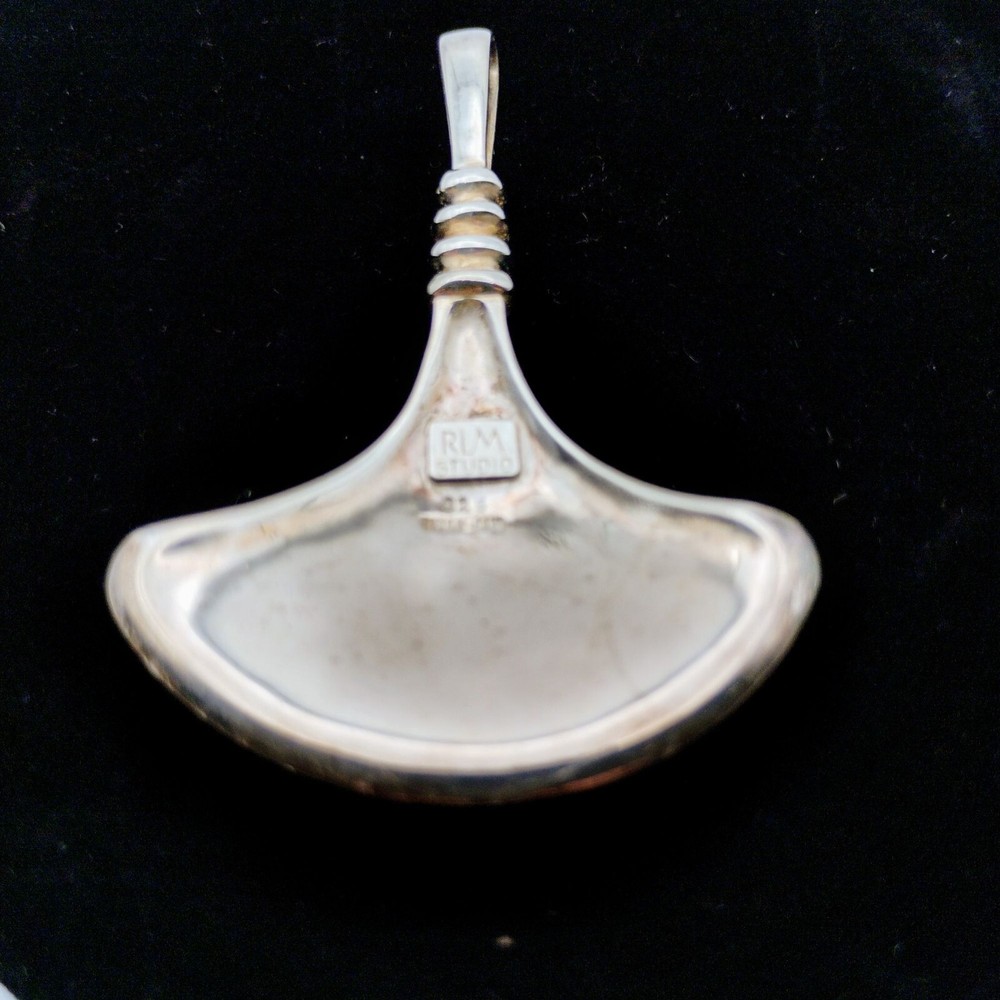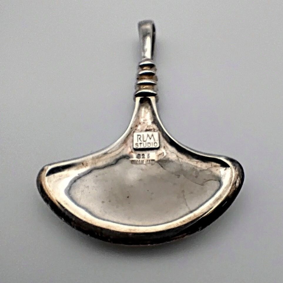 Elevate your jewelry collection with the RLM Studio 925 Sterling Silver pendant. This fan-shaped piece adds a touch of sophistication to any ensemble. Its unique design and quality craftsmanship make it an ideal choice for those who appreciate fine jewelry. • Fan-shaped pendant • Crafted from 925 sterling silver • Stamped with RLM Studio mark-Robert Lee Morris • Measures 2 1/8 inches • Made in Thailand Minor surface scratches present. Jewelry: we do our best to identify and authenticate jewelry, however, we are not experts. We identify markings, we test gems with a presidium gem tester, but we do not acid test metals. We do not polish jewelry so you can choose the vintage look. All our jewelry is estate jewelry. Please feel free to ask for more photos or information if needed! All of our items come from estates we are liquidating. We often have full collections - please feel free to contact us if you are looking for something specific. Generally, our items have had one owner, and items were purchased when they were originally made, and frequently items have been passed down through several generations.Jewelry: we do our best to identify and authenticate jewelry, however, we are not experts. We identify markings, we test gems with a presidium gem tester, but we do not acid test metals. We do not polish jewelry so you can choose the vintage look. All our jewelry is estate jewelry. Please feel free to ask for more photos or information if needed!