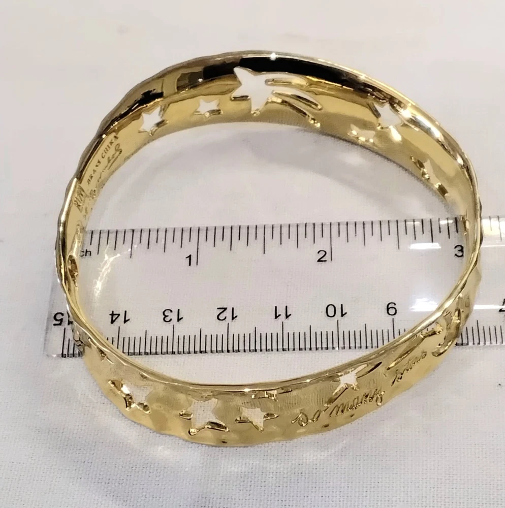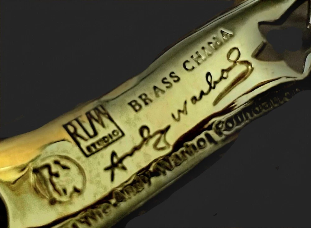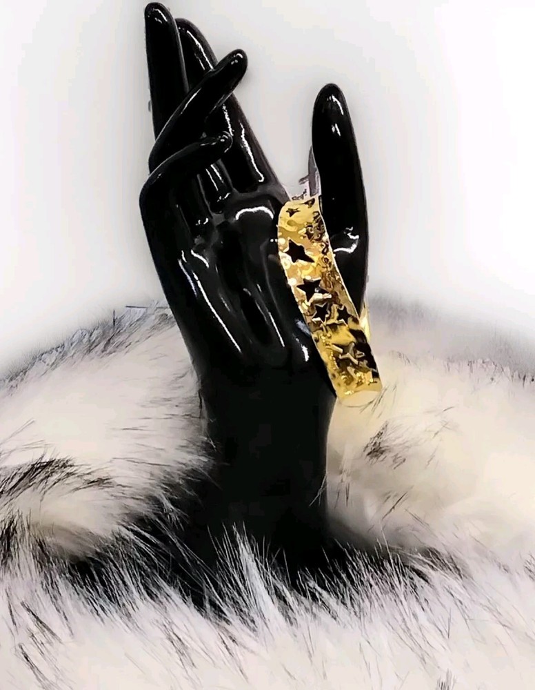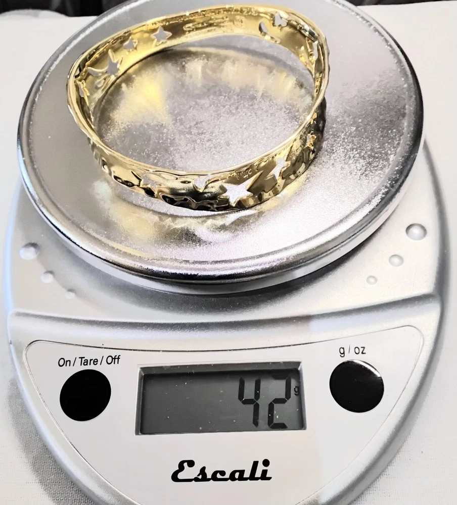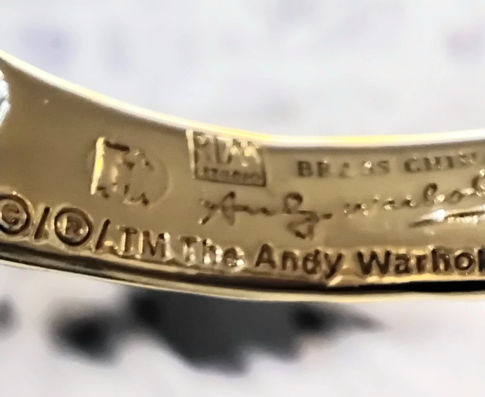 This RLM Studio & Andy Warhol Brass Bracelet features a round bangle shape with a starry beauty design. Made of 100% brass, it is gold in color and is signed by the RLM Studio China. The bracelet is 9.5" around and weighs 42gms. The design is inspired by Andy Warhol's SO MANY STARS collection, making it a unique and stylish piece for all occasions. These bracelets are far and few in-between and are a pleasure to own and ware. Please see photos for additional measurements, ask any questions you might have, and thank you for shopping my site. 😊