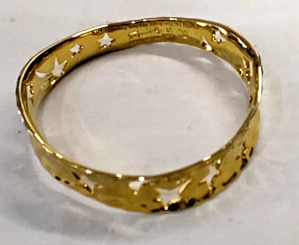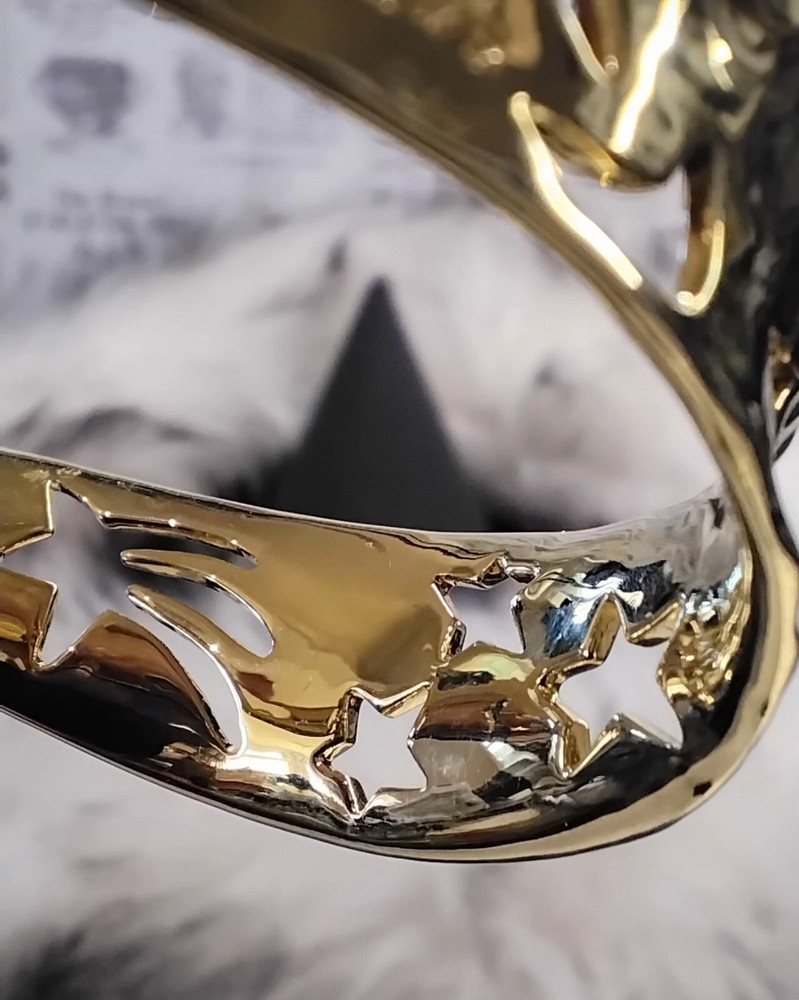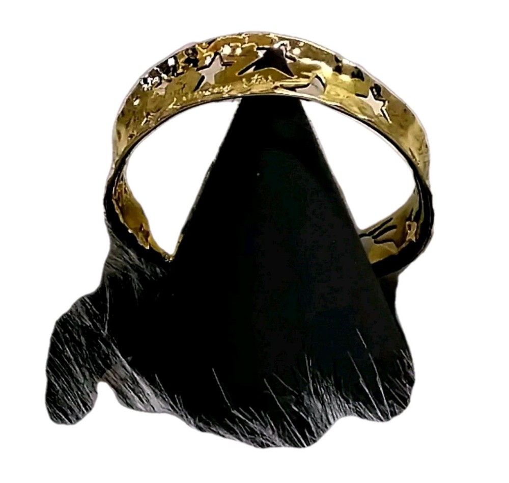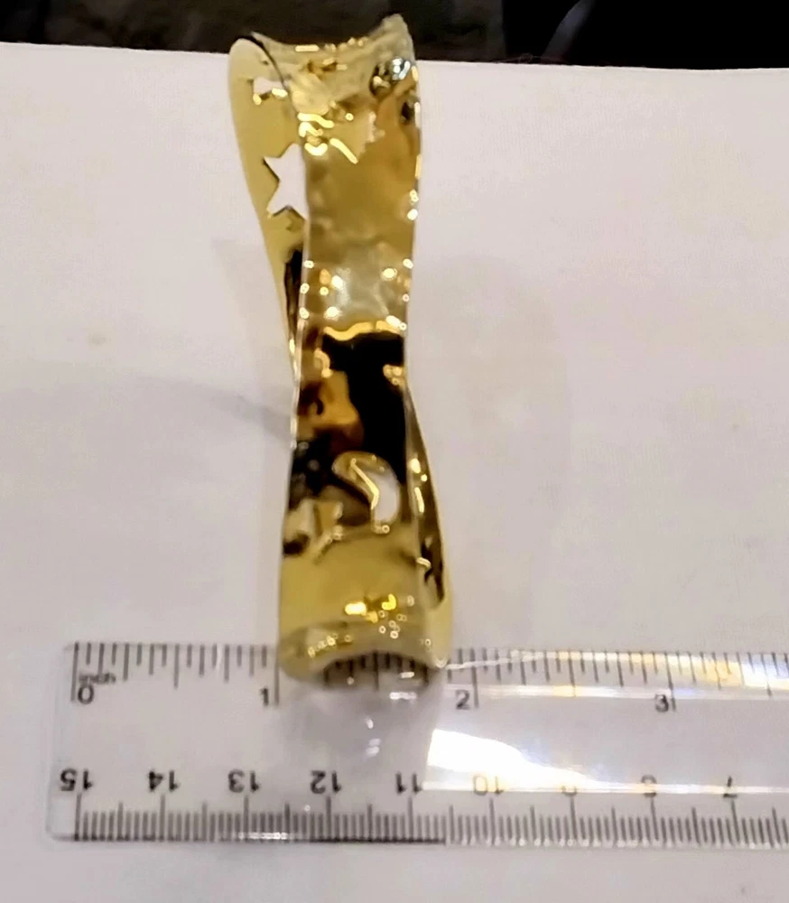 This RLM Studio & Andy Warhol Brass Bracelet features a round bangle shape with a starry beauty design. Made of 100% brass, it is gold in color and is signed by the RLM Studio China. The bracelet is 9.5" around and weighs 42gms. The design is inspired by Andy Warhol's SO MANY STARS collection, making it a unique and stylish piece for all occasions. These bracelets are far and few in-between and are a pleasure to own and ware. Please see photos for additional measurements, ask any questions you might have, and thank you for shopping my site. 😊