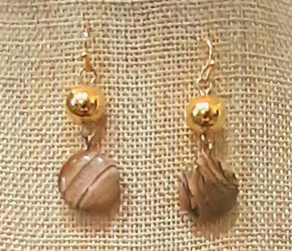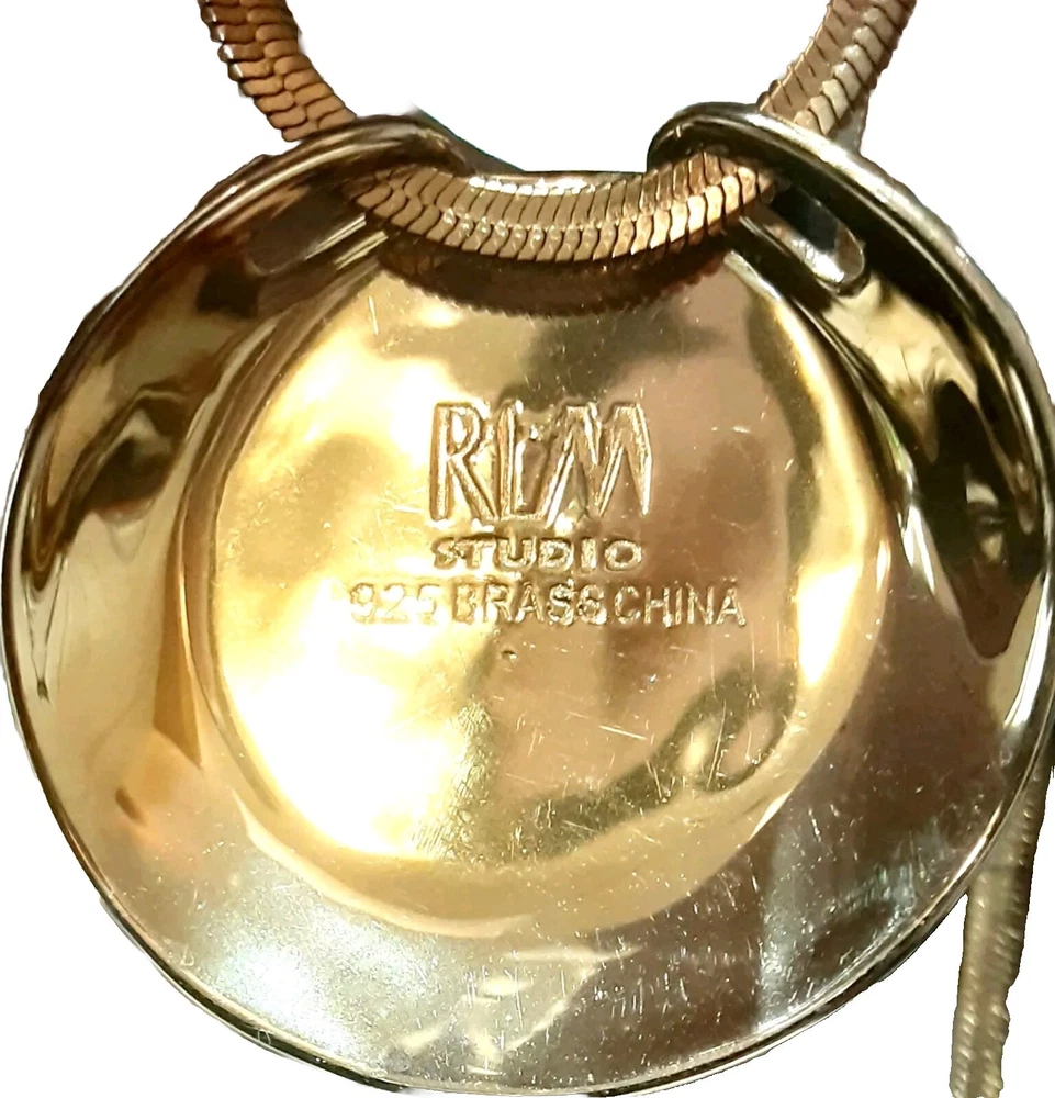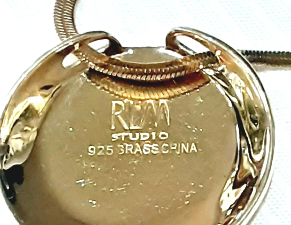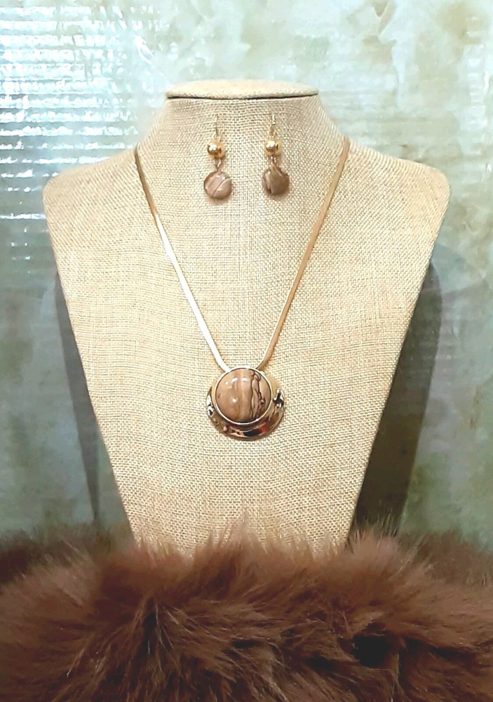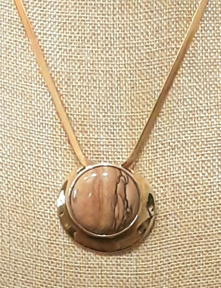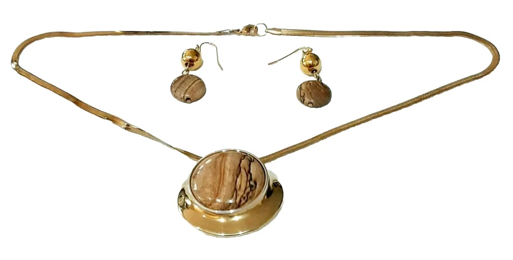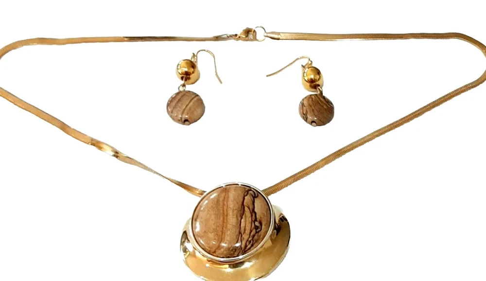 This beautiful necklace and earring set from RLM Studio features a round Wood-Grain Jasper stone pendant and matching earrings. The pendant is 1.5" wide and set in a sterling silver and brass bezel and hangs from a 9" long gold-tone chain, while the earrings dangle 1.5" long with french hooks. The necklace has a lobseter closure. The set is made of sterling silver and brass, and includes three gemstones total: the necklace one and two in the earrings. The earrings can be converted to clip-on at no extra cost to you, just ask me when you purchase the set. Perfect for an engagement, anniversary, or birthdays, this necklace and earring set is a stunning addition to any jewelry collection. The flat 1/8" wide gold-tone herringbone chain adds a touch of elegance, while the natural jasper stones bring a unique and earthy feel. Signed by RLM Studio, this set is sure to impress. Please see photos for additional measurements, ask any questions you might have and thank you for shopping my site. 😊