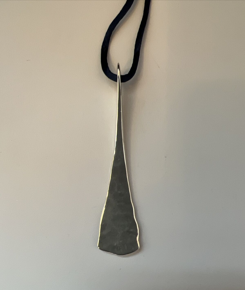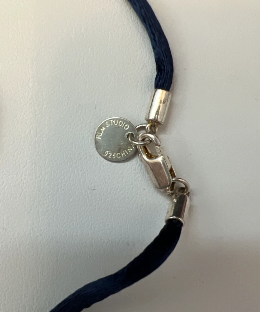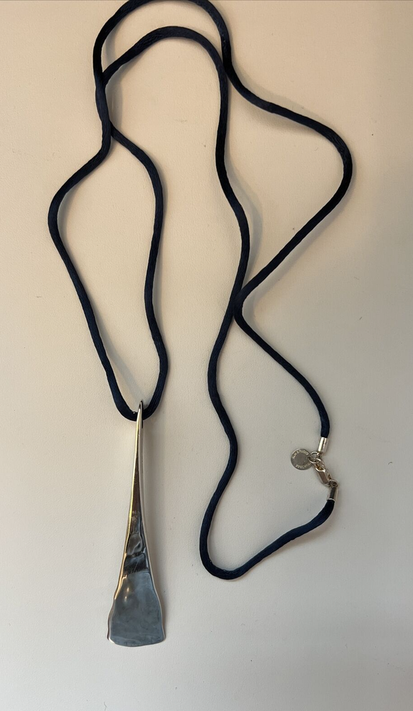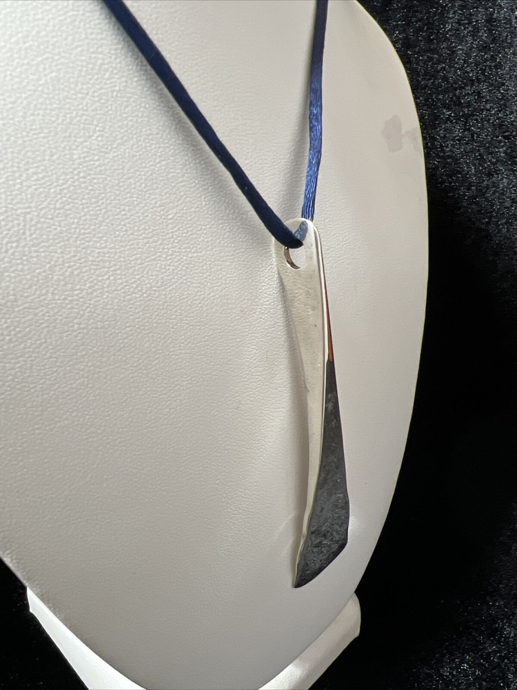 RLM Studio Robert Lee Morris Sterling Hammered Modern Wedge Pendant Necklace This is a stunning Robert Lee Morris / RLM STUDIO sterling silver hammered wedge pendant. Measuring 3 1/2" long x 7/8" wide x 1/4" in depth and weighing 23.9 grams. The pendant is marked 925 China RLM STUDIO. The navy blue silk chain has sterling silver tips and clasp with a hanging tag that says RLM STUDIO RLM CHINA. This is a stunning Modernist hammered sterling silver pendant on a long navy blue silk chain that looks fantastic on! Excellent pre-owned condition. No dings, dents or repairs. The navy blue silk chain is nice and clean and the lobster clasp is in good working order. Enlarge photos to see details. Free shipping to anywhere in the continental USA. Buy with confidence, 100% satisfaction guarantee. Thank you for your interest. Sterling Silver Box 6