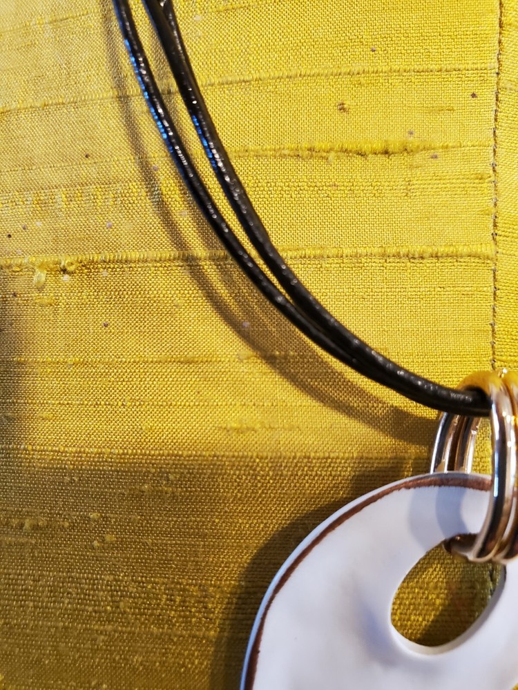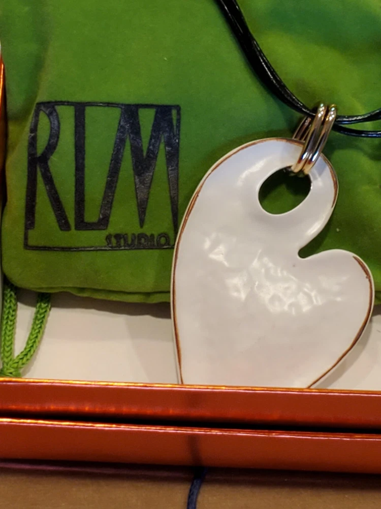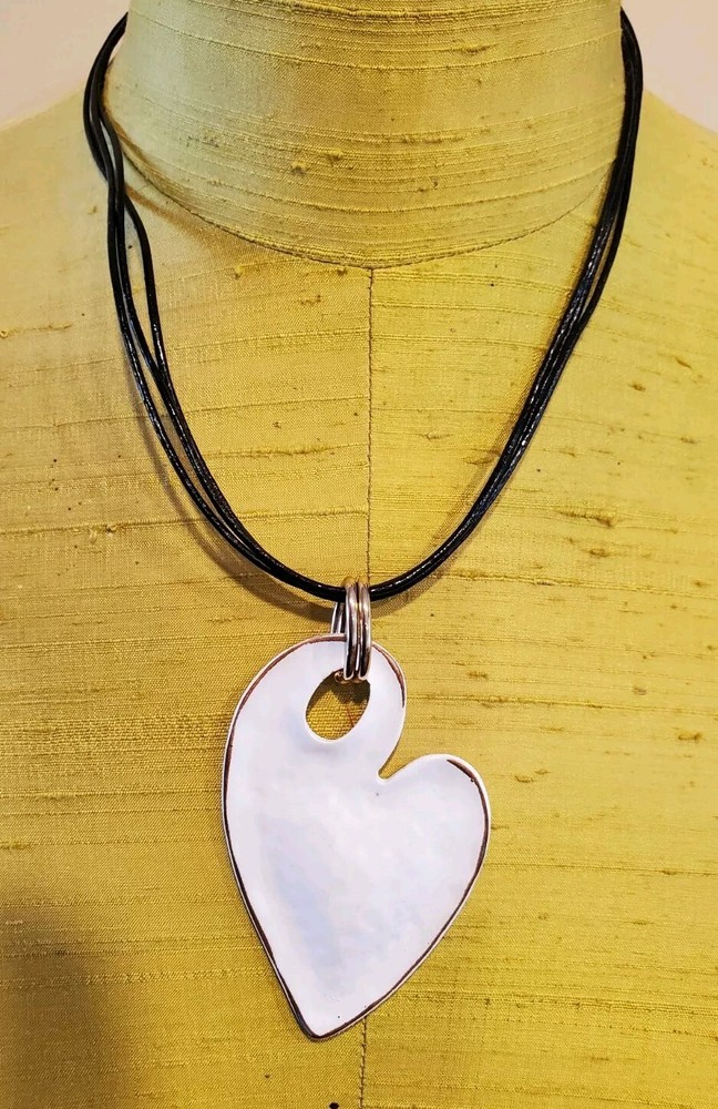 This Robert Lee Morris (RLM) Studio necklace is a modernist piece that features a white enamel heart-shaped pendant with a lobster closure. The necklace is 18 inches long and comes with its original box/velvet pouch & booklet. The necklace is signed by the designer and is a perfect expression of love and contemporary style. The pendant shape is a classic symbol of love and the white enamel adds a touch of elegance to any outfit. Comes with a double black cord necklace with goldtone accents. The necklace is a must-have for any fashion jewelry collection. +++FREE SHIPPING INCLUDED +++