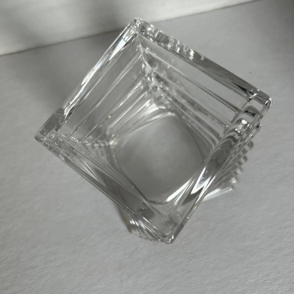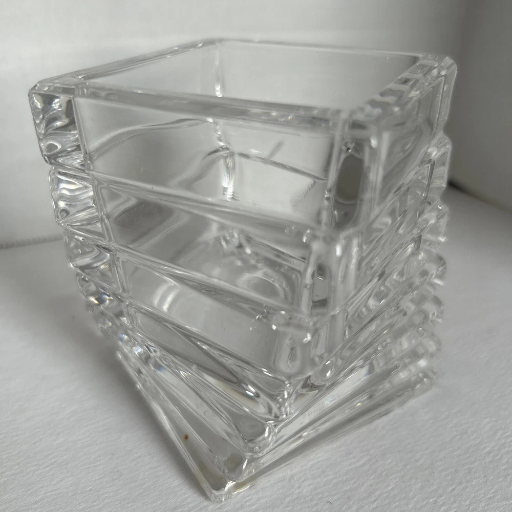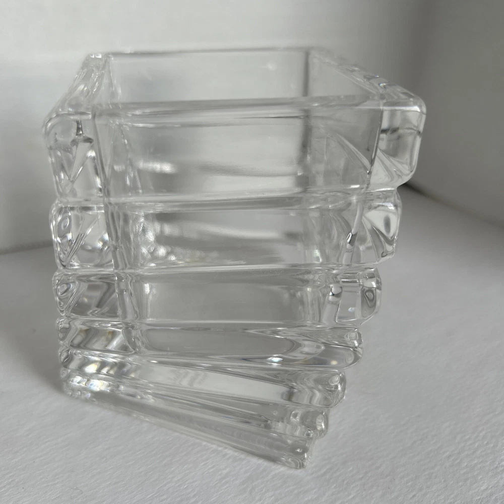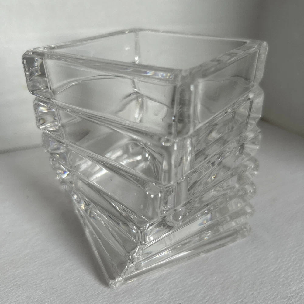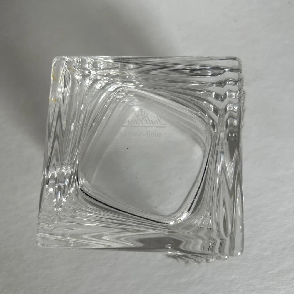 This is a Rosenthal Studio-Linie Crystal Turnus Votive Candle Holder, made in Germany. It is a contemporary style candle holder made of clear crystal with a shiny finish. The candle holder is 4 inches long, 4 inches wide, and 3.5 inches tall. It features the Turnus pattern and Regency character, and is suitable for use in any room. The candle holder is signed and is an original piece. It can be cleaned with warm water and is suitable for use on furniture. No cracks or chips lovely artistic crystal holder for mood lighting. See photos