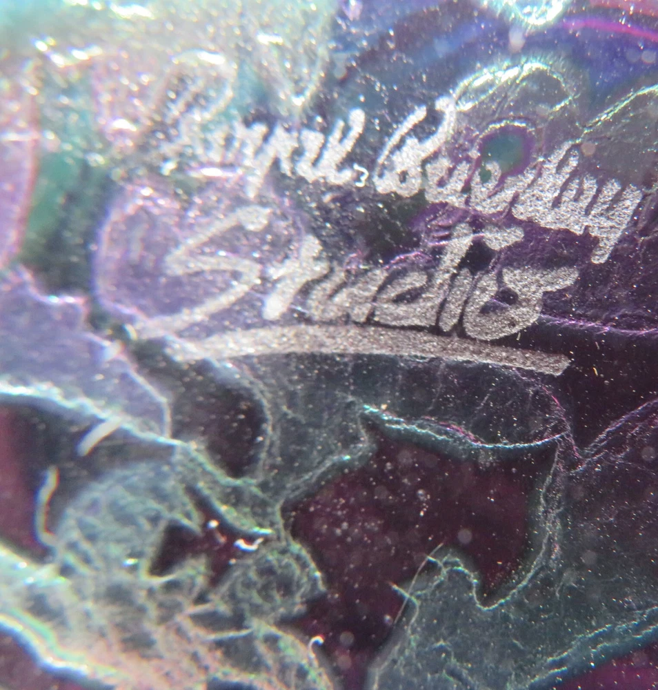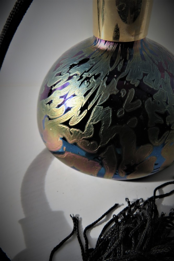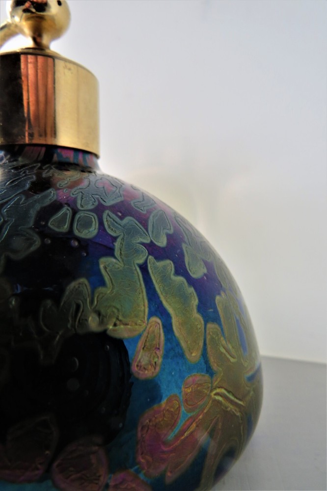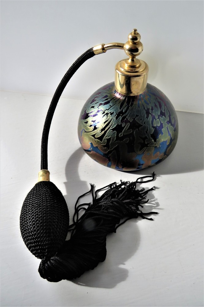 Offered for sale is a lovely example of a Royal Brierley Studio Range Glass Perfume Atomiser. Its Bell shaped and in the dark iridescent shade so associated with the series. The base diameter is 9cms.and the height is approx. 10.5cms. Its in good used condition including the puffer and tassel. Makers detail etched to the base. A great decorative for the dressing table. Contact me if you have any questions.
