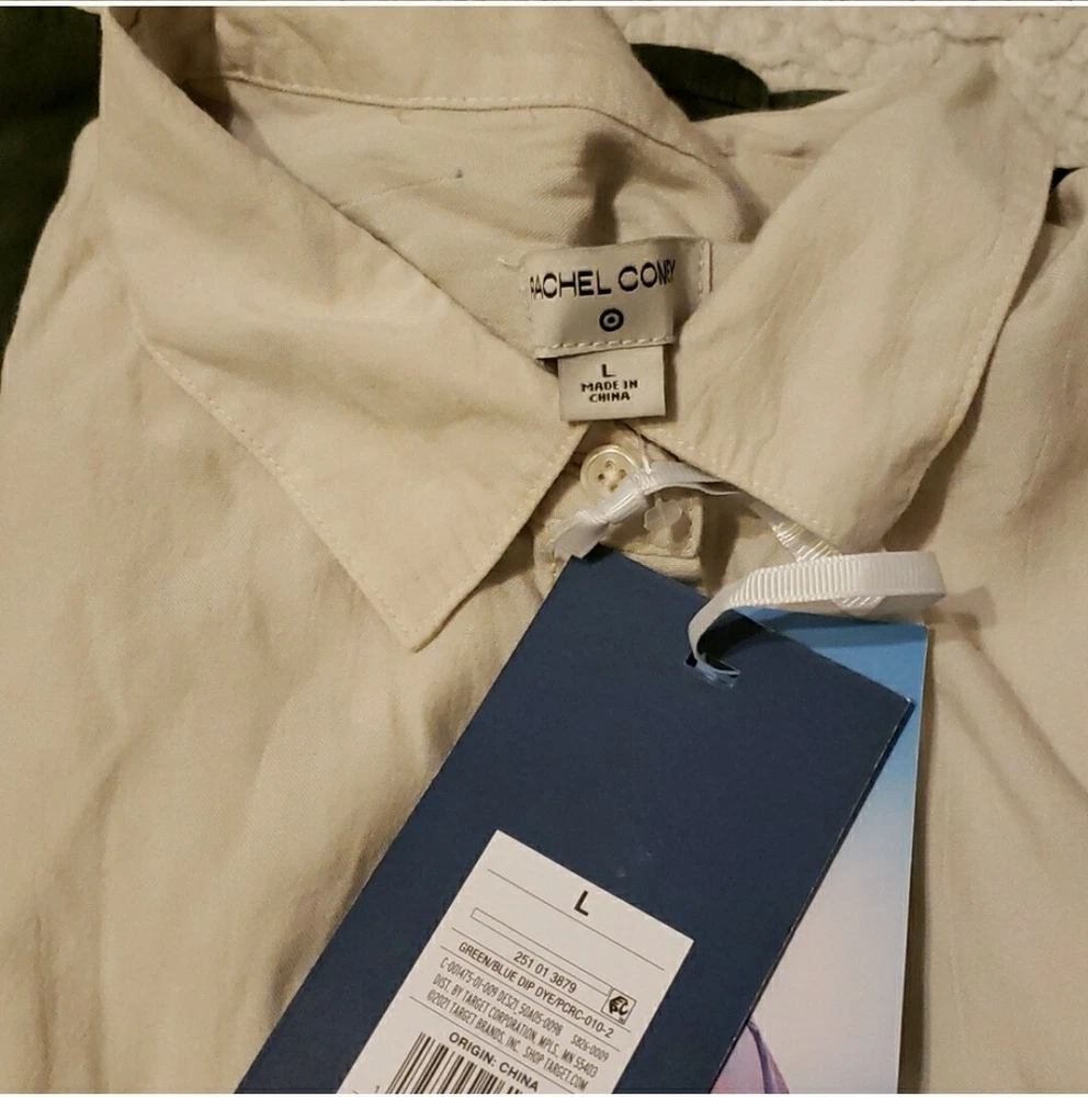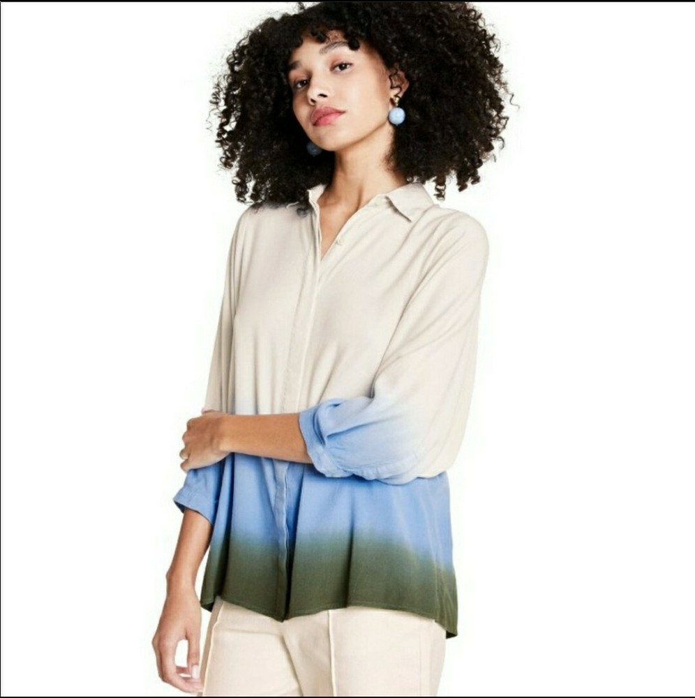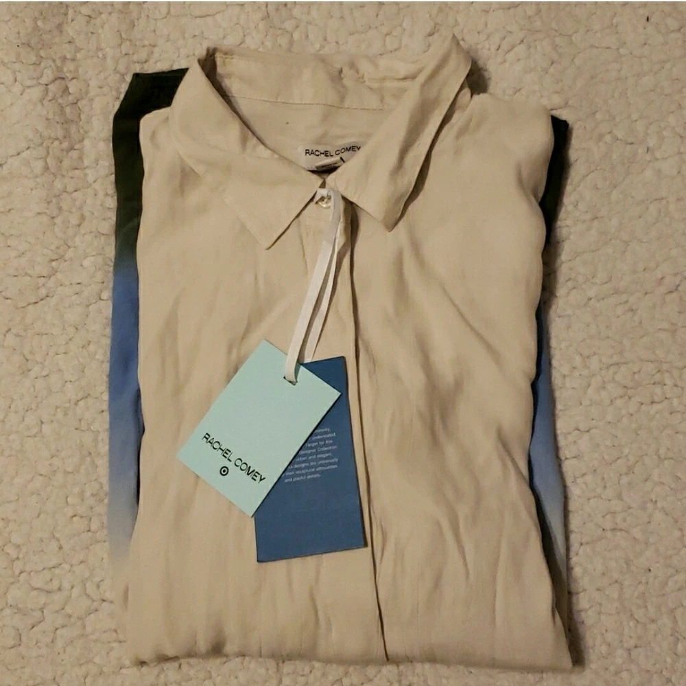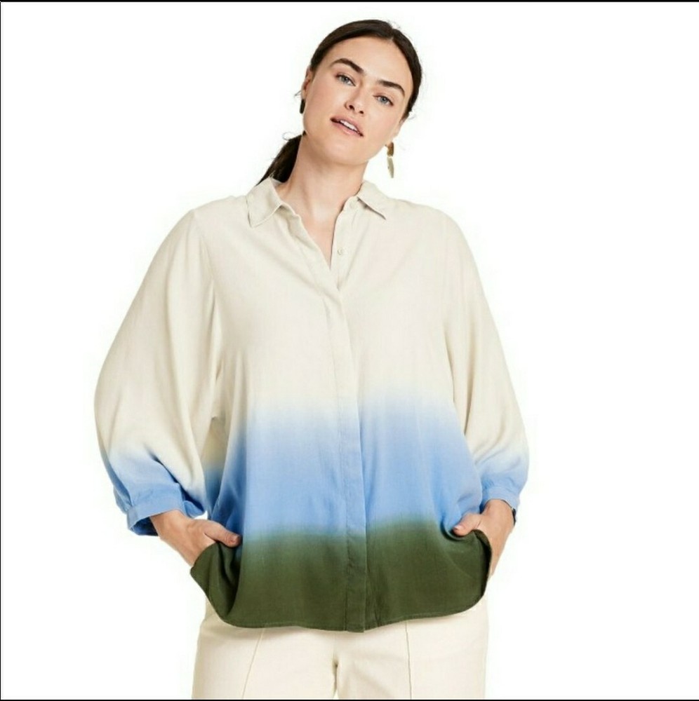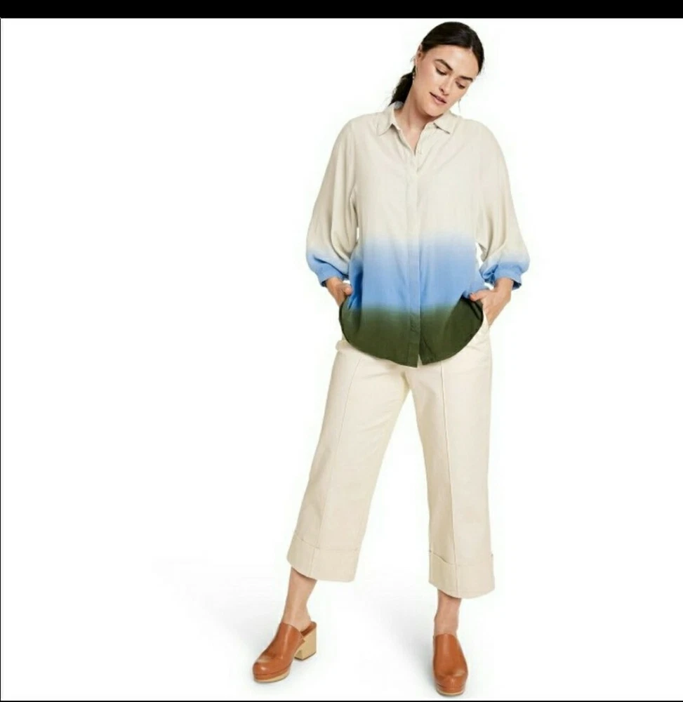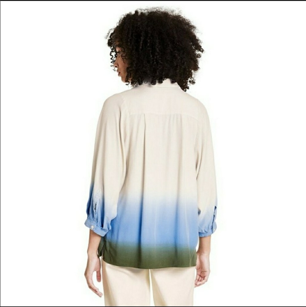 Rachel Comey x Target Women's Dip-Dye Long Sleeve Button Down Blouse - NWT Sz Large Long-sleeve blouse with hidden button-front placket Dip-dye design in cream, blue, & green Relaxed fit hits below the hip for comfortable wear Collared neckline, buttoned cuffs, back darts lends classic style