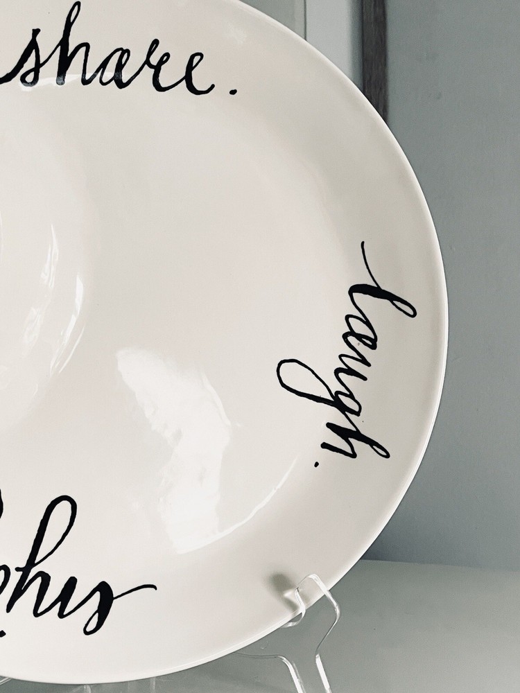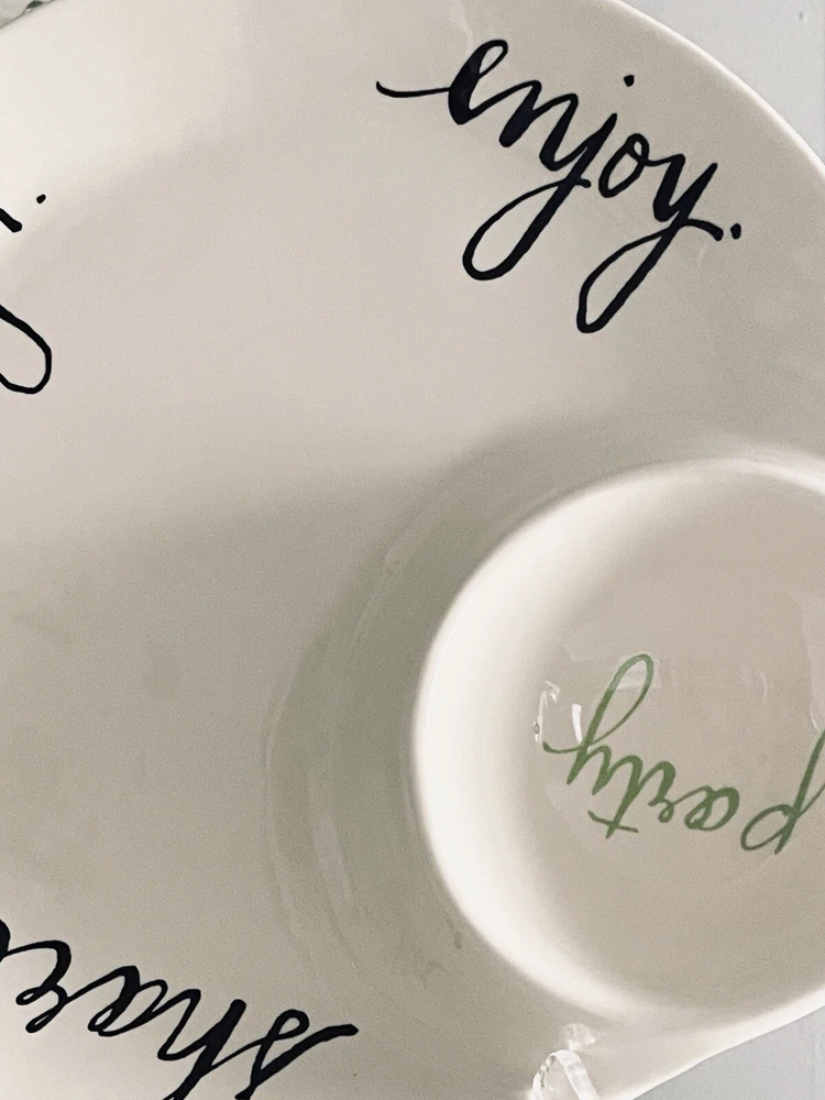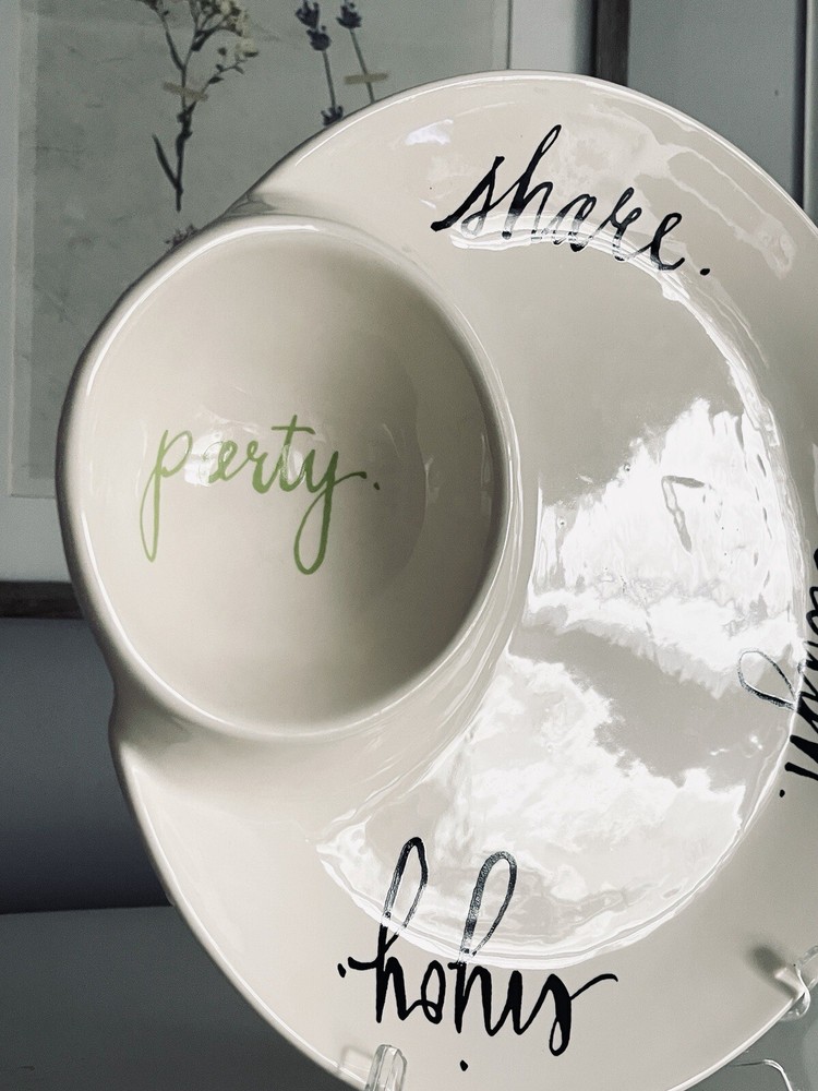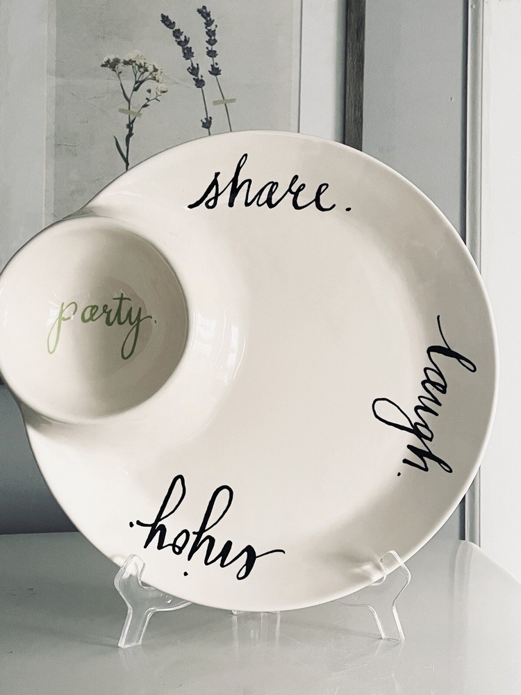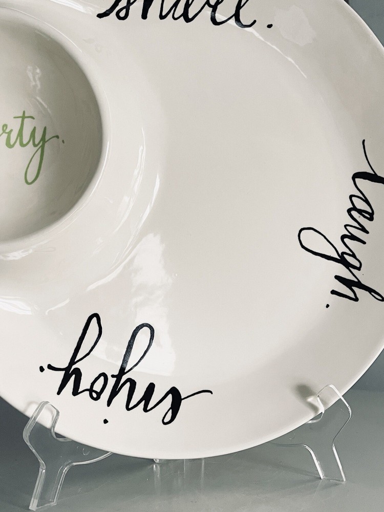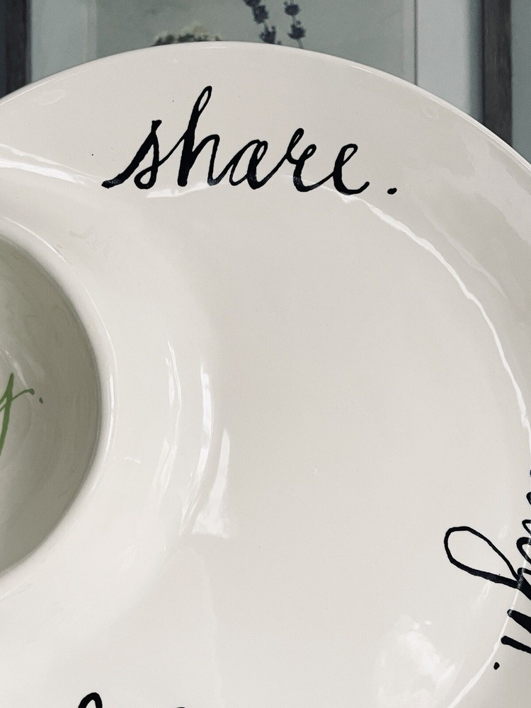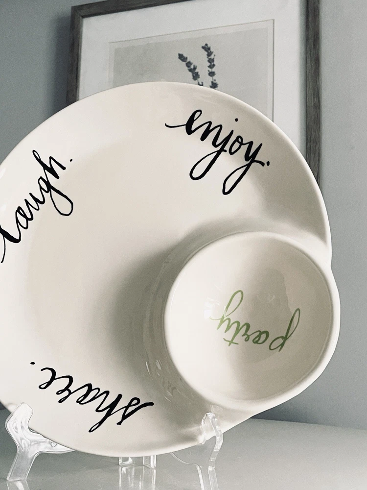 Round Ceramic Chip and Dip Tray. Etched Enjoy Party Share Laugh. Rare and unique piece, extremely dimply. Perfect for entertaining! Produced by Rae Dunn by Magenta magenta-inc.com New condition, unused. No signs of ware. No cracks or chips.
