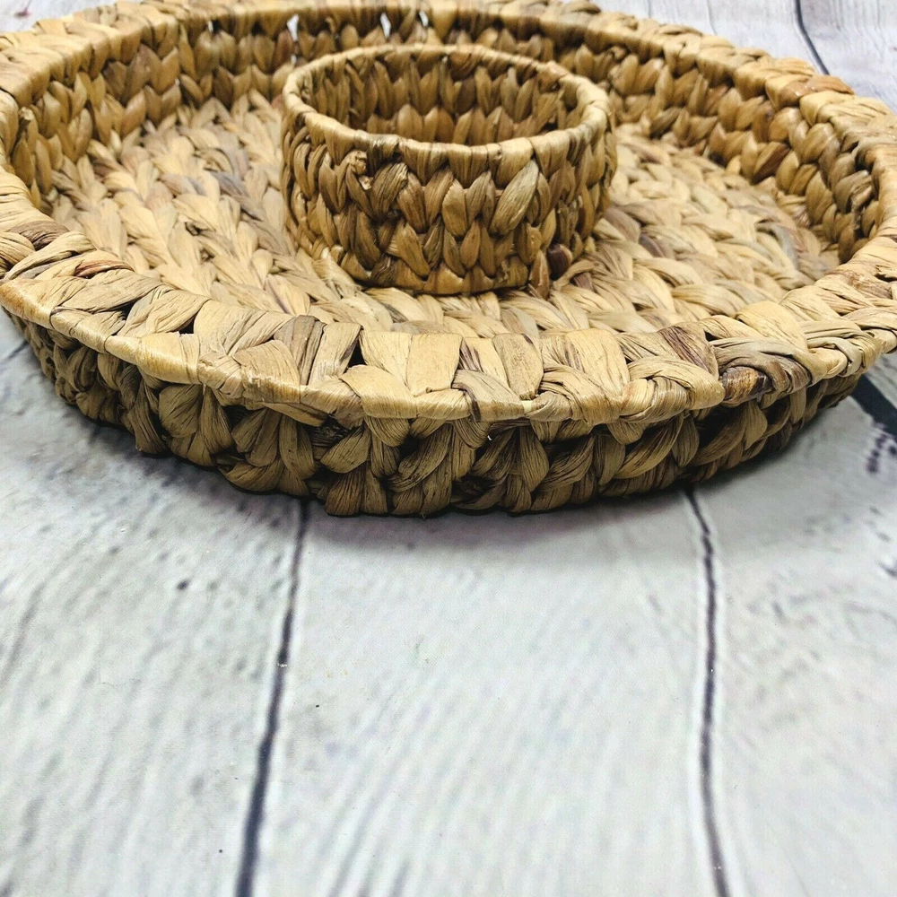 Raffia or seagrass woven chip and dip bowl serving dish. Nice large size, good condition. The center circle is perfect for a bowl or dip container. Entire dish measures approx 15" across. The center circle measures approx 4-1/2" across. Good condition.