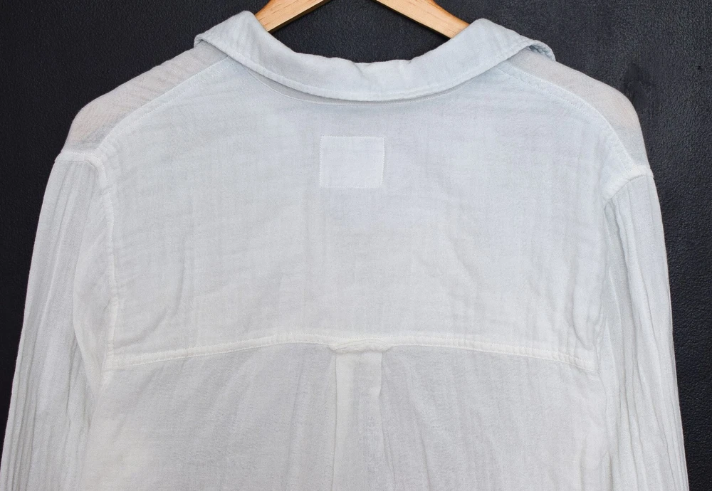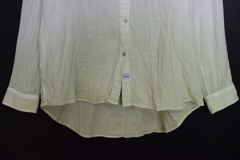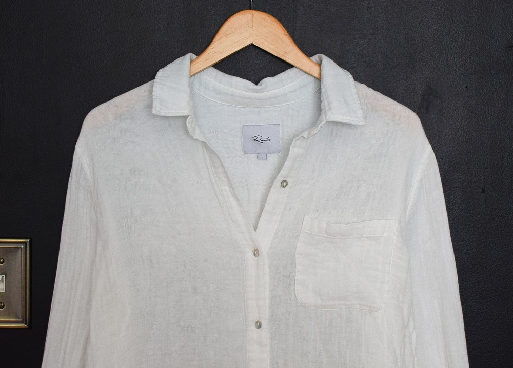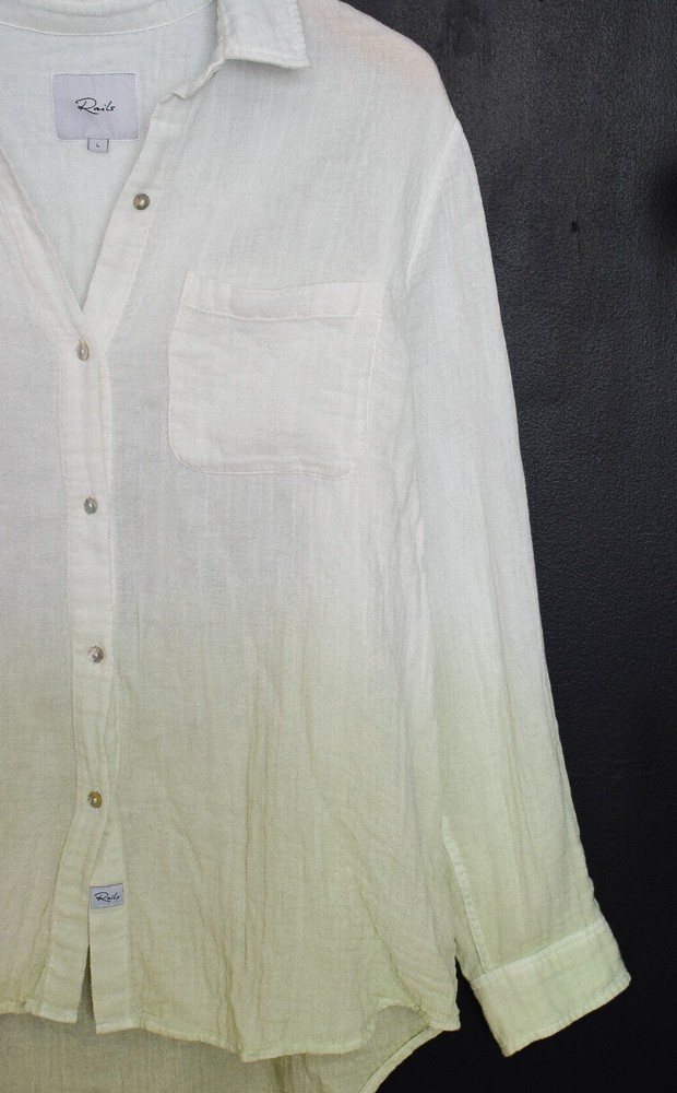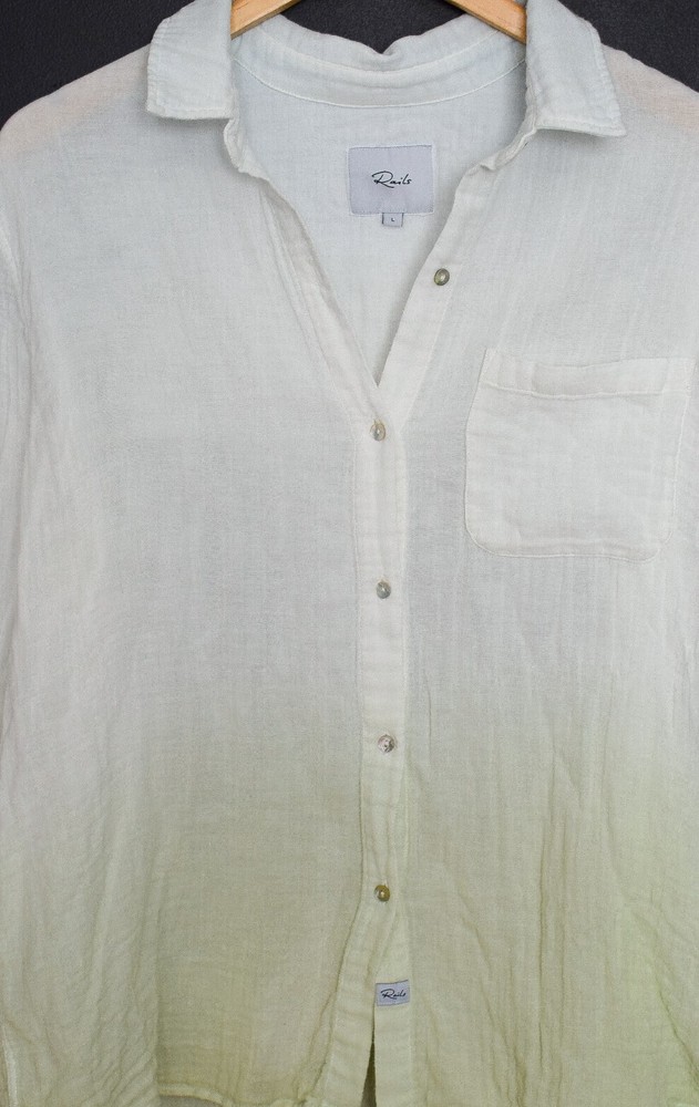 Rails Ellis Shirt in Blue Mint Dip Dye. Very good used condition (light fading and one very small mark, see last photo). Size large. From Rails Eco Collection Light blue to white to green ombre Button down Long sleeve Button cuff Collared Front pocket Curved hem Relaxed fit Cotton gauze Rails logo patch Extra button still attached Original MSRP $168 100% cotton Measurements taken while buttoned Length - approximately 26.5-30.5 inches Chest width - approximately 22 inches (circumference approximately 44 inches) Hip/bottom hem width - approximately 24 inches (circumference approximately 48 inches) "Lightweight, breezy, and breathable, this chic classic is a must-have for everyday elevated comfort. Made from organic cotton gauze, this button-down shirt features a single patch pocket at chest, natural shell buttons and a classic it." casual, classic, rails, ombre, dip dye, gauze, lightweight, flowy, summer, spring, beach, coastal, vacation, travel, everyday, pastel, gauzy button down, cotton gauze, ecofriendly
