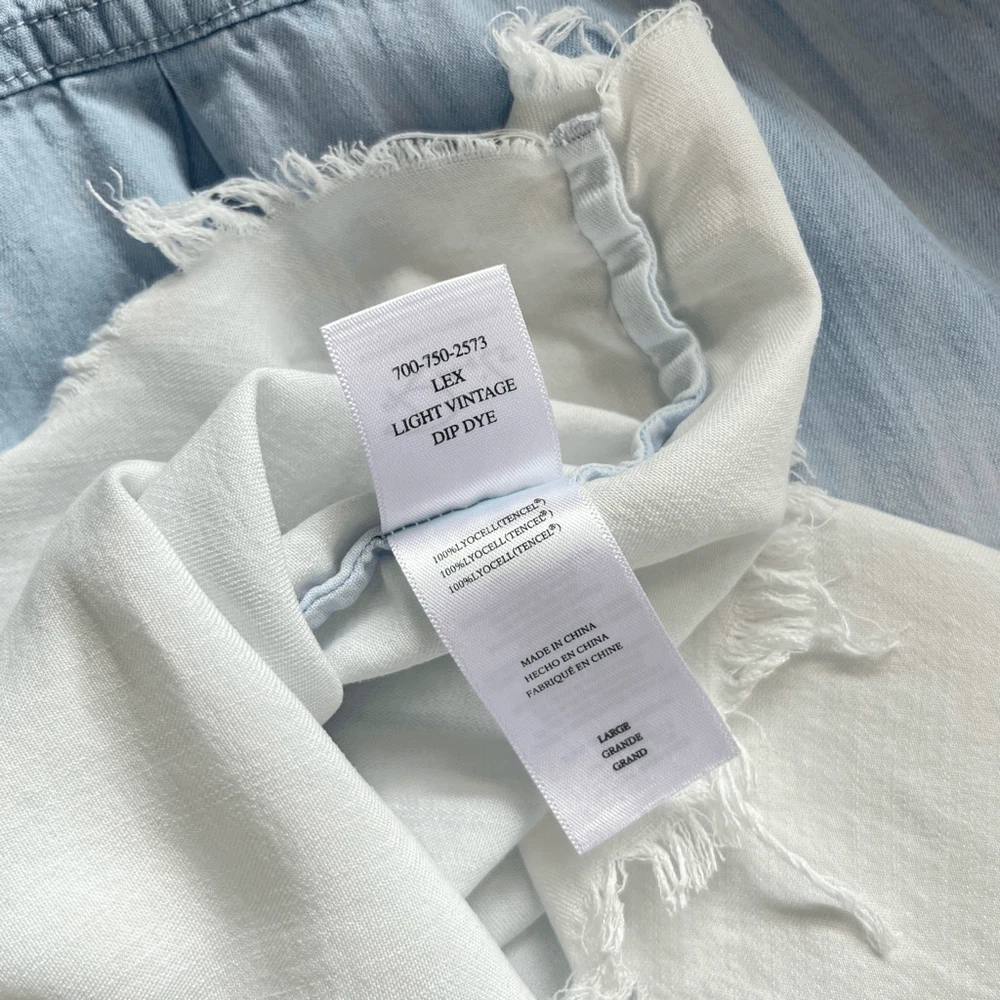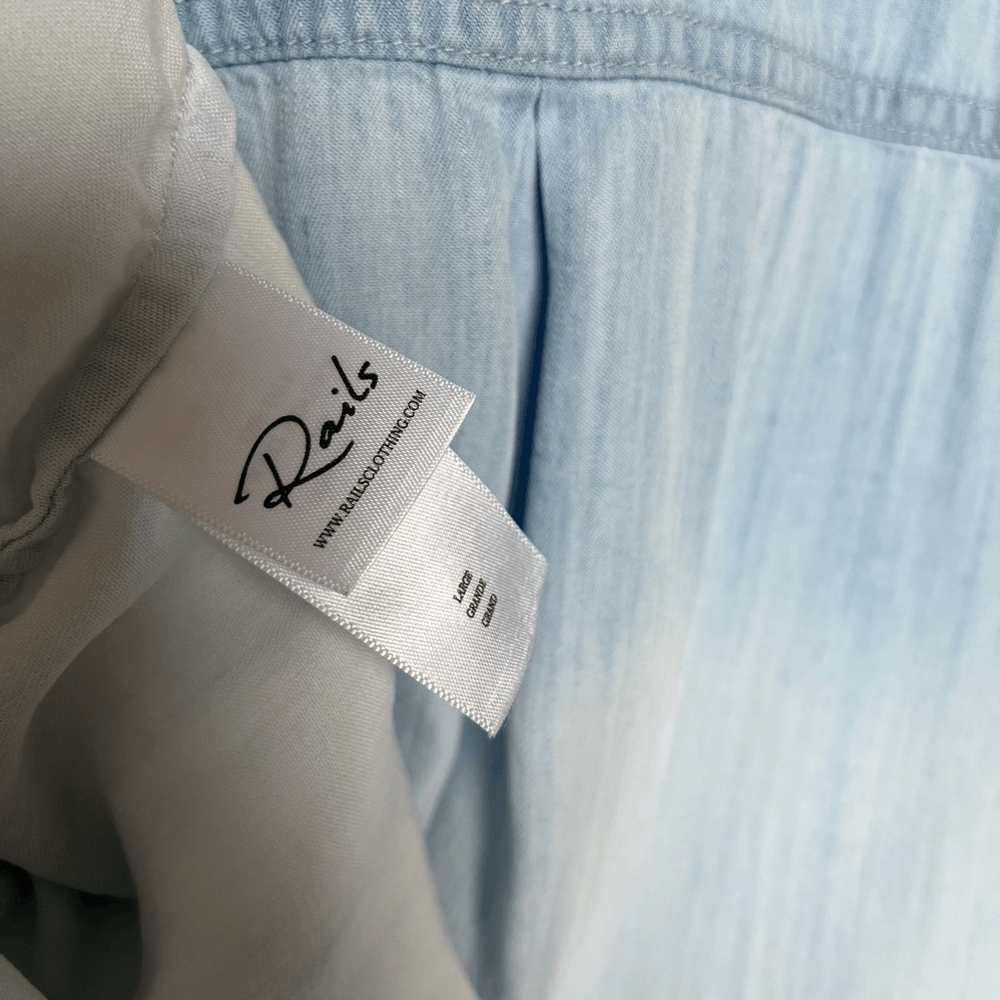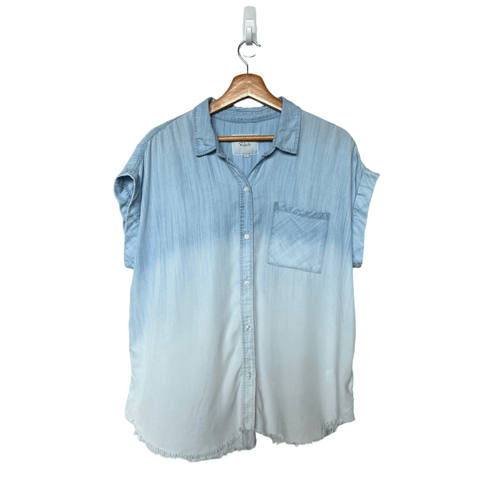 Rails Lex Short Sleeve Button Up in Light Vintage Dip Dye Size Large Color Blue ombre Preloved Raw hem No damages Approx. Measurements Length 26.5" Pit to pit 25.5" Website Details 100% lyocell. Made in China. Machine wash. Front button closure. Breast slip pocket. Cuffed sleeves. Due to the unique wash, colors and patterns may vary slightly. Revolve Style No. RAIL-WS861. Manufacturer Style No. 700-750-2573.