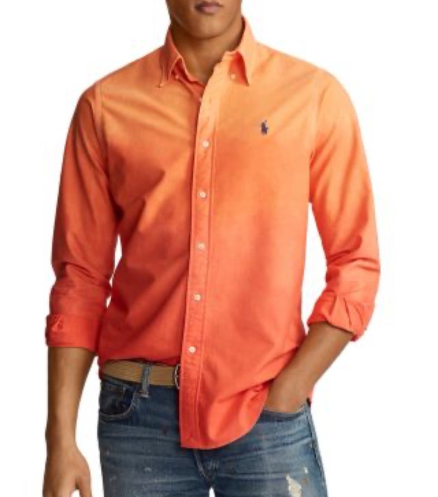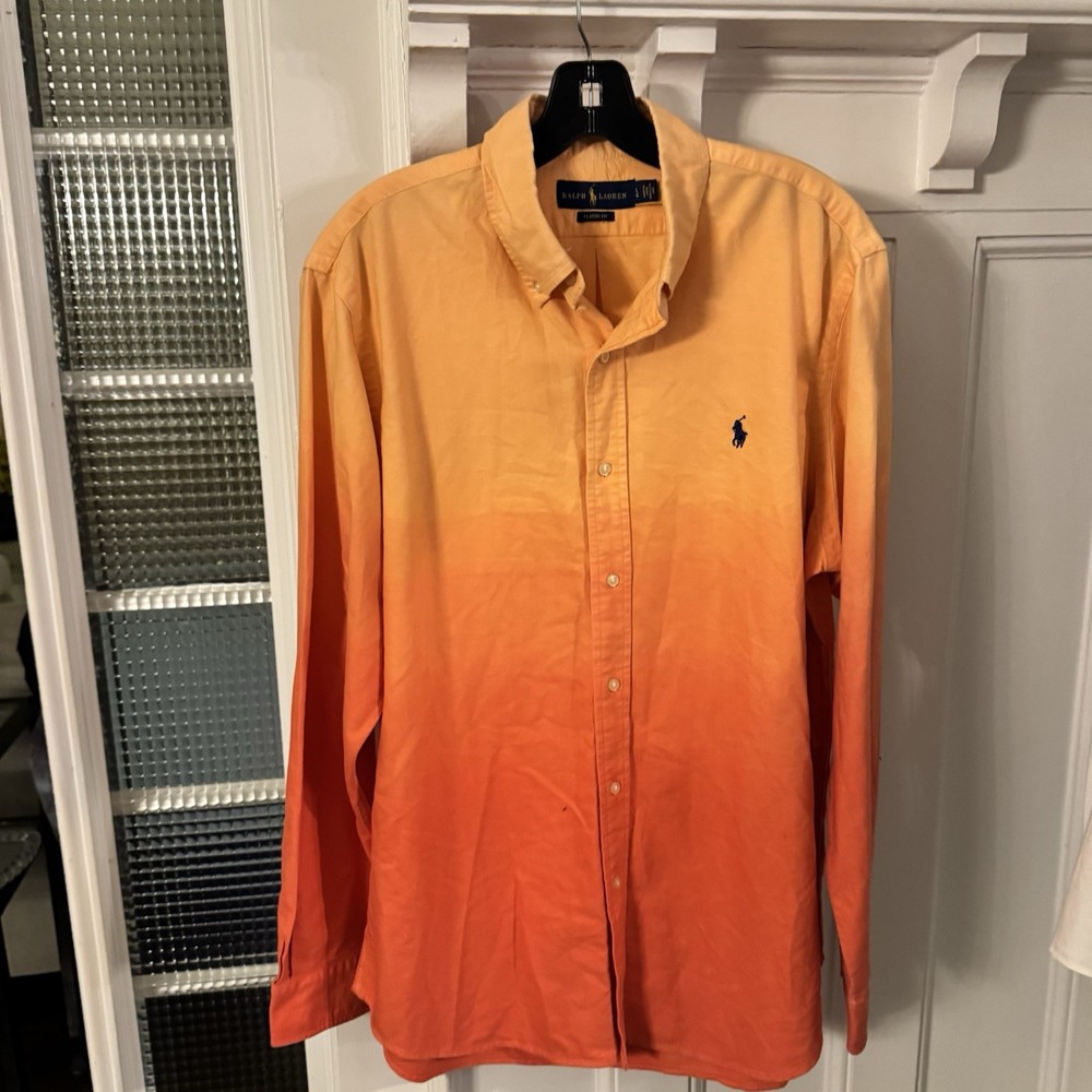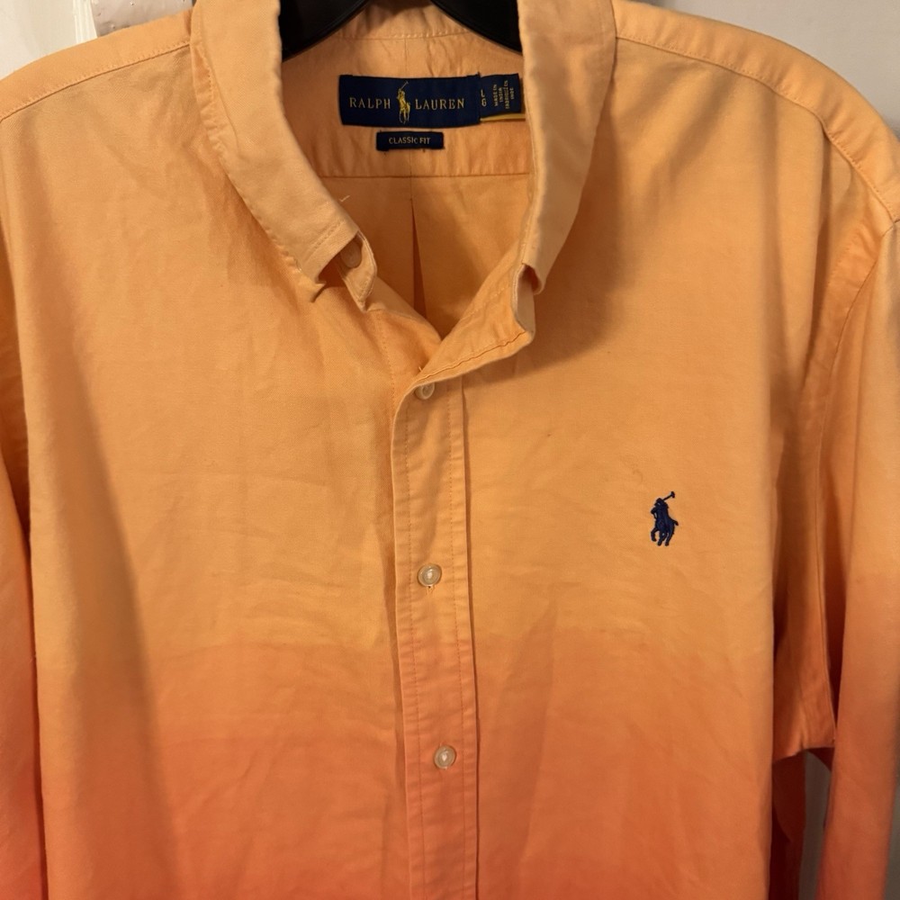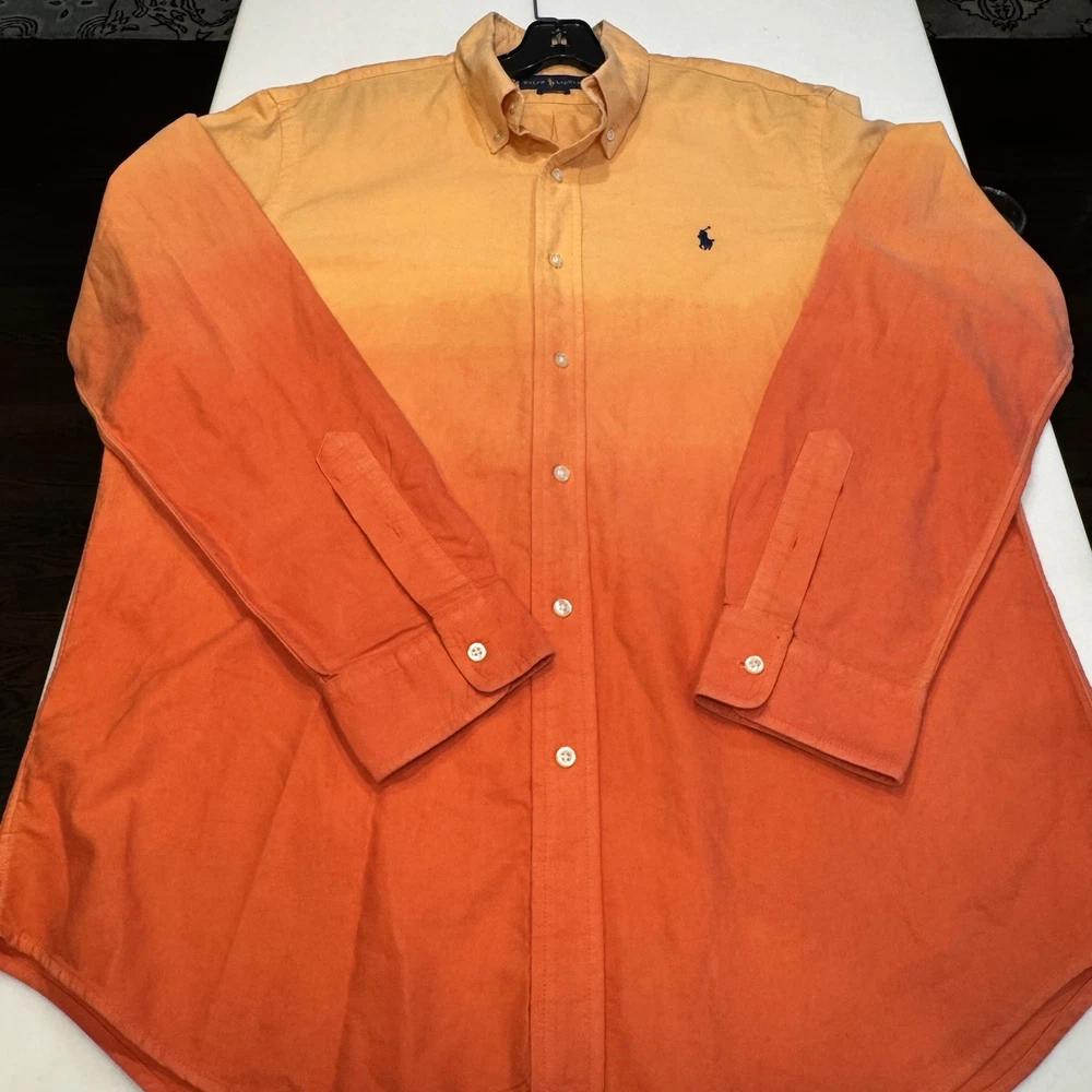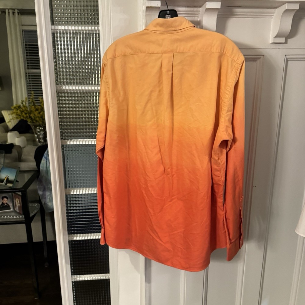 Perfect condition. Men’s Ralph Lauren dip dyed orange oxford button down shirt. Long sleeves, embroidered pony logo, classic fit, button down collar, 100% cotton. Size large. See photos for measurements. MSRP $130