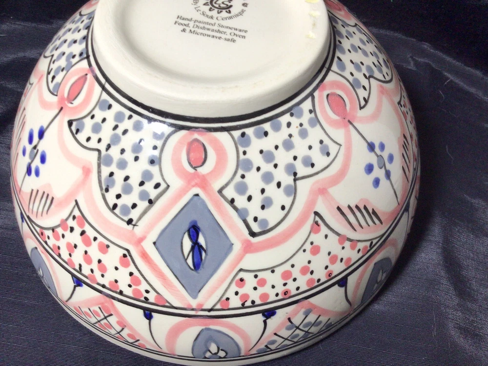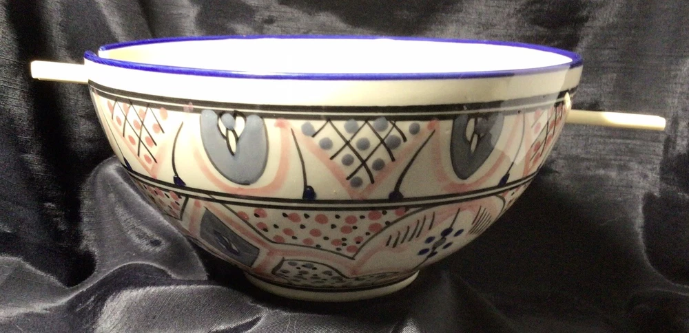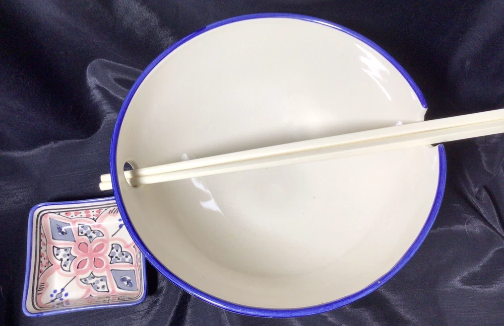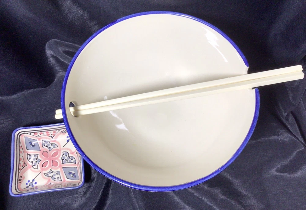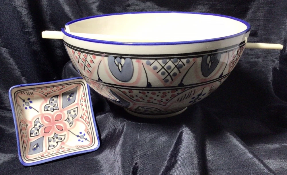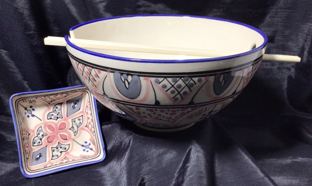 This Ramen Noodle Bowl & Dip Sauce Dish by Le Souk Ceramique are perfect for all occasions. The set includes a large bowl, matching square dip sauce dish, and a pair of chopsticks. The bowl is oven, microwave, and dishwasher safe. The round-shaped, shiny-finished bowl was made of stoneware. It features an hand painted abstract pattern in the colors of gray, blue, black and pale pink. It was manufactured in Tunisia. This is how the set came, when I purchased it. PLEASE NOTE: The “foot” of the bowl has three grooves. These were done in manufacturing. Please, take a look at the photos as part of the description. Please, feel free to ask any questions prior to committing to purchase. I pack with TLC and ship fast! Shipping is based upon Ebay’s calculations of the buyer’s location, box size and weight. As-Is. All sales are final. Sorry, no international shipping. Please, pay within three days of the end of the auction or immediate BIN closing. Thank you for looking! 🍜🇹🇳🍜