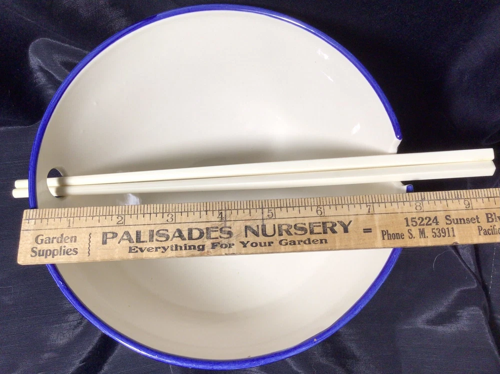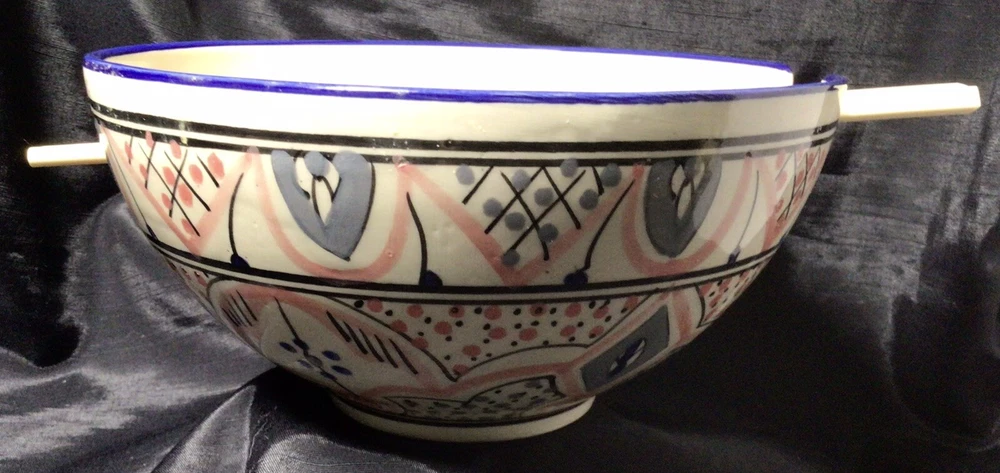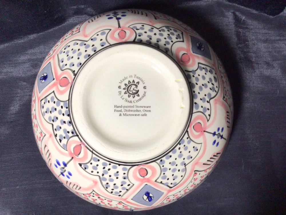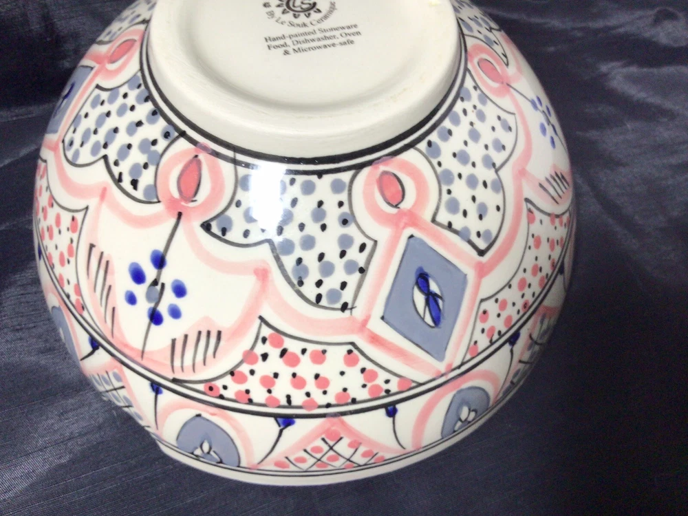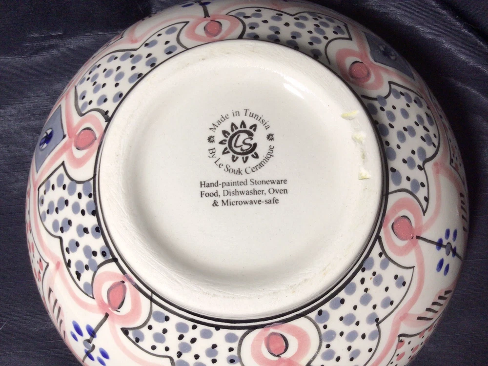 This Ramen Noodle Bowl & Dip Sauce Dish by Le Souk Ceramique are perfect for all occasions. The set includes a large bowl, matching square dip sauce dish, and a pair of chopsticks. The bowl is oven, microwave, and dishwasher safe. The round-shaped, shiny-finished bowl was made of stoneware. It features an hand painted abstract pattern in the colors of gray, blue, black and pale pink. It was manufactured in Tunisia. This is how the set came, when I purchased it. PLEASE NOTE: The “foot” of the bowl has three grooves. These were done in manufacturing. Please, take a look at the photos as part of the description. Please, feel free to ask any questions prior to committing to purchase. I pack with TLC and ship fast! Shipping is based upon Ebay’s calculations of the buyer’s location, box size and weight. As-Is. All sales are final. Sorry, no international shipping. Please, pay within three days of the end of the auction or immediate BIN closing. Thank you for looking! 🍜🇹🇳🍜