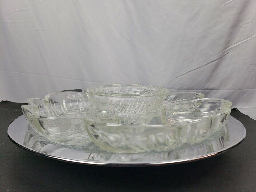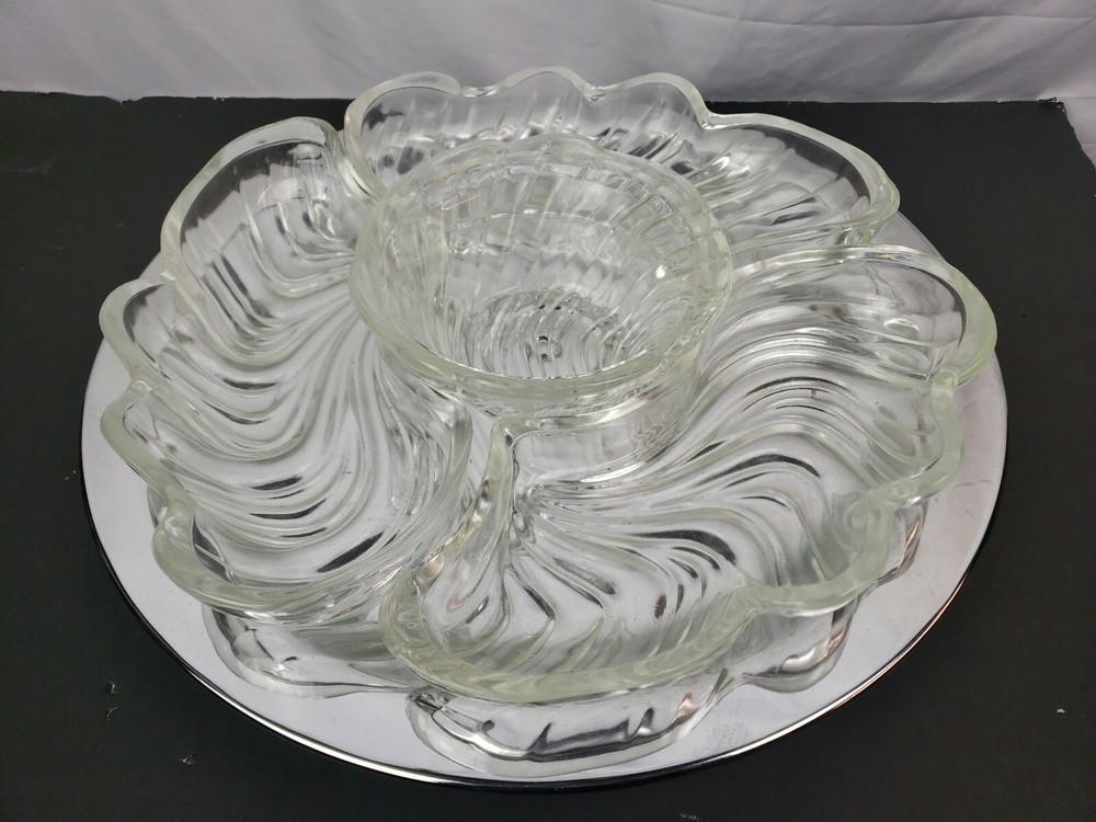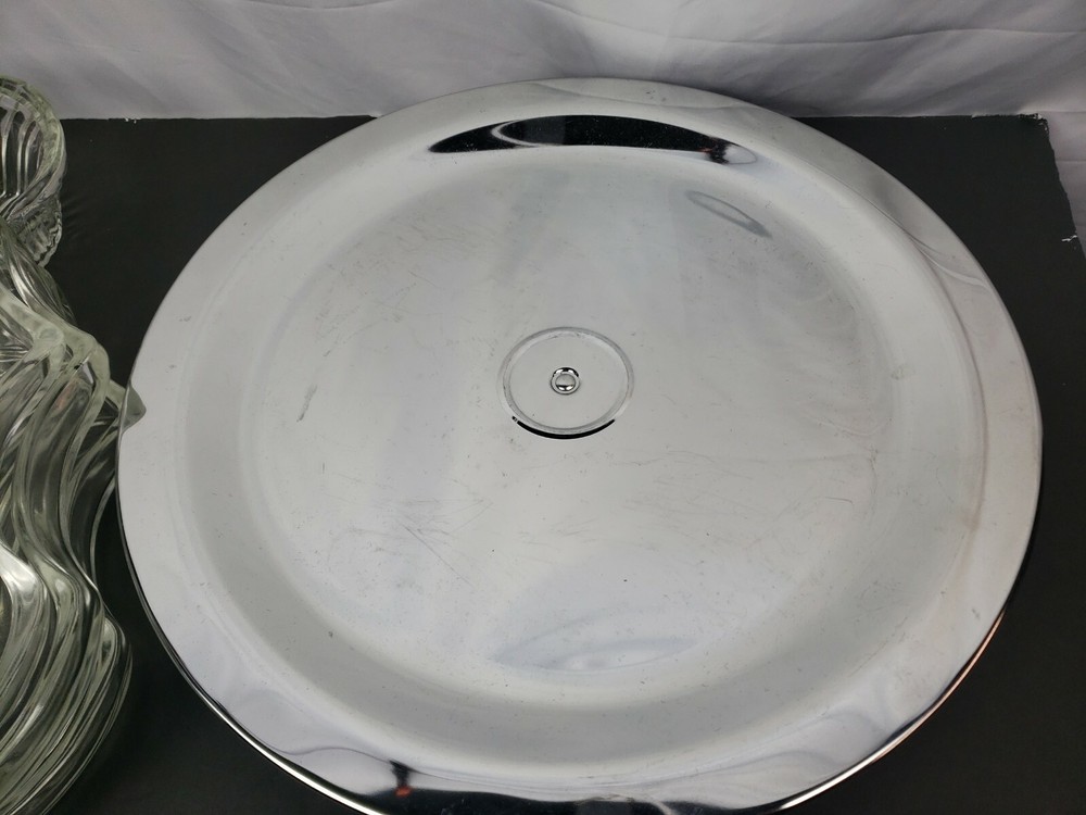 Rare Kromex Vintage Party Platter Glass Dish Set Elegant Serve Tray Chip and Dip Large Measures approx 16" diameter. Condition is Used Wear consistent with age. Minor scratches on chrome and a chip on...