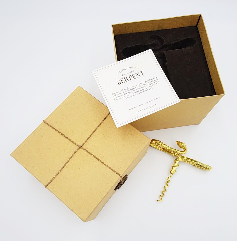 Rare Pottery Barn Limited Edition Gold Serpent Ouvre-Bouteille Corkscrew Opener New in Original Box Measurements: Box: 5"T x 6"W x 6"W (12.7cm x 15.24cm x 15.24cm) Corkscrew: 5"W x 3.75"L x 1"Thick (12.7cm x 12.07cm x 2.54cm) Markings: PB Weight: 12 oz. Symbolic of heightened awareness, guardianship and rebirth, the serpent is delicately coiled atop a twig to function as a corkscrew. Each piece begins as a finely detailed sculpture that is then di-cast and polished by hand. Made in France - Hand wash only recommended