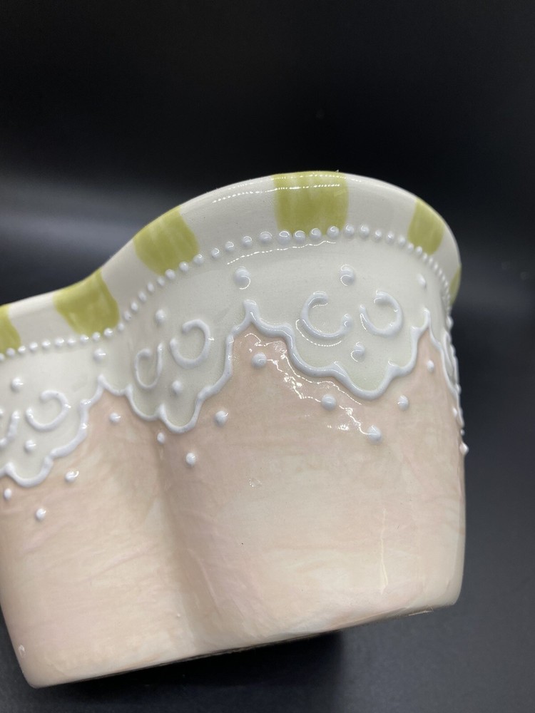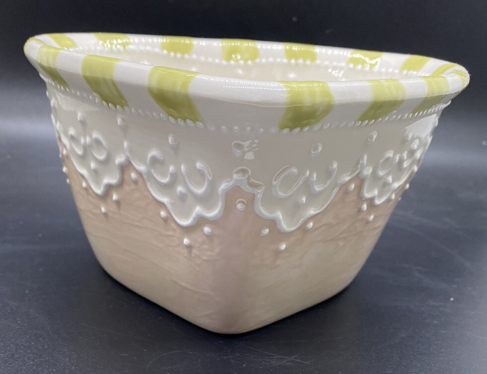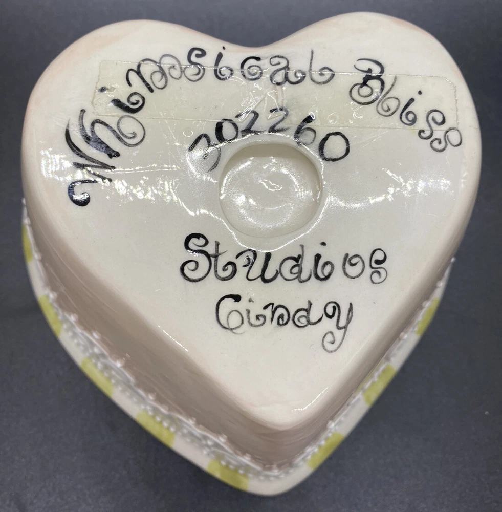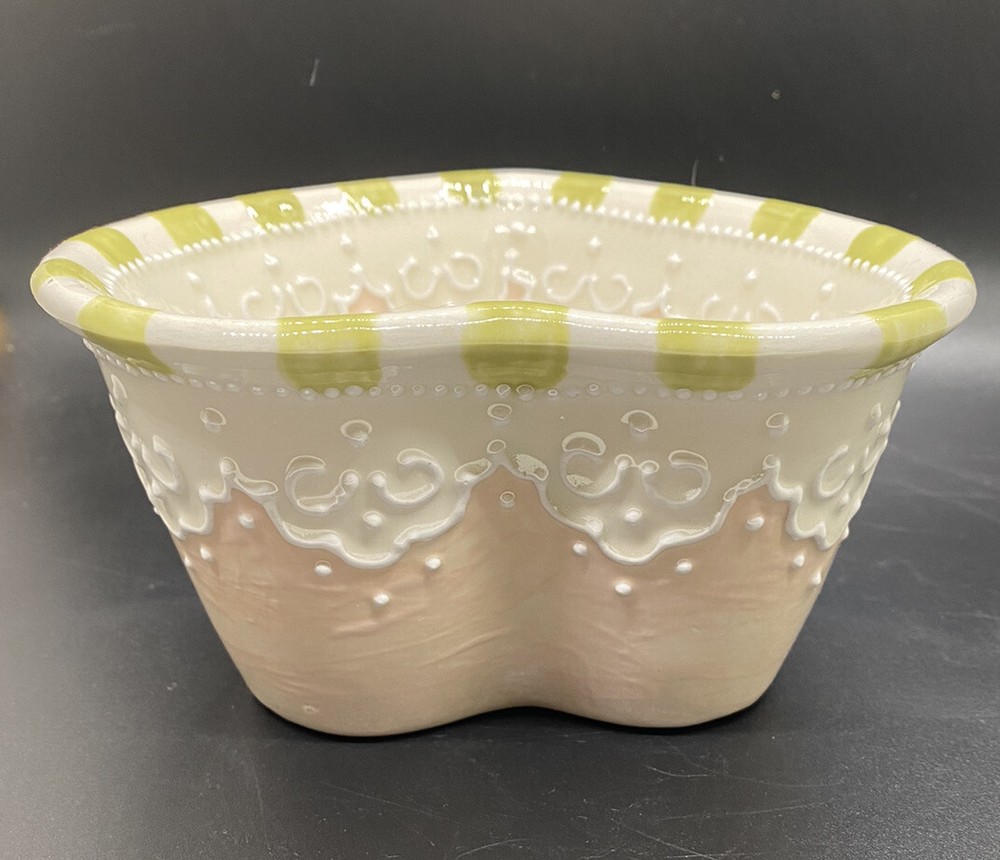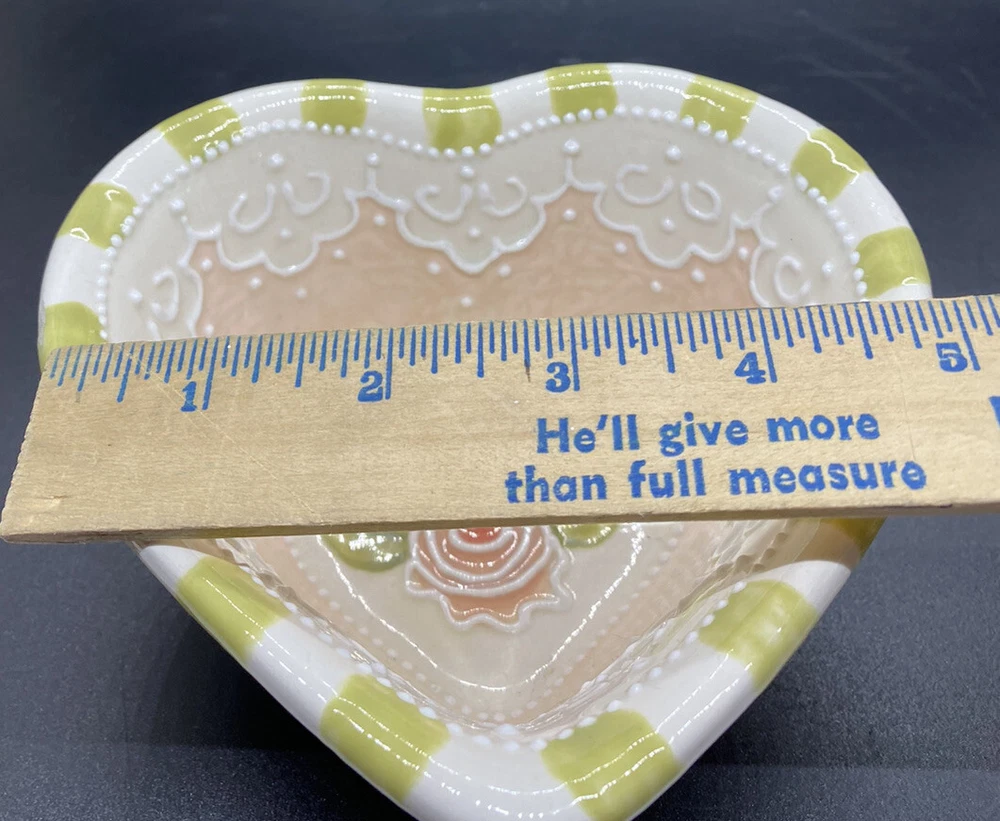 Rare, hard to find Whimsical Bliss Studios art pottery heart shaped bowl. It measures 4” x 5”. Green and white stripes around the rim. Rose in the center. Accented with textured lace design. No chips or cracks.