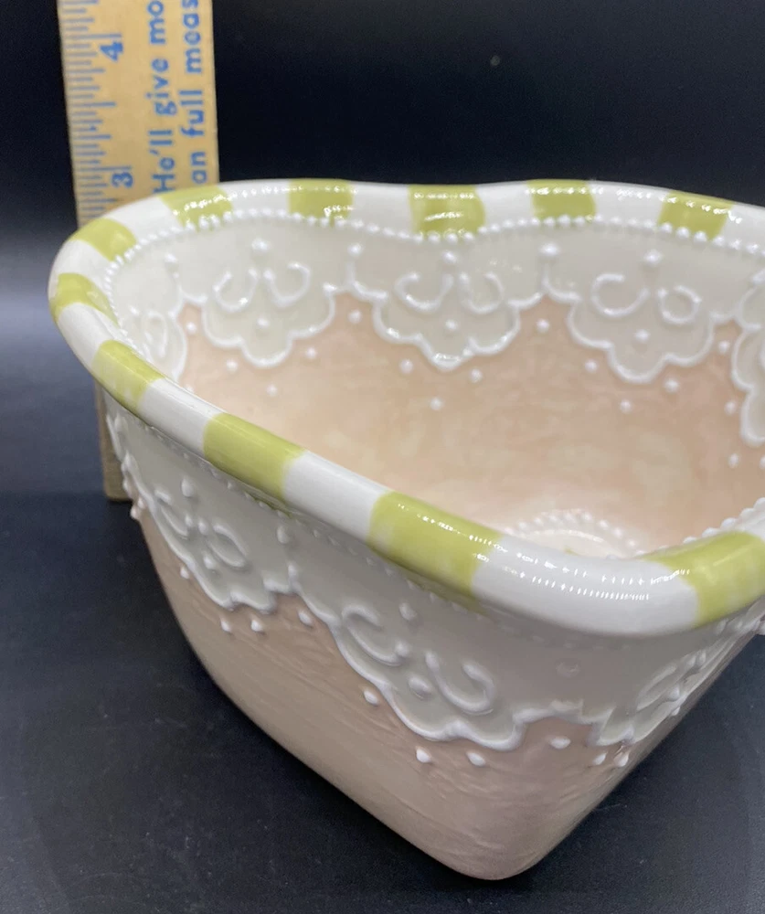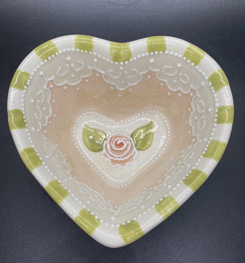Rare, hard to find Whimsical Bliss Studios art pottery heart shaped bowl. It measures 4” x 5”. Green and white stripes around the rim. Rose in the center. Accented with textured lace design. No chips ...