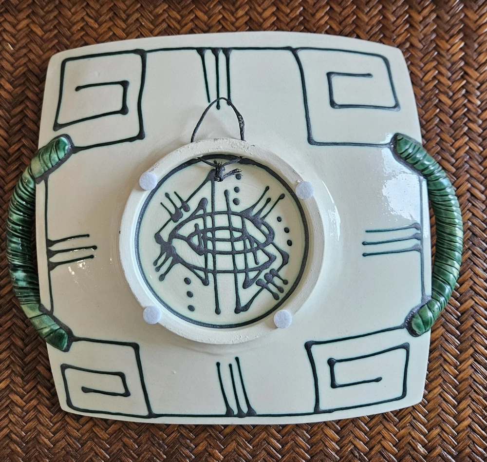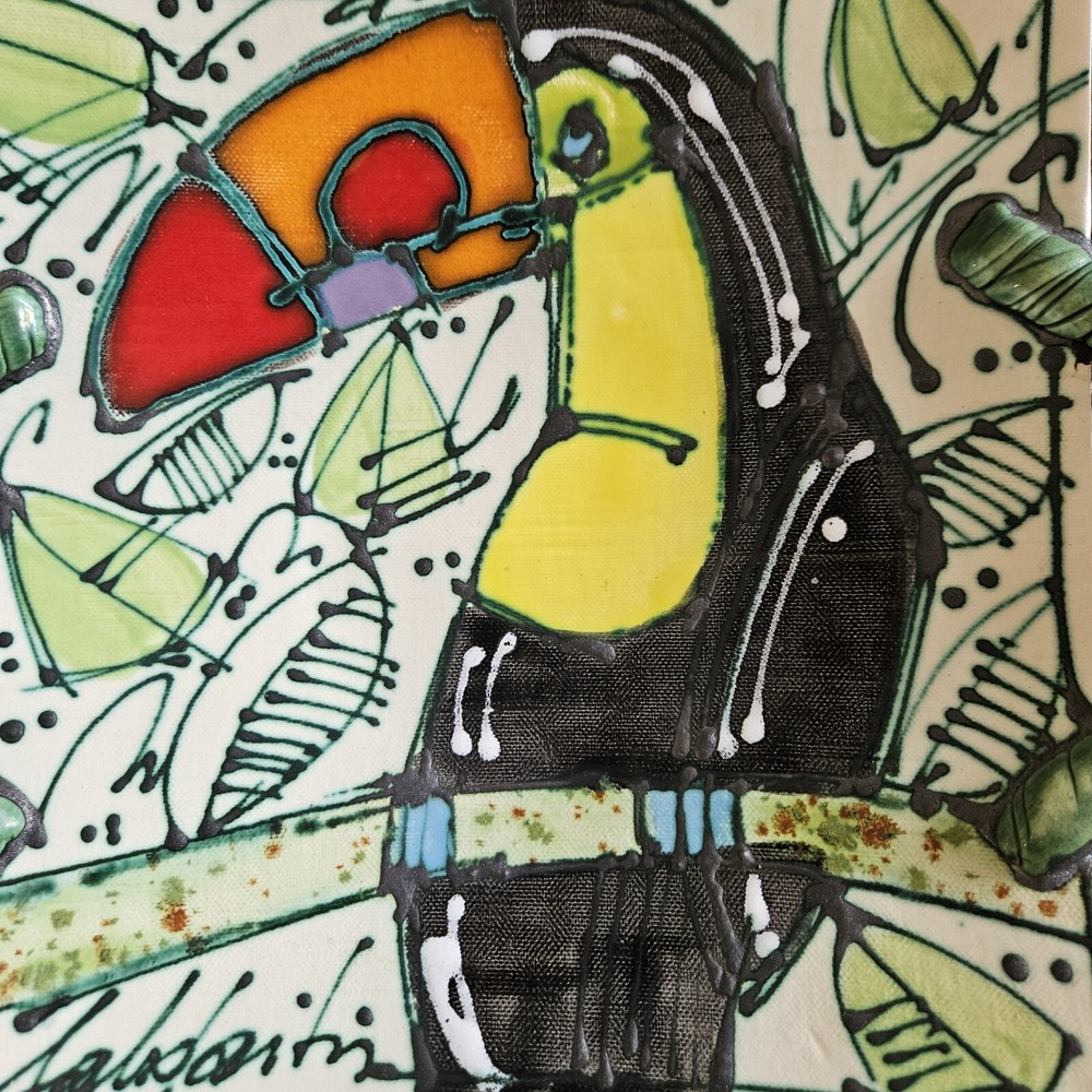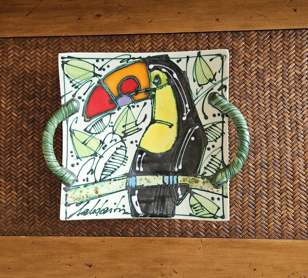 Beautiful Vintage platter or wall hanging by Rasa Saldaitis. In the 1990s her focus was ceramic art. Now she focuses mostly on paintings so these beautiful early ceramics are highly collected. This piece features a colorful Toucan in vegetation. The piece is light weight and superbly crafted. The handles are intricately layered for a raffia effect. The piece is in excellent condition with no chips, repairs or hairline fractures. Measures approximately 9.5" square without the handles included. It is wired and ready to hang if desired I only ship within the Continental United States Sorry no returns Thanks! From 1984-1989 Rasa Saldaitis trained to become an art instructor at Pedagogical University in Siauliai, Lithuania. She received her Masters in Fine Arts in 1989. In 1991, She opened an art studio called “Ugne”, which translates to “Goddess of Fire”. "Ugne" specialized in decorative ceramics and paintings. In 1994, she moved to the United States. Today she concentrates primarily on painting, and her work can be found in several galleries and art shows.