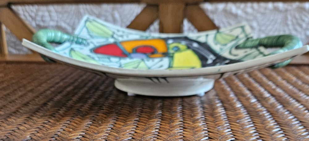 This vibrant Toucan platter by Rasa Saldaitis is a stunning piece of ceramic art! The rich colors and intricate raffia-style handles add a tropical charm, perfect for wall decor or display. Lightweight yet well-crafted, it’s in flawless condition. A rare find from her early ceramics era—ideal for collectors who appreciate vintage artistry. Ready to hang and enjoy!