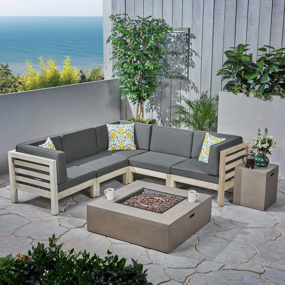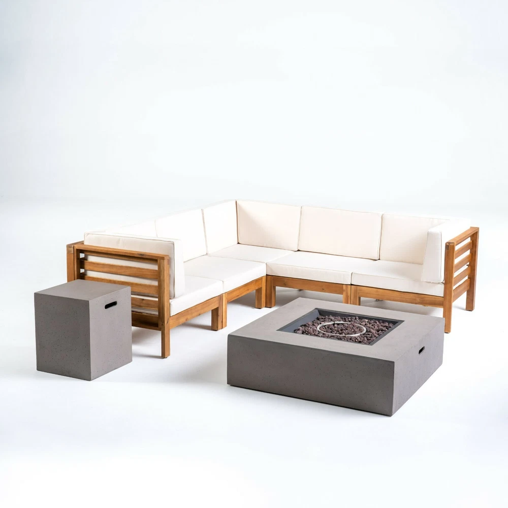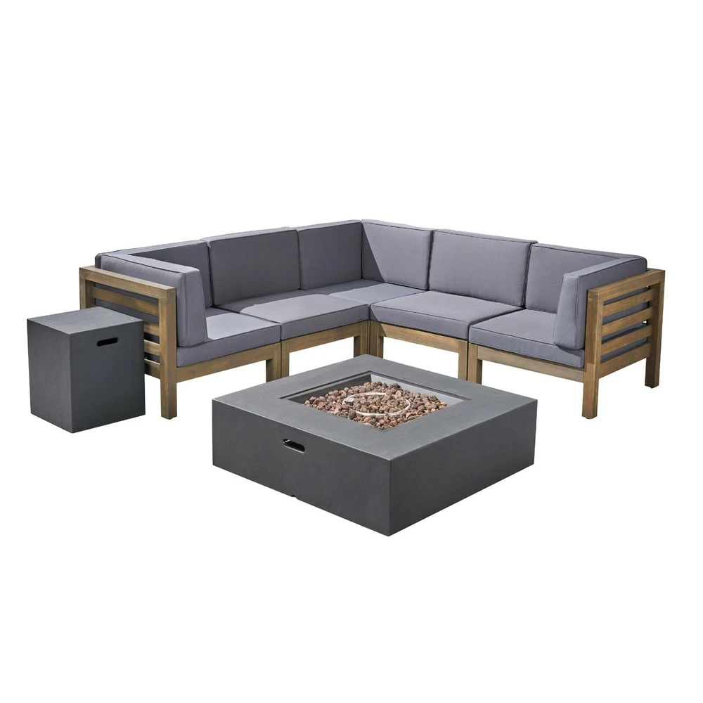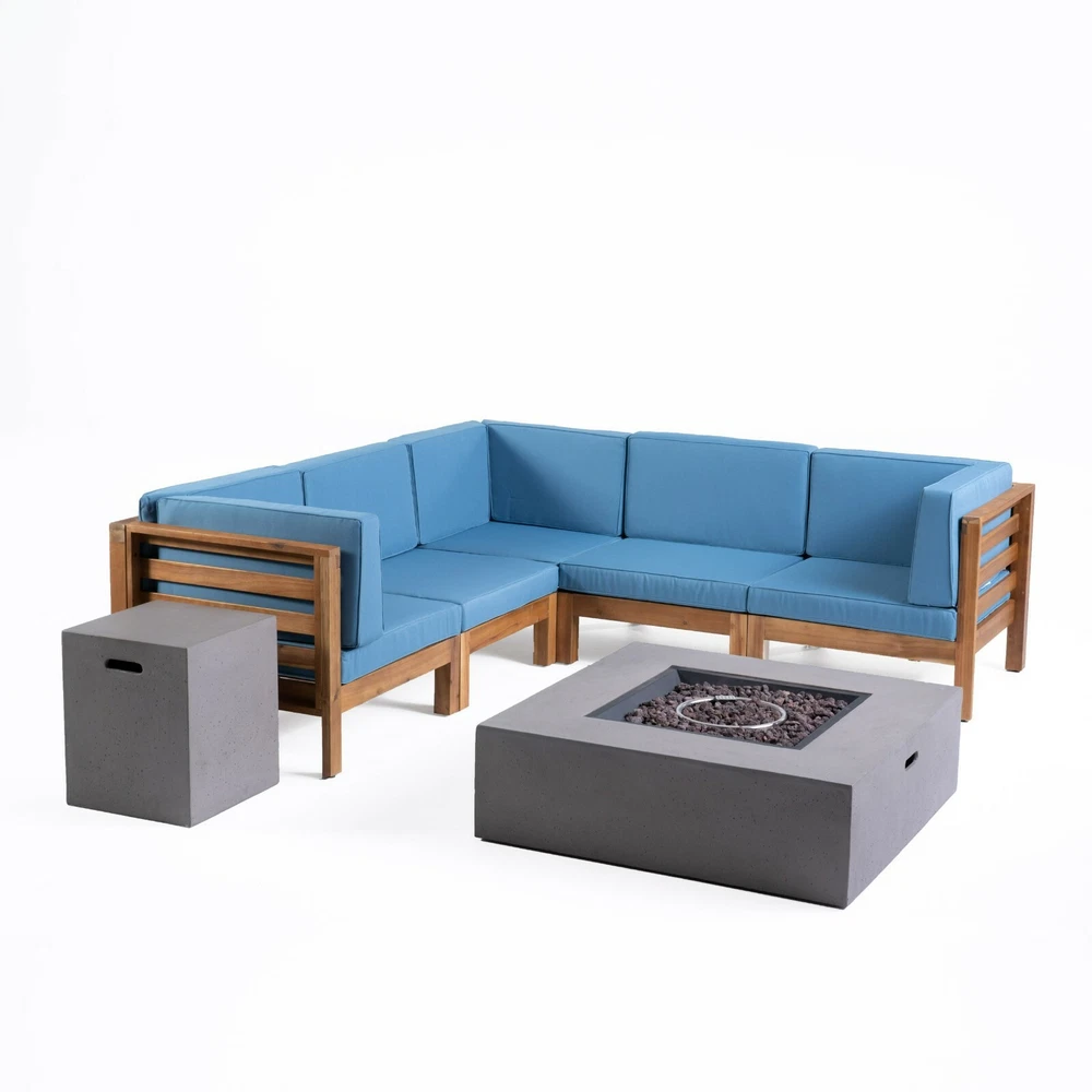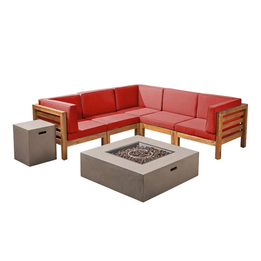 Keep your loved ones warm and toasty long after the sun has gone down. This modular L-shaped sectional sofa set not only offers generous seating space for every guest but it also features an exquisitely modern square fire pit for an extra boost of comfort. With naturally durable acacia wood frames and water-resistant cushions, this set is the perfect centerpiece to bring out good company and even better conversations all summer long. ACACIA WOOD: Our sofa set is made with acacia wood that brings a sleek yet natural look to your space. Perfect for resisting normal wear and tear, this durable hardwood maintains a sturdy foundation that can withstand most outdoor elements and will not darken over time. WATER-RESISTANT CUSHIONS: Our cushions are covered with a non-porous material that makes cleaning any spills a breeze. The seat cushion includes hook and loop fasteners to ensure that you can spend all summer lounging outdoors in comfort. Please note that these cushions are water-resistant and not waterproof. Please do not submerge in water. FIREPIT WITH TANK HOLDER: This fire pit is constructed with lightweight concrete for a minimalistic yet modern vibe. The shape allows easy seating arrangement for you and your guests, providing light and warmth all around during those chilly evenings. This comes with a matching tank holder to keep your propane tank inconspicuous. ASSEMBLY REQUIRED: Some assembly is required for this chat set. All of the instructions and tools needed for assembly are included. No assembly is required for this fire pit. Simply place the lava rocks in the pit without covering the burner, and then plug in your standard size propane tank and enjoy your fire pit. SET INCLUDES: This set includes one right-arm piece, one left-arm piece, two armless pieces, one corner piece, one fire pit, and one tank holder. Includes: One (1) Right-Arm Piece, One (1) Left-Arm Piece, Two (2) Armless Pieces, One (1) Corner Piece, One (1) Fire Pit, One (1) Tank Holder Frame Material: Acacia Wood Cushion Material: Water-Resistant Fabric Fabric Composition: 100% Polyester Fire Pit and Tank Holder Material: Lightweight Concrete Frame Finish: Teak / Gray / Weathered Gray Cushion Color: Optional Fire Pit and Tank Holder Color: Light Gray / Dark Gray Hand-Crafted Details Some Assembly Required Right-Arm Piece Dimensions: 30.25 inches deep x 30.25 inches wide x 26.50 inches high Right-Arm Piece Seat Dimensions: 28.00 inches deep x 28.00 inches wide x 10.25 inches high Right-Arm Piece Arm Height: 26.50 inches Left-Arm Piece Dimensions: 30.25 inches deep x 30.25 inches wide x 26.50 inches high Left-Arm Piece Seat Dimensions: 28.00 inches deep x 28.00 inches wide x 10.25 inches high Left-Arm Piece Arm Height: 26.50 inches Armless Piece Dimensions: 30.25 inches deep x 28.00 inches wide x 26.50 inches high Armless Piece Seat Dimensions: 28.00 inches deep x 28.00 inches wide x 10.25 inches high Corner Piece Dimensions: 30.25 inches deep x 30.25 inches wide x 26.50 inches high Corner Piece Seat Dimensions: 28.00 inches deep x 28.00 inches wide x 10.25 inches high Corner Piece Arm Height: 26.50 inches Fire Pit Dimensions: 40.00 inches deep x 40.00 inches wide x 12.50 inches high Tank Holder Dimensions: 16.25 inches deep x 16.25 inches wide x 20.25 inches high ~~~-1" ~~~