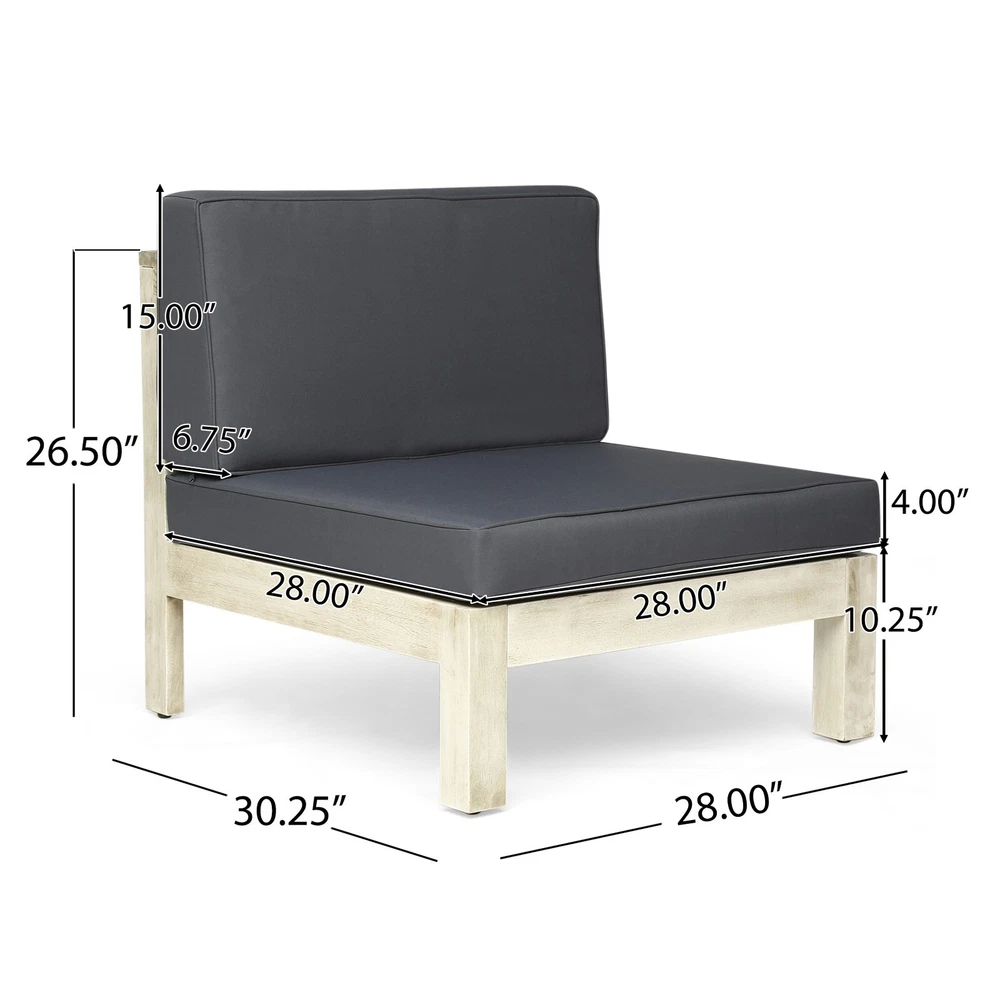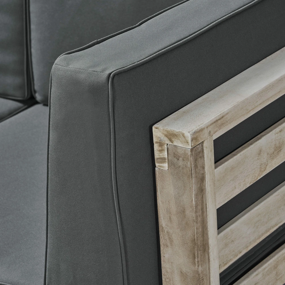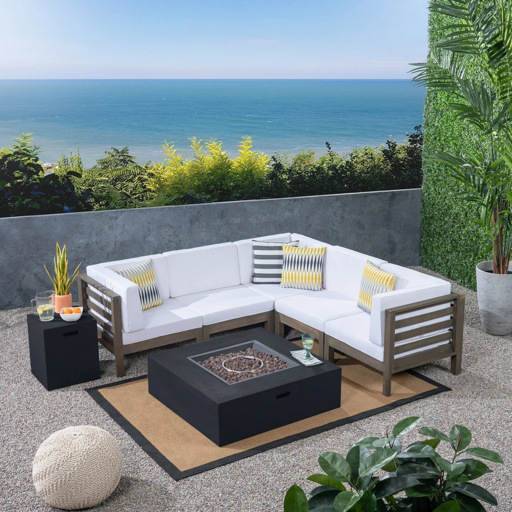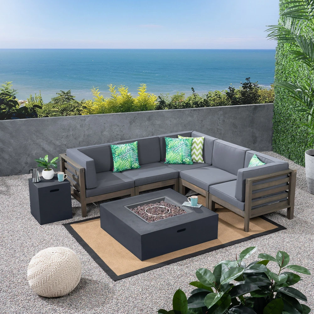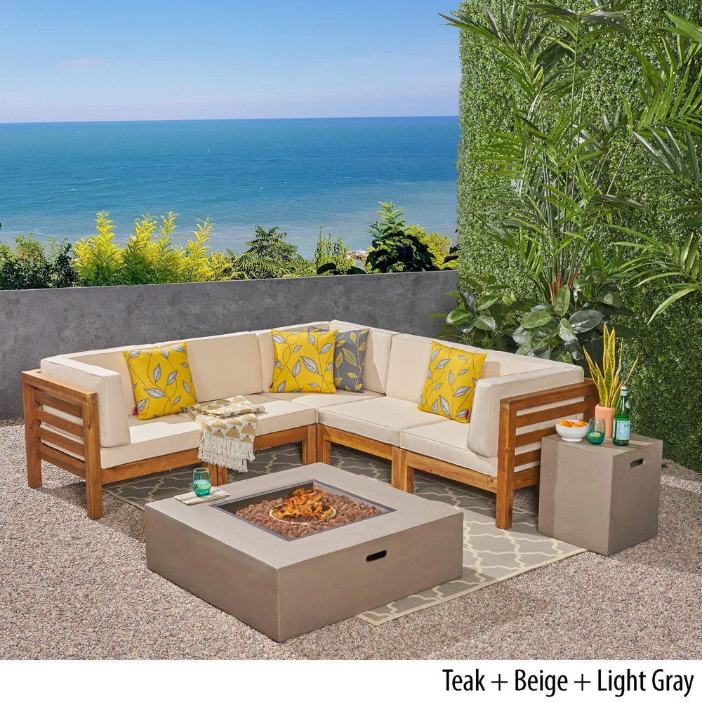 Keep your loved ones warm and toasty long after the sun has gone down. This modular L-shaped sectional sofa set not only offers generous seating space for every guest but it also features an exquisitely modern square fire pit for an extra boost of comfort. With naturally durable acacia wood frames and water-resistant cushions, this set is the perfect centerpiece to bring out good company and even better conversations all summer long. ACACIA WOOD: Our sofa set is made with acacia wood that brings a sleek yet natural look to your space. Perfect for resisting normal wear and tear, this durable hardwood maintains a sturdy foundation that can withstand most outdoor elements and will not darken over time. WATER-RESISTANT CUSHIONS: Our cushions are covered with a non-porous material that makes cleaning any spills a breeze. The seat cushion includes hook and loop fasteners to ensure that you can spend all summer lounging outdoors in comfort. Please note that these cushions are water-resistant and not waterproof. Please do not submerge in water. FIREPIT WITH TANK HOLDER: This fire pit is constructed with lightweight concrete for a minimalistic yet modern vibe. The shape allows easy seating arrangement for you and your guests, providing light and warmth all around during those chilly evenings. This comes with a matching tank holder to keep your propane tank inconspicuous. ASSEMBLY REQUIRED: Some assembly is required for this chat set. All of the instructions and tools needed for assembly are included. No assembly is required for this fire pit. Simply place the lava rocks in the pit without covering the burner, and then plug in your standard size propane tank and enjoy your fire pit. SET INCLUDES: This set includes one right-arm piece, one left-arm piece, two armless pieces, one corner piece, one fire pit, and one tank holder. Includes: One (1) Right-Arm Piece, One (1) Left-Arm Piece, Two (2) Armless Pieces, One (1) Corner Piece, One (1) Fire Pit, One (1) Tank Holder Frame Material: Acacia Wood Cushion Material: Water-Resistant Fabric Fabric Composition: 100% Polyester Fire Pit and Tank Holder Material: Lightweight Concrete Frame Finish: Teak / Gray / Weathered Gray Cushion Color: Optional Fire Pit and Tank Holder Color: Light Gray / Dark Gray Hand-Crafted Details Some Assembly Required Right-Arm Piece Dimensions: 30.25 inches deep x 30.25 inches wide x 26.50 inches high Right-Arm Piece Seat Dimensions: 28.00 inches deep x 28.00 inches wide x 10.25 inches high Right-Arm Piece Arm Height: 26.50 inches Left-Arm Piece Dimensions: 30.25 inches deep x 30.25 inches wide x 26.50 inches high Left-Arm Piece Seat Dimensions: 28.00 inches deep x 28.00 inches wide x 10.25 inches high Left-Arm Piece Arm Height: 26.50 inches Armless Piece Dimensions: 30.25 inches deep x 28.00 inches wide x 26.50 inches high Armless Piece Seat Dimensions: 28.00 inches deep x 28.00 inches wide x 10.25 inches high Corner Piece Dimensions: 30.25 inches deep x 30.25 inches wide x 26.50 inches high Corner Piece Seat Dimensions: 28.00 inches deep x 28.00 inches wide x 10.25 inches high Corner Piece Arm Height: 26.50 inches Fire Pit Dimensions: 40.00 inches deep x 40.00 inches wide x 12.50 inches high Tank Holder Dimensions: 16.25 inches deep x 16.25 inches wide x 20.25 inches high ~~~-1" ~~~