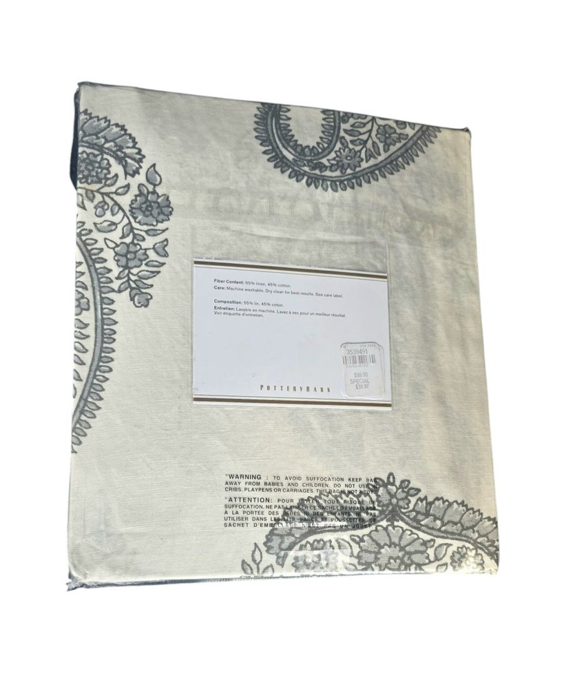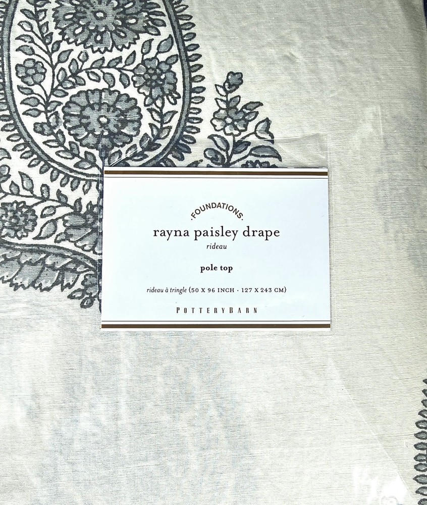 Add a touch of elegance to any room with this beautiful Rayna Paisley Drape from Pottery Barn. The classic style and blue color make it a perfect fit for any decor. Made from a high-quality linen blend, this pole top drap offers a luxurious feel and superior durability. Each panel measures 50 inches in width and 96 inches in length, making it a perfect fit for any standard-sized window. The paisley pattern adds a touch of sophistication and charm to your home. This brand new drap is still in its retail package, ready to be hung and enjoyed.