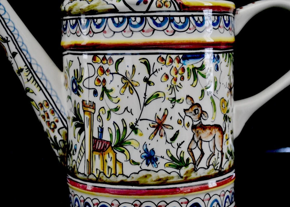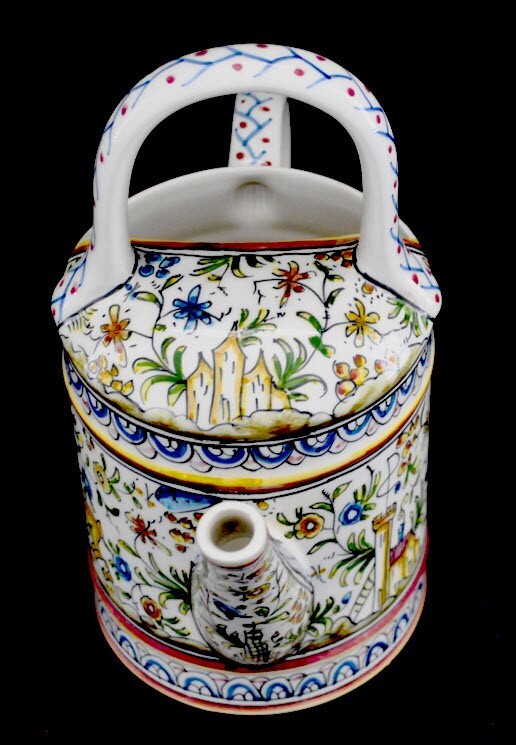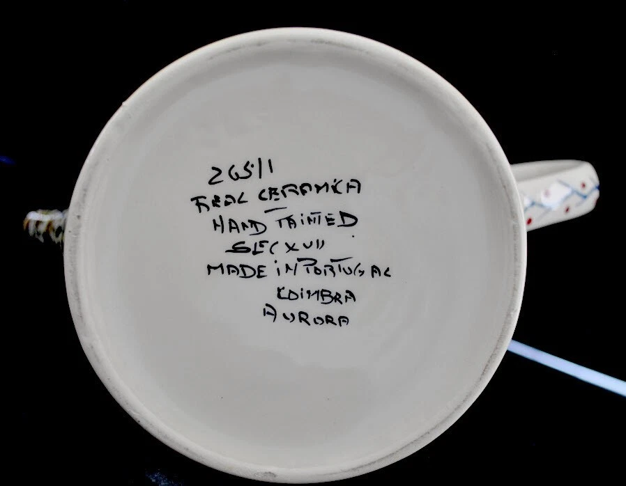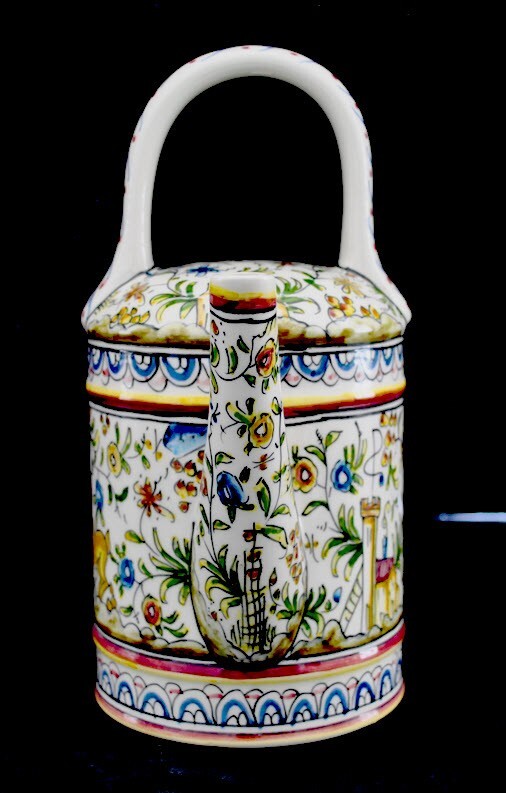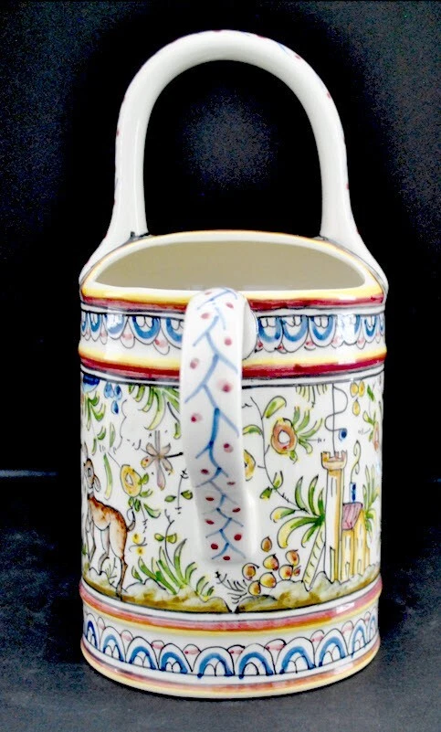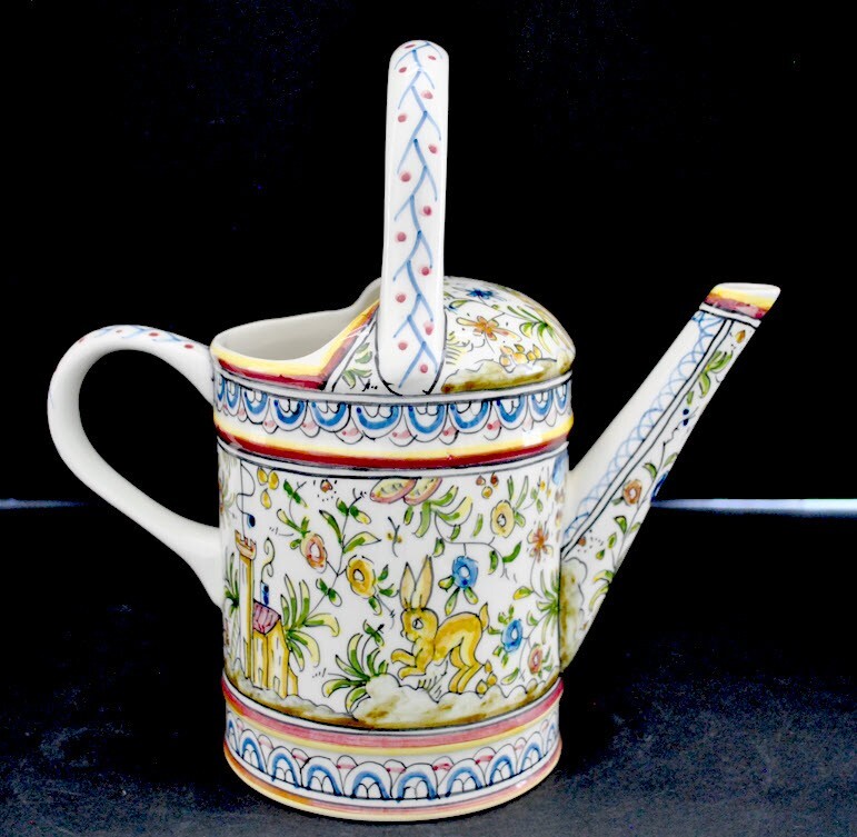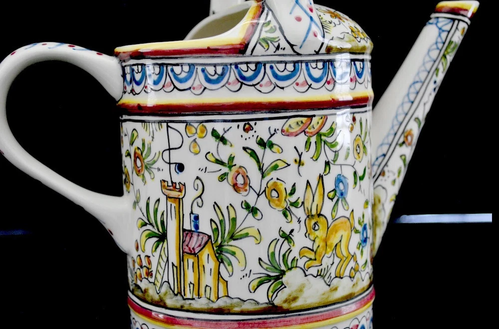 Coimbra pattern, hand made in Portugal Real Ceramica Pitcher shaped as a Watering Can. Adorable and in perfect condition. 10 1/2" high and 10" wide overall. No chips, cracks, discoloration or any othe...
