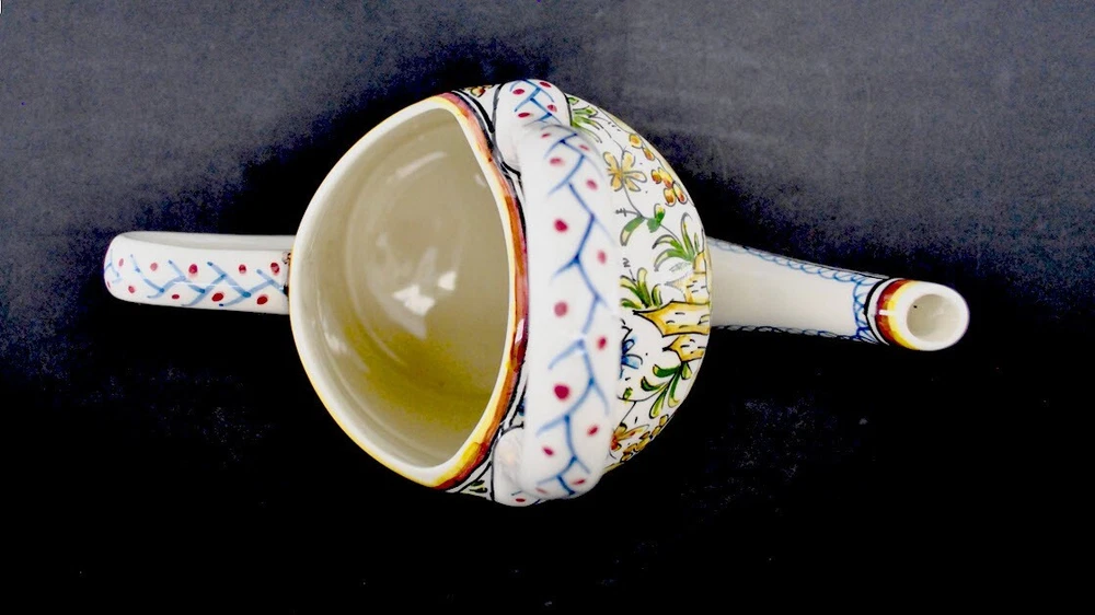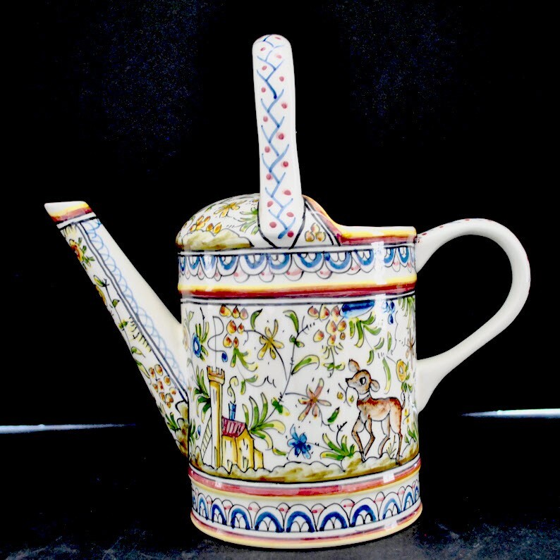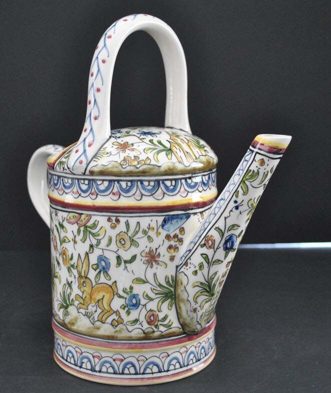 Coimbra pattern, hand made in Portugal Real Ceramica Pitcher shaped as a Watering Can. Adorable and in perfect condition. 10 1/2" high and 10" wide overall. No chips, cracks, discoloration or any other flaws.