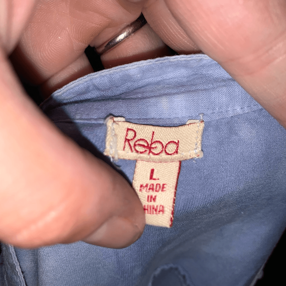 Reba blue tie dye, pintuck, lace cutout hem, flowy, boho blouse. Pairs well with jeans or shorts. In good, used condition. Approximately 22 inches from armpit to armpit, 26 inches long. From a pet and smoke free house. Happy to bundle!