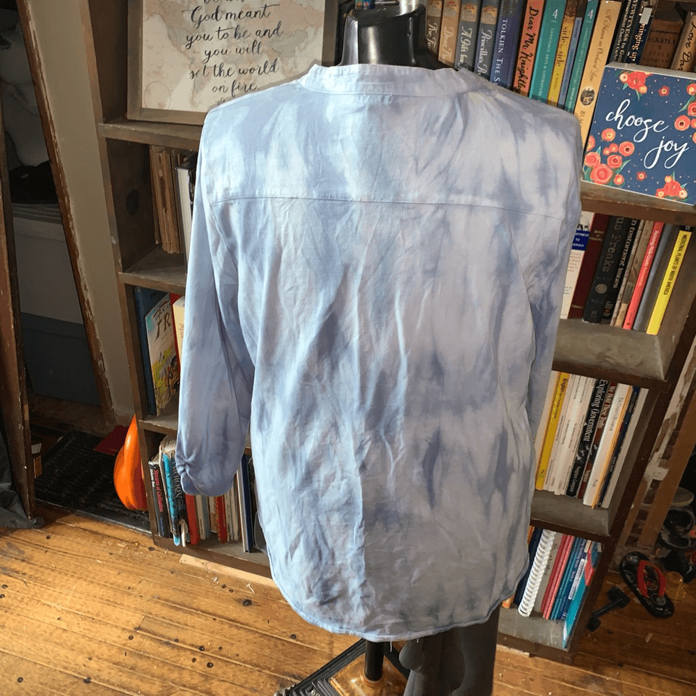 Reba blue tie dye, pintuck, lace cutout hem, flowy, boho blouse. Pairs well with jeans or shorts. In good, used condition. Approximately 22 inches from armpit to armpit, 26 inches long. From a pet and...