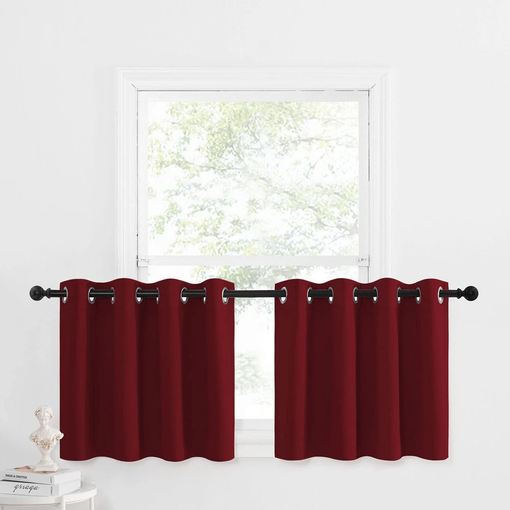 Energy-saving! Grommet top! What more could GROMMET KITCHEN CURTAIN VALANCES possibly offer? This panel saves on energy costs by blocking light; provides a modern look. WELL MADE: All sizes drape feature 1.6-inch inter-diameter round silvery grommets for easy hanging on decorative rods. With super soft and heavy innovative triple-weave fabric, you will fall in love with such quality fabric. 1.2" header (measured from curtains' top edge to the ring top) and 24" length (measured from ring top to curtains' bottom edge) make the curtains look nice when you install them. GOOD PERFORMANCE: Impedes up to most of light and UV light, lowers outside noise up. Privacy protection. Suitable for kitchen, Infant room, basement, bedroom, living room, and other windows, provide you with a good sleep environment. offer a variety of sizes and colors for you, before you hang the curtains, measure your pole width and the length of the window, then choose the right size. EASY CARE: The curtain is made to last. Machine washable in cold water, tumble dry. Quick iron or steam clean when needed. ABOUT Find store, various styles of the valances, the blackout curtains, the sheer curtains that can match your home decoration. Ready Made: The Blackout Short Curtains come in 2 panels. 8 silver rings with a diameter of 1.6 fit easily with standard curtain rods. Each panel is W52 x L24 + 1.2" header(The whole Length is 31.2" from the top to the bottom of the curtain). Innovative Fabric: Soft and heavy blackout drape panels adopt triple weave technology. No coating, no formaldehyde, fade-resistant, skin-friendly, privacy protection, creates a harmonious environment. The same materials are on both sides. Stylish Design: Neutral colors simple but elegant. Short valance curtain control and balance sunlight come into your room and silver rings at the top can be pulled freely on the pole, is a good choice for home curtains Smart Function: Triple weave blackout fabric block summer heat and strong sunlight out. These curtain drapes provide full privacy and are convenient for small windows of the kitchen, bathroom, bedroom, and basement. Easy Care: Good quality finishing will withstand years of use. Machine washable and Wash the water temperature below 86F. Mild detergent no bleaching. Low-temperature ironing. Don’t use sharp things scratching curtains