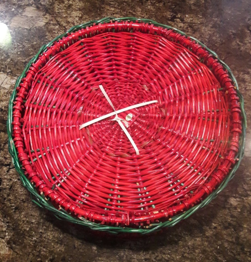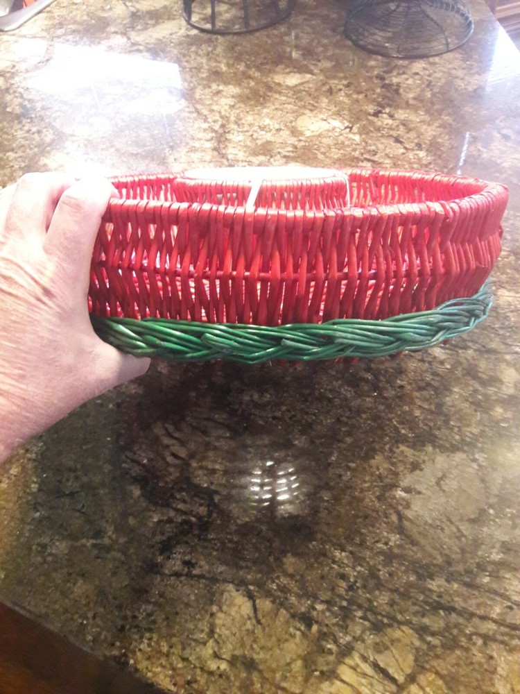 Wicker Chip Serving Basket & Dip Bowl Red Green Tray. 16.5" Diameter 4" High Beautiful green and red wicker with white porcelain serving bowl 5" diameter Would go well for servings at Christmas or Cin...