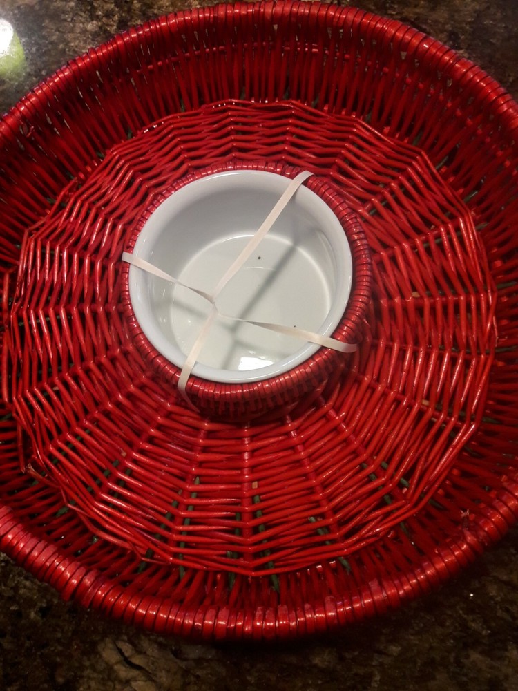 Wicker Chip Serving Basket & Dip Bowl Red Green Tray. 16.5" Diameter 4" High Beautiful green and red wicker with white porcelain serving bowl 5" diameter Would go well for servings at Christmas or Cinco De Mayo Party