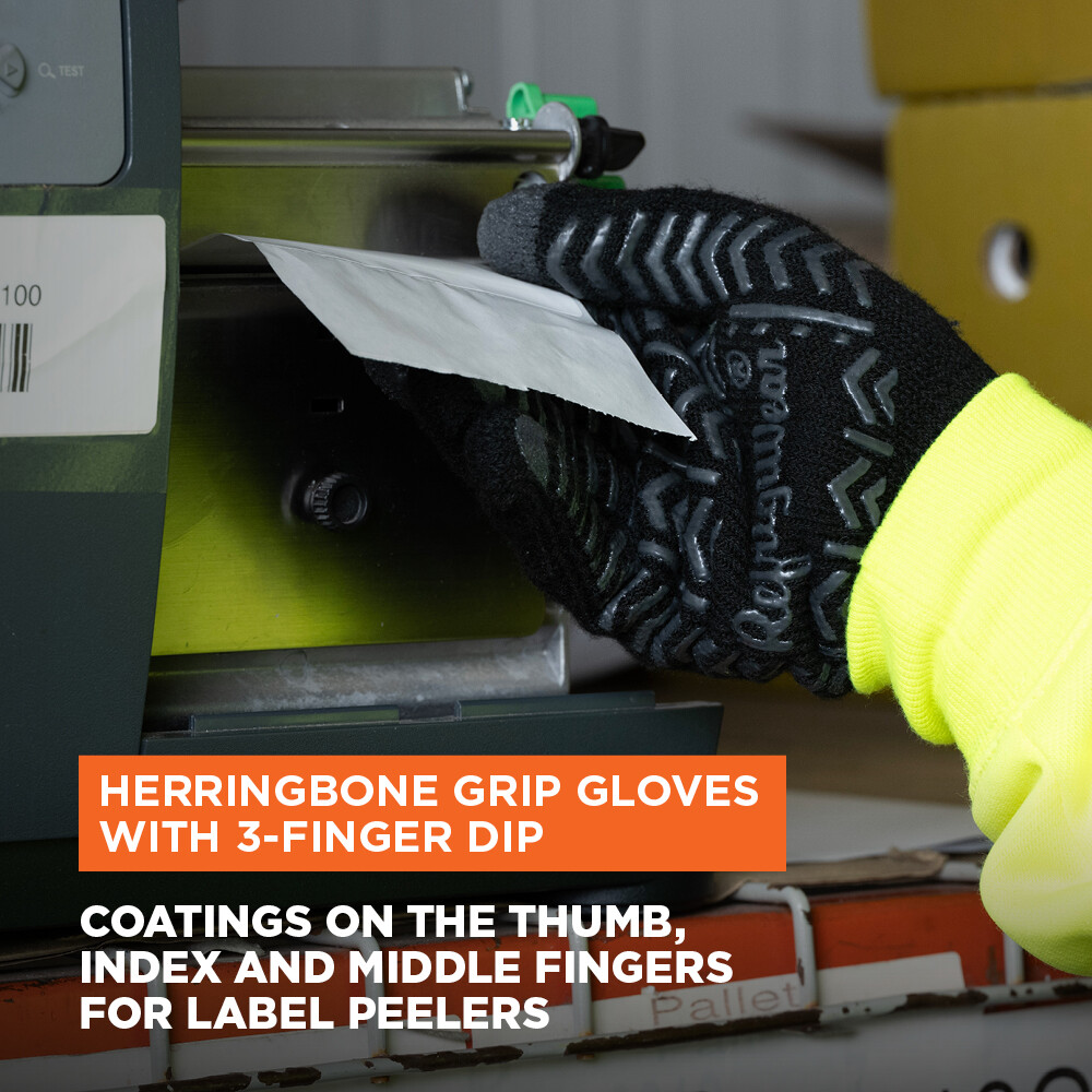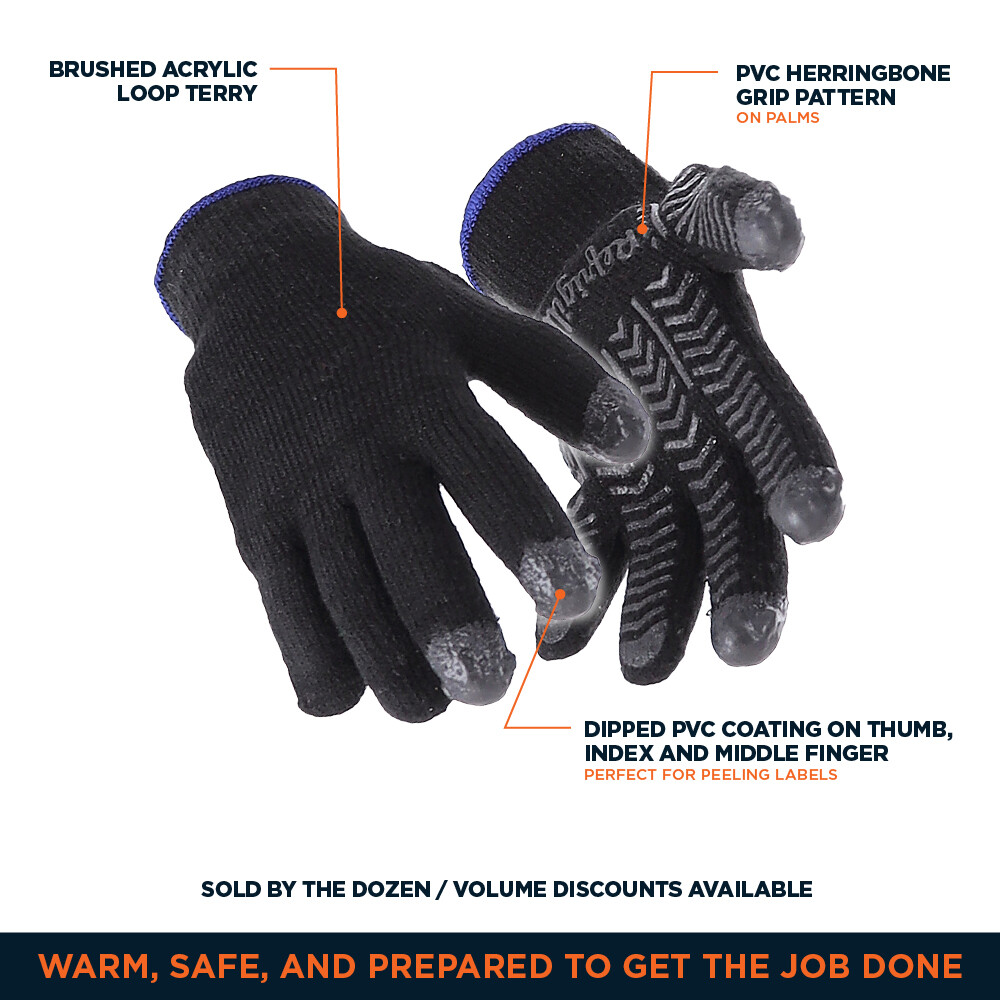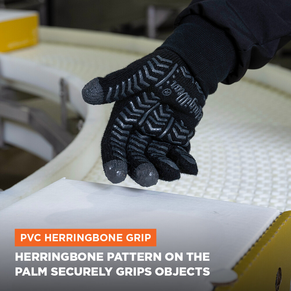 Want to get the upper-hand at work? Look no further than these Herringbone Grip Gloves with a three-finger dip. Designed with a PVC coating on the thumb, index, and middle finger for label-peeling efficiency, and a herringbone grip pattern on the palms for an ironclad hold, these gloves are a cold temp work wonder. Made from brushed acrylic loop terry, they provide both warmth and flexibility. These PVC-coated work gloves are ready to tackle any warehouse challenge with ease. Want to get the upper-hand at work? Look no further than these Herringbone Grip Gloves with a three-finger dip. Designed with a PVC coating on the thumb, index, and middle finger for label-peeling efficiency, and a herringbone grip pattern on the palms for an ironclad hold, these gloves are a cold temp work wonder. Made from brushed acrylic loop terry, they provide both warmth and flexibility. These PVC-coated work gloves are ready to tackle any warehouse challenge with ease. Dipped PVC coating on thumb, index and middle finger perfect for peeling labels PVC herringbone grip pattern on palms Brushed acrylic loop terry Sold by the dozen Click Here for Size Chart
