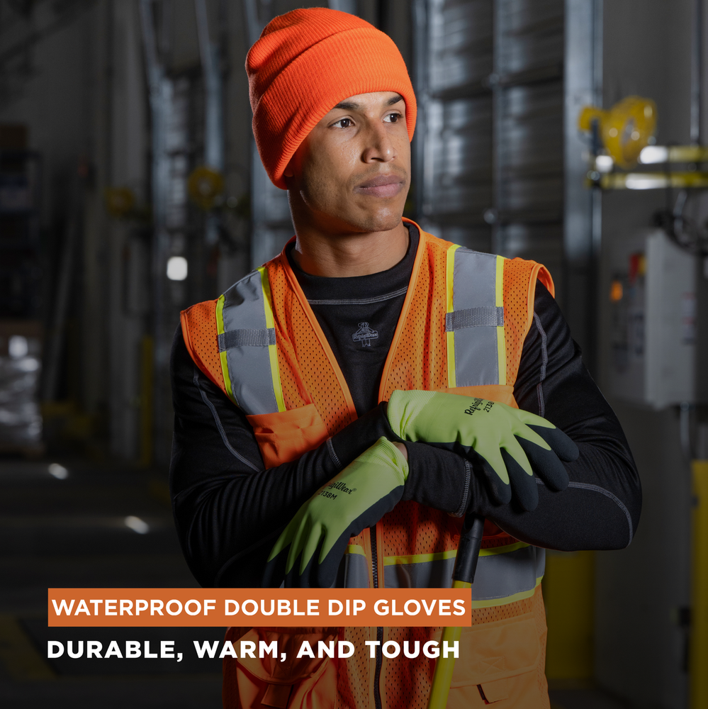 Maintain your grip in wet, slippery conditions with the Waterproof Double Dip Glove. With a 15-gauge polyester outershell covered in latex and coated with a sandy latex finish, you’ve got a grip that doesn’t slip in this warm work glove. Plus, single-layer construction keeps your hands warm and dry without adding bulk in these maximum dexterity knit work gloves. Maintain your grip in wet, slippery conditions with the Waterproof Double Dip Glove. With a 15-gauge polyester outershell covered in latex and coated with a sandy latex finish, you’ve got a grip that doesn’t slip in this warm work glove. Plus, single-layer construction keeps your hands warm and dry without adding bulk in these maximum dexterity knit work gloves. WORK GLOVES FOR MEN & WOMEN: Get serious protection in wet environments with our double-dipped gloves. Made to work in tough conditions, each heavy-duty working glove features a rugged outer shell for maximum protection and comfort. WATERPROOF GLOVES: Whether you’re facing rain, wind, or a freezing warehouse, these waterproof work gloves will keep out cold-weather elements. The super-durable 15-gauge polyester shell effectively keeps water out so you can focus on the job. EASY TO MOVE YOUR FINGERS & HANDS: Keep your hands protected no matter the conditions. Our durable utility gloves will last through years of indoor and outdoor use. The single-layer construction keeps your hands warm and dry without adding bulk. EASY TO GRIP: Simply pull on these latex-coated gloves for instant hand protection when it’s time for cold, wet work. These gloves feature a double-dip sandy latex hand coating so you can always have a sure grip, even when the environment turns wet and slippery. REFRIGIWEAR: Since 1954, RefrigiWear has innovated cold-weather gear that helps you focus on your job while you maintain warmth and safety. Let us help you own the cold with our line of insulated and thermal clothing designed to protect you from freezing conditions. Click Here for Size Chart
