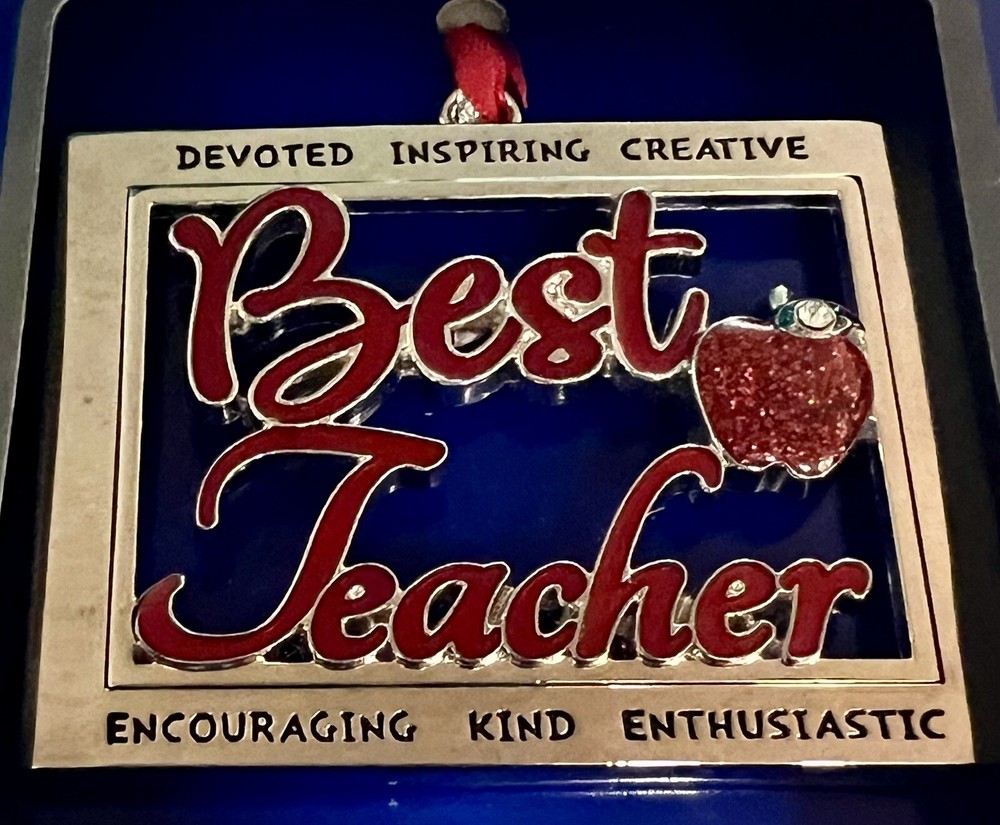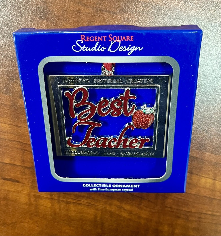 Best gifts for teachers!!! New in box set of 2! Stunning!! Regent Square 'Best Teacher’ Christmas Collectible Ornament Devoted, Inspiring, Creative, Encouraging, kind, Enthusiastic Red Apple What a great way to show your favorite teacher just how much you appreciate his/her being your teacher. Ornament for Teachers. Metal with sparkling enamel finish. European crystals. "Best Teacher" sentiment Set of 2 unopened New in box!