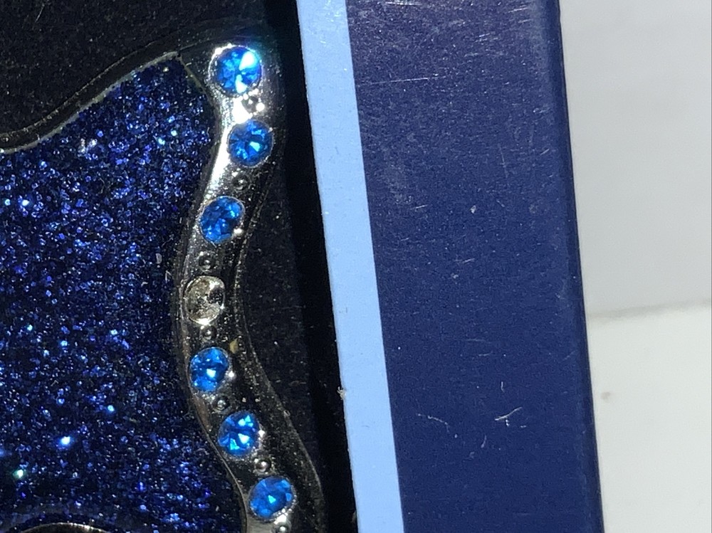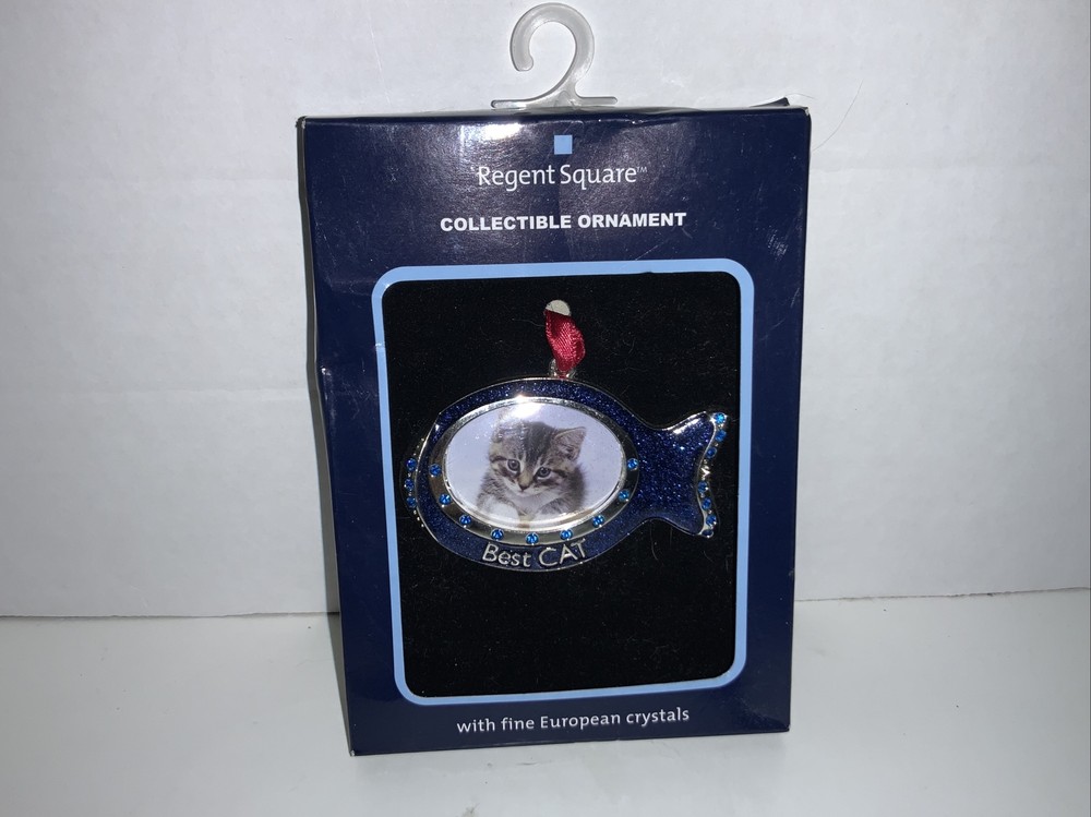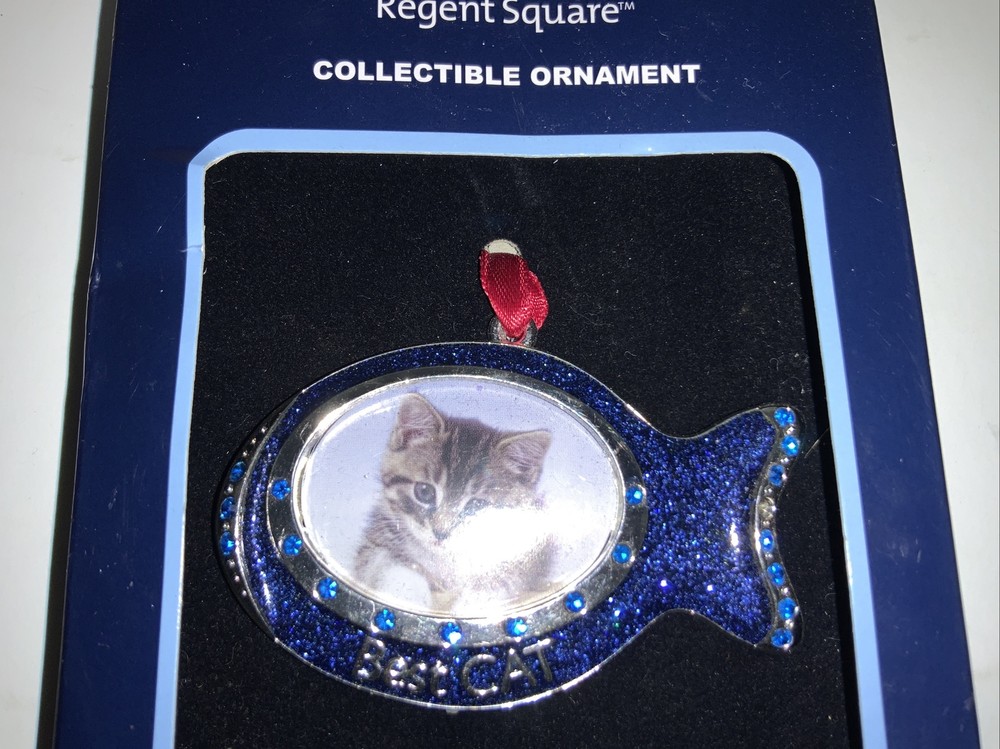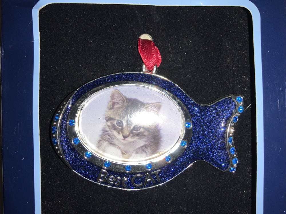 Regent Square Studio Design Best Cat Ornament Fish Shaped Photo Frame. Small photo. 1.5” Long x 1.25” High Blue enamel with European Crystals. 1 blue stone missing on tail. Shown in close up photo. Perfect for a small picture of your cat. Will make a perfect stocking stuffer Or a gift for a cat lover. Please look at photos, local pick up is available in Fort Worth