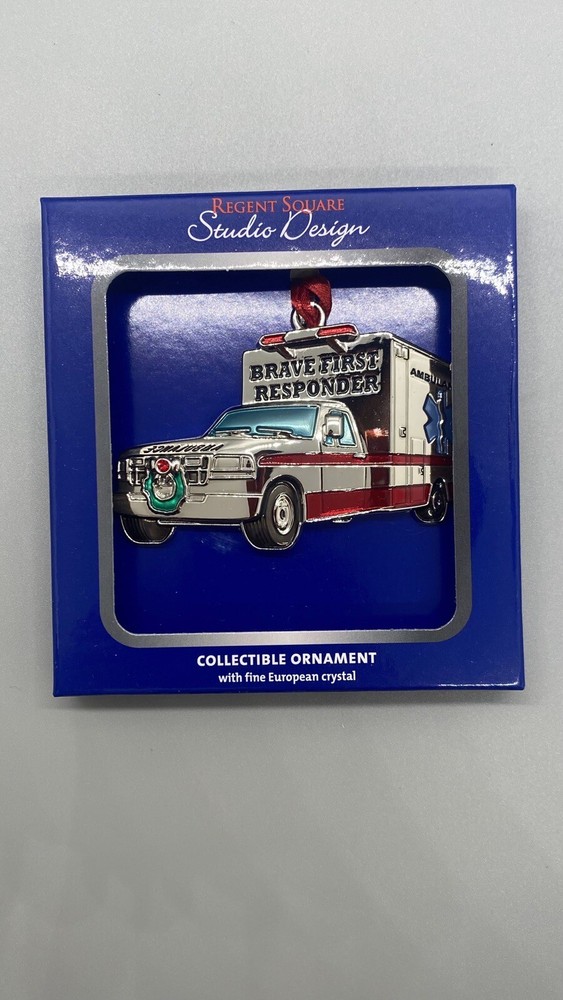 Brave First Responder Metal Christmas Ornament Ambulance/EMT Collectible With Fine European Crystal Regent Square Studio Design New in Box.