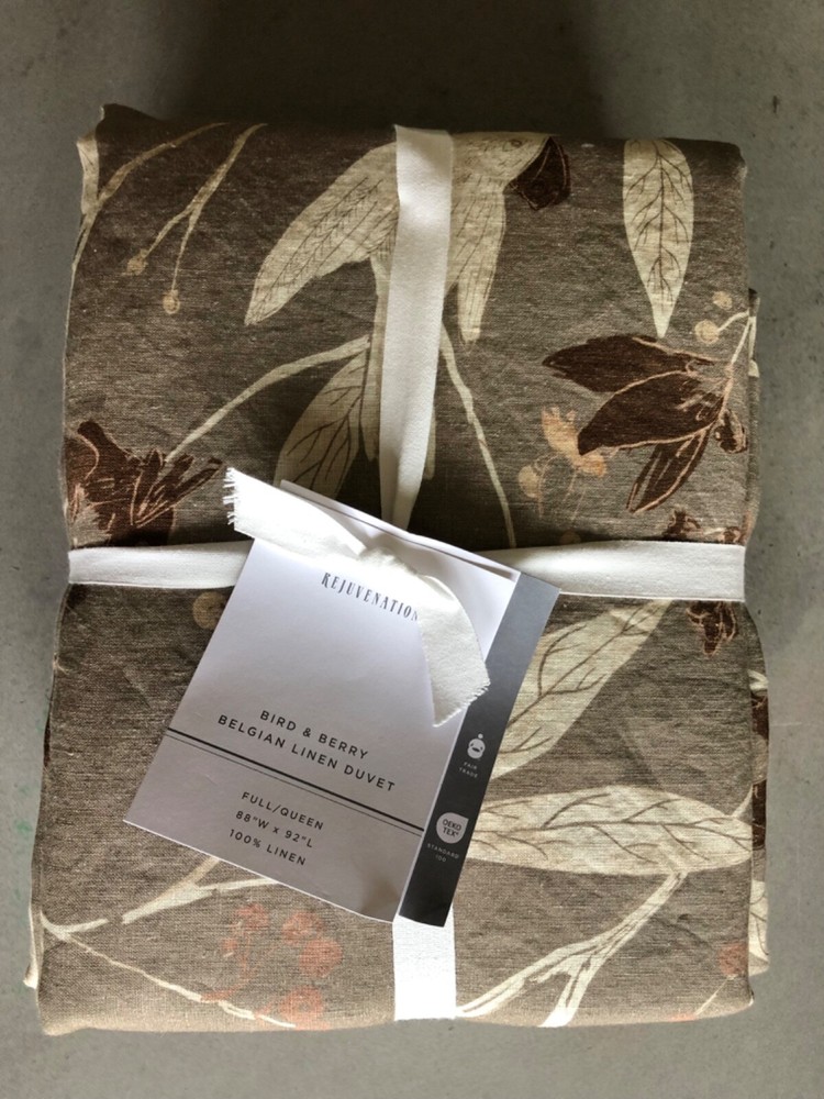 * AMAZING COLOR & PATTERN * Rejuvenation (Part of Pottery Barn & Williams Sonoma) Bird & Berry Print Belgian Linen Duvet Cover FULL or QUEEN Size. Amazing PATTERN AND COLORS !! This is probably the most beautiful and High Quality Belgian Linen we have ever seen!!! The Print on the Belgian Linen is absolutely incredible! Woven from premium quality 100% European flax Breathable and absorbent, perfect option for any season. Hidden ties prevent bunching and keep it in place. Button closure Four interior corner ties keep it in place. Made in a Fair Trade Certified factory, Classic Feel and Color. Perfect! *** A NOTE ABOUT BUY IT NOW *** The Buy It Now price is only available when there are no bids. Once a bid has been placed, the Buy It Now price disappears, and now the item will be sold to the highest bidder - even if that price is higher then the original Buy It Now price. This is not our policy, it is an eBay policy we cannot change So, be aware - if you want the item, consider Buy It Now
