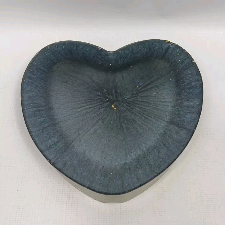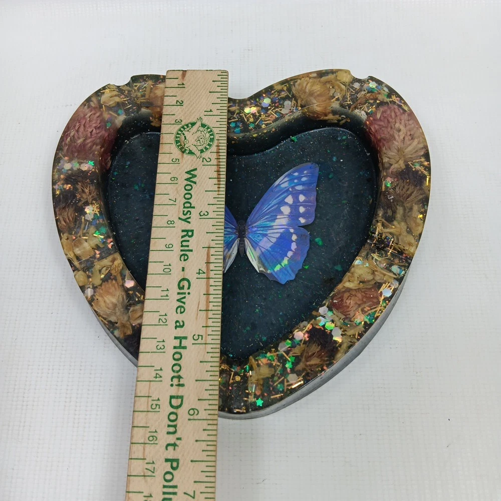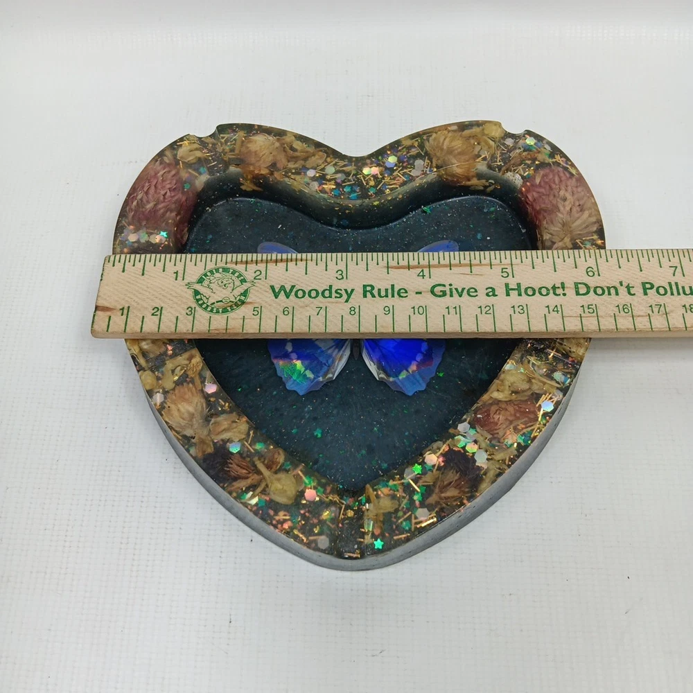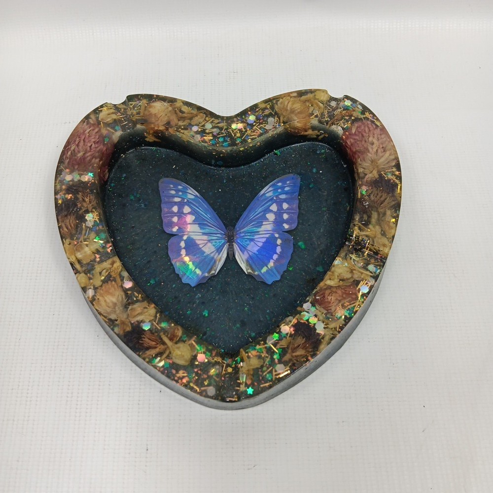 This vintage trinket dish/ashtray is a beautiful addition to any collection. The heart-shaped design with a blue butterfly adds a touch of mid-century modern style to any decor. The dish is made of resin and has five slots for storing small items or serving as a fruit bowl. The brand is unmarked, and the origin is Japan. The dish is a vintage original and was produced using a studio crafted technique. It is perfect for anyone who loves hearts as a theme and is looking for a unique piece of pottery.