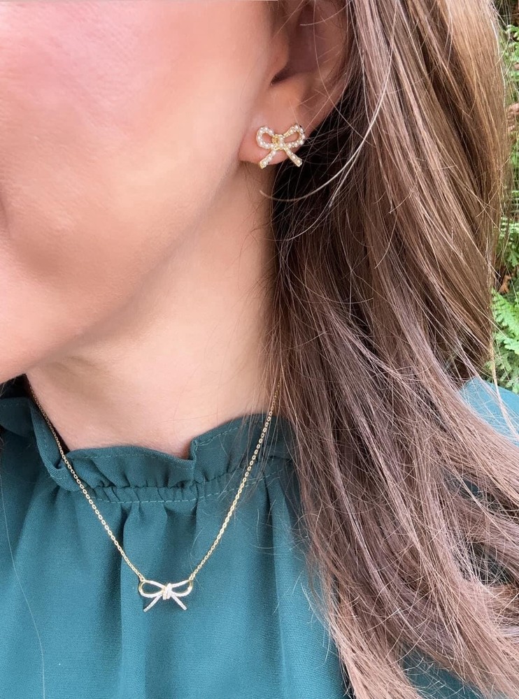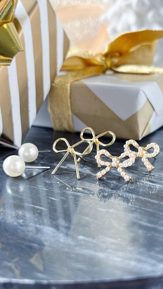 Add a touch of elegance to your every day look with this set of 2 pairs of bow shaped gold stud and a single pearl stud earrings from Park Lane. The earrings are made of yellow gold plated brass with a round shape and post closure. The main stone is a lab-created white pearl with a round shape and a diameter of 1/8 - 1/2 inch. The earrings are nickel-free surgical steel posts. These stunning earrings are perfect for any occasion and make a great addition to any jewelry collection. The beauty, family & friends theme of the earrings makes them a great gift for loved ones.