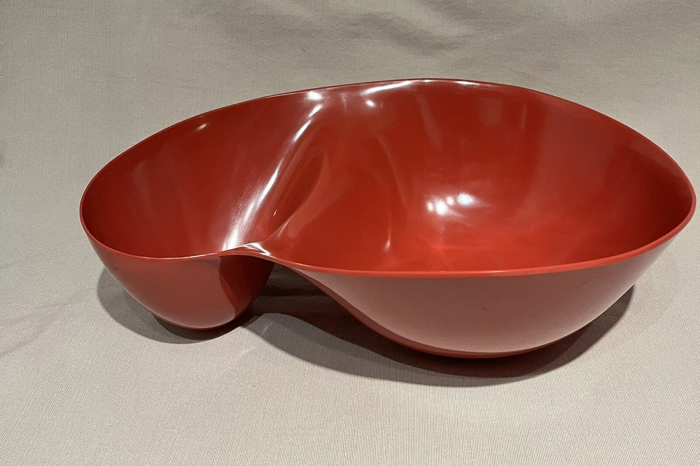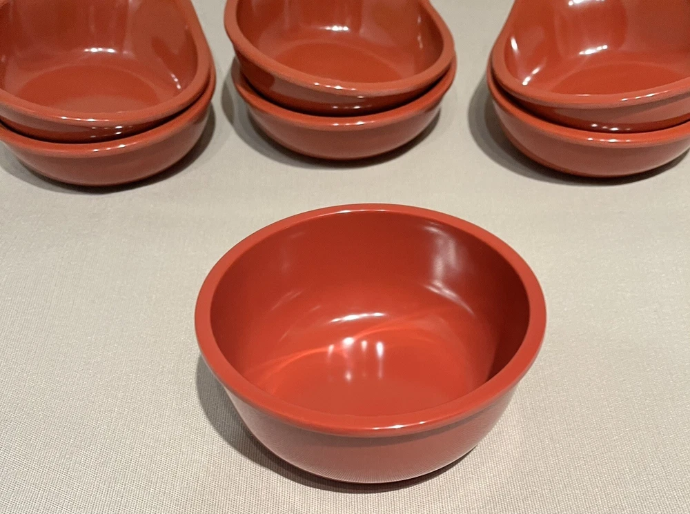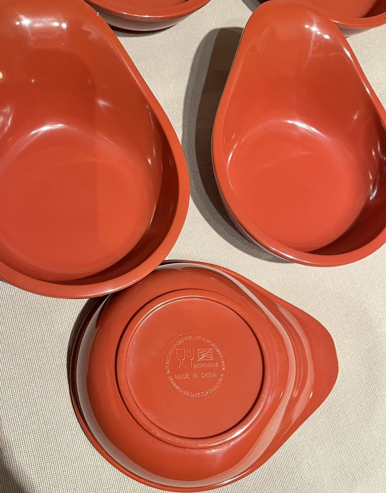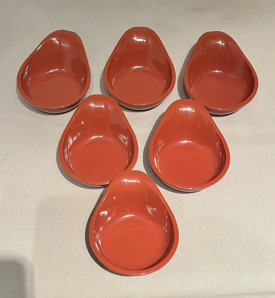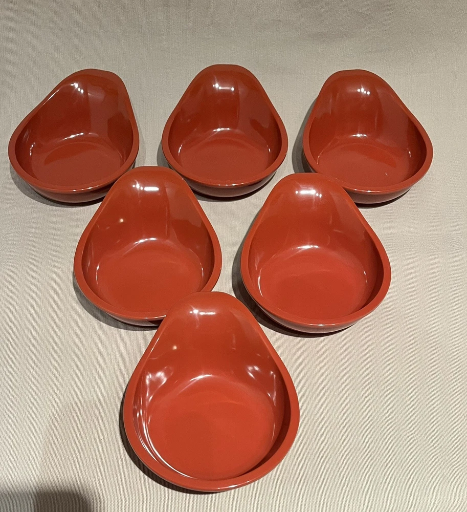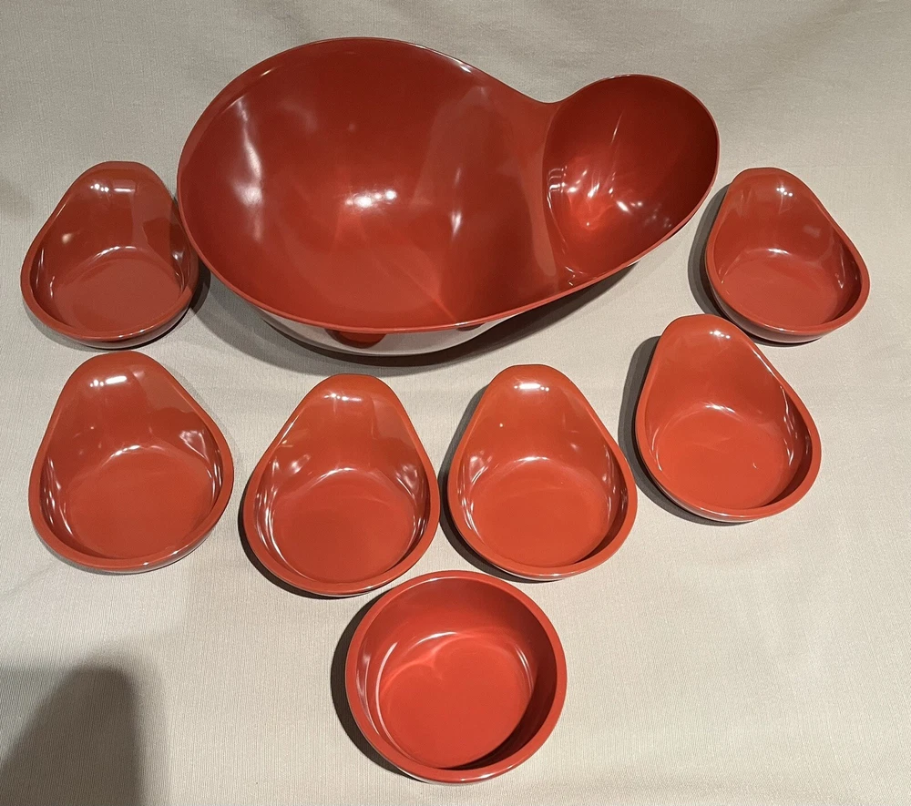 Retro chip'n dip plastic kidney shape, 6 Salad Bowls, One 4-1/2” Bowl, 8 Pieces. Great condition with no damage- preowned and used. Plastic looks and feels like melamine but not marked as such. Ships USPS mail