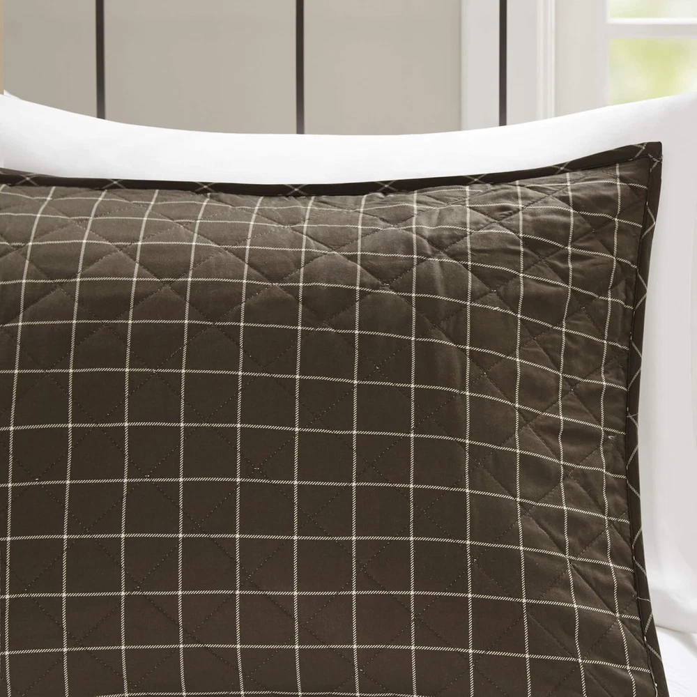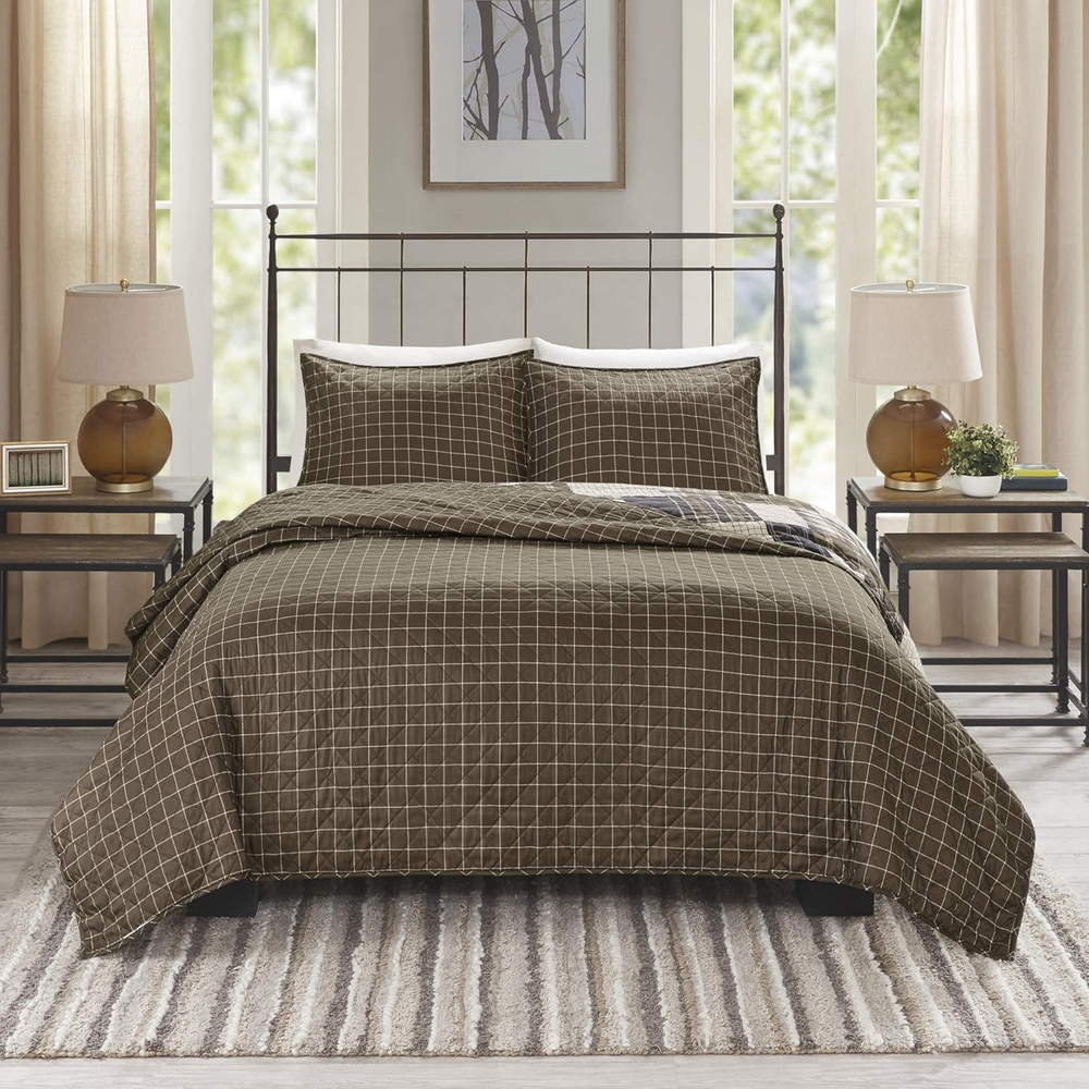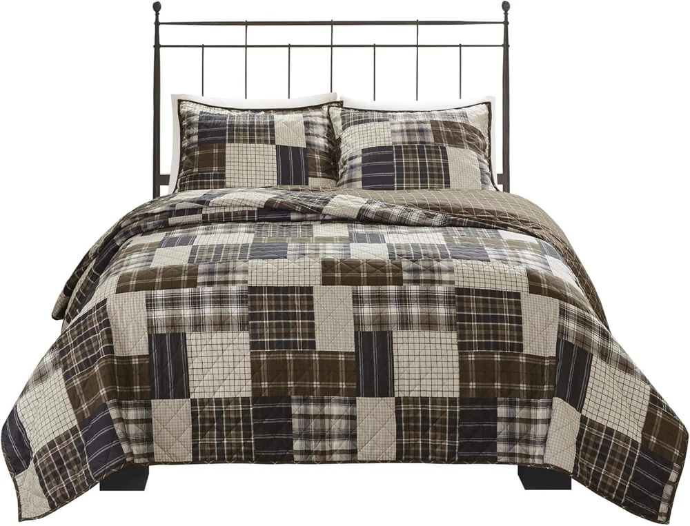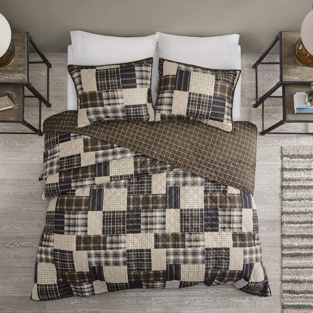 100% Microfiber Rich in color, the Madison Park Timber 3 Piece Reversible Printed Coverlet Set offers a lodge style update for your bedroom. REVERSIBLE Coverlet offers 2 in 1 value package for you to switch up your bedroom décor whenever you like. Naturally LIGHTWEIGHT & BREATHABLE COVER PERFECT FOR SUMMER use or layer it on for cold weather. Set includes: 1 Coverlet:90"W x 90"L, 2 Standard Shams:20"W x 26"L Care instructions: Machine Washable Rich in color, the Madison Park Timber 3 Piece Reversible Printed Coverlet Set offers a lodge style update for your bedroom. The reversible rustic coverlet and shams features a patchwork print, in shades of brown and beige hues, that flips to a clean and inviting all-over plaid print on the reverse. Zipper closures on the reversible shams create a clean finished edge, while cotton-rich filling and channel quilting provides a soft hand feel. Machine washable for easy care, this reversible coverlet set brings a warm cabin look to your bedroom décor.